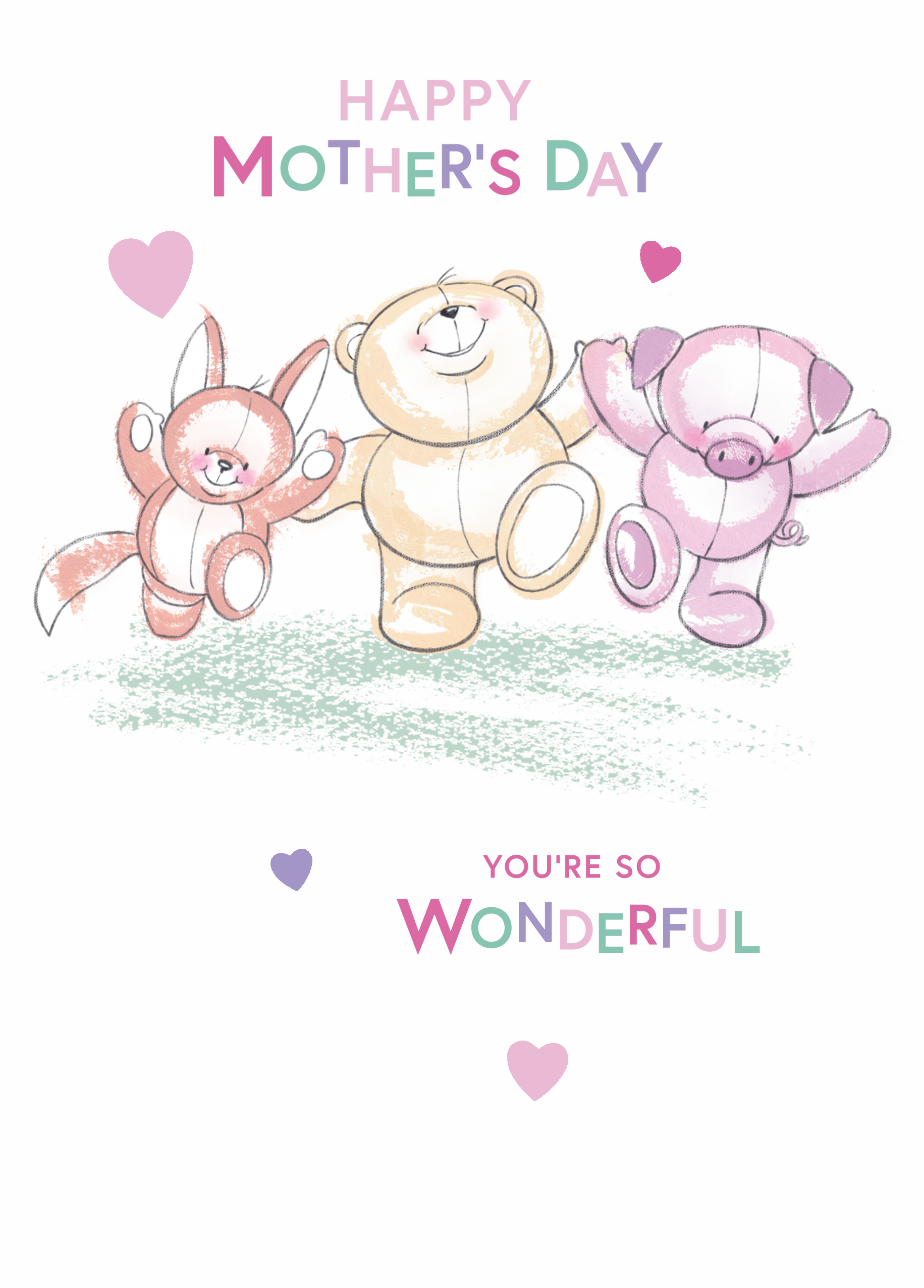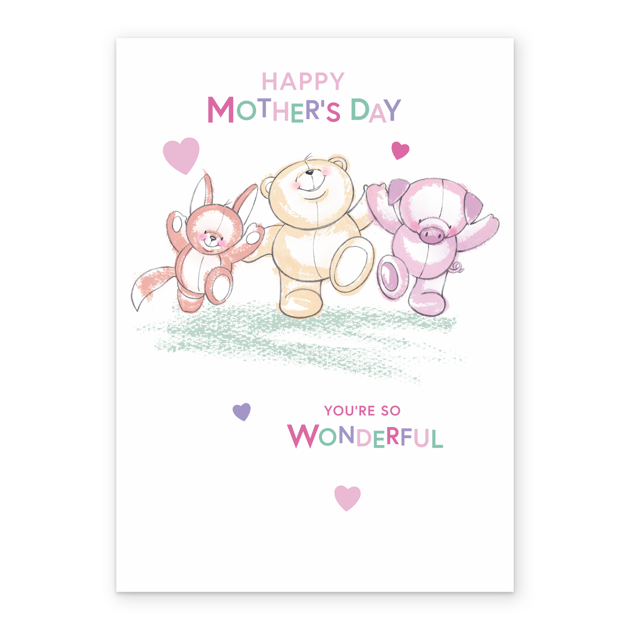 Printed on premium-quality board, this card features a cute Forever Friends fox, bear and pig, holding hands and joyfully skipping to celebrate your wonderful mum, on a white background adorned with colourful hearts, with the message 'Happy Mother's Day You're So Wonderful', and comes complete with a co-ordinating white envelope.