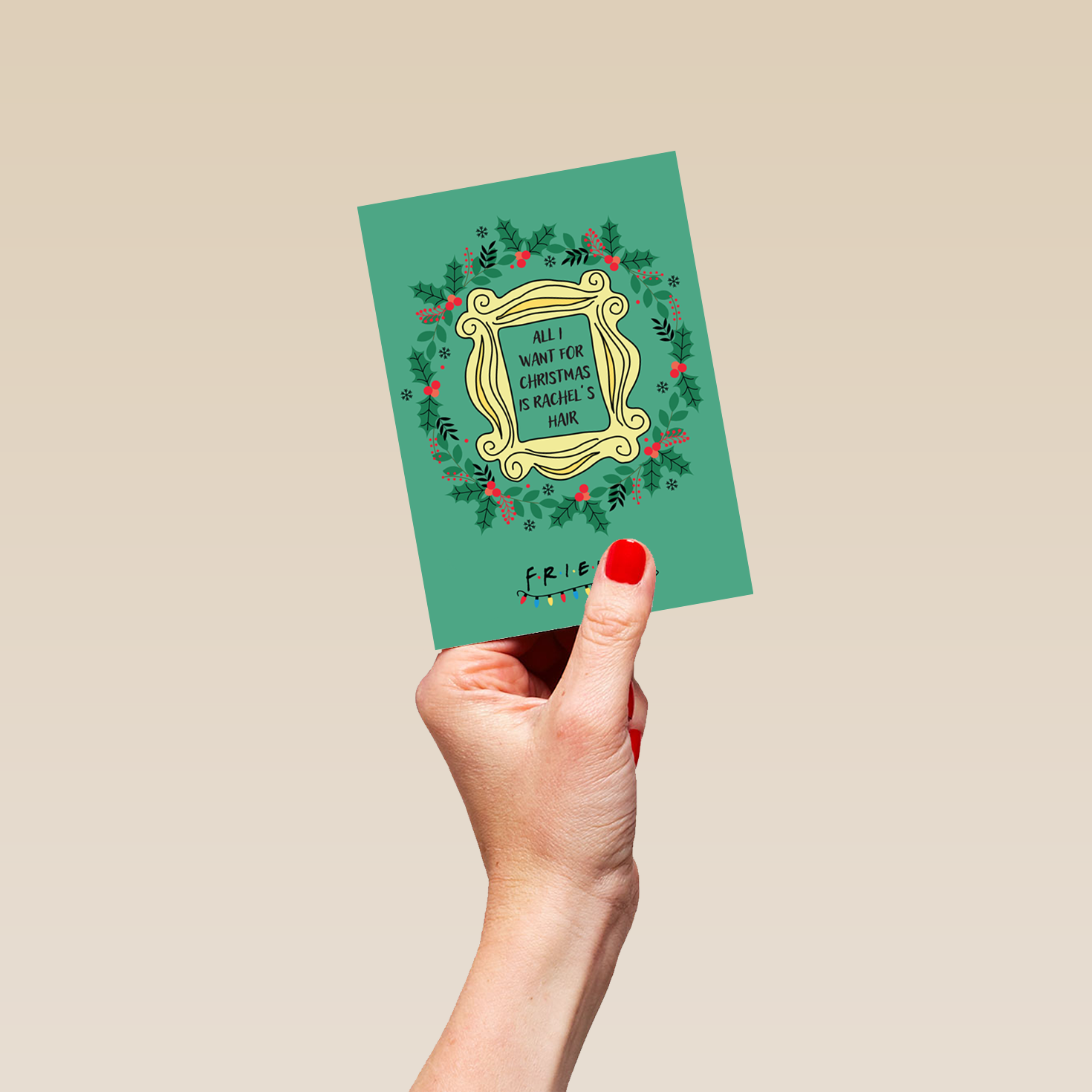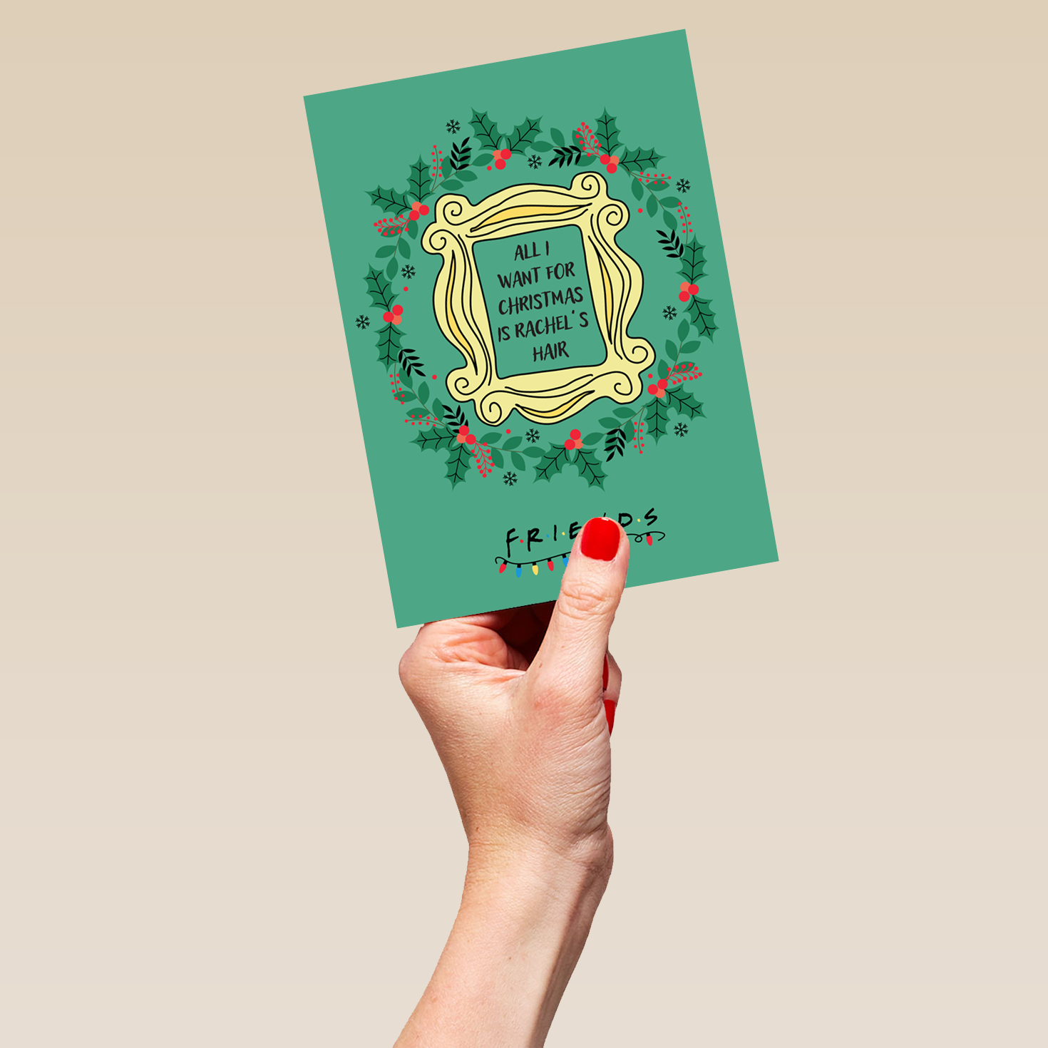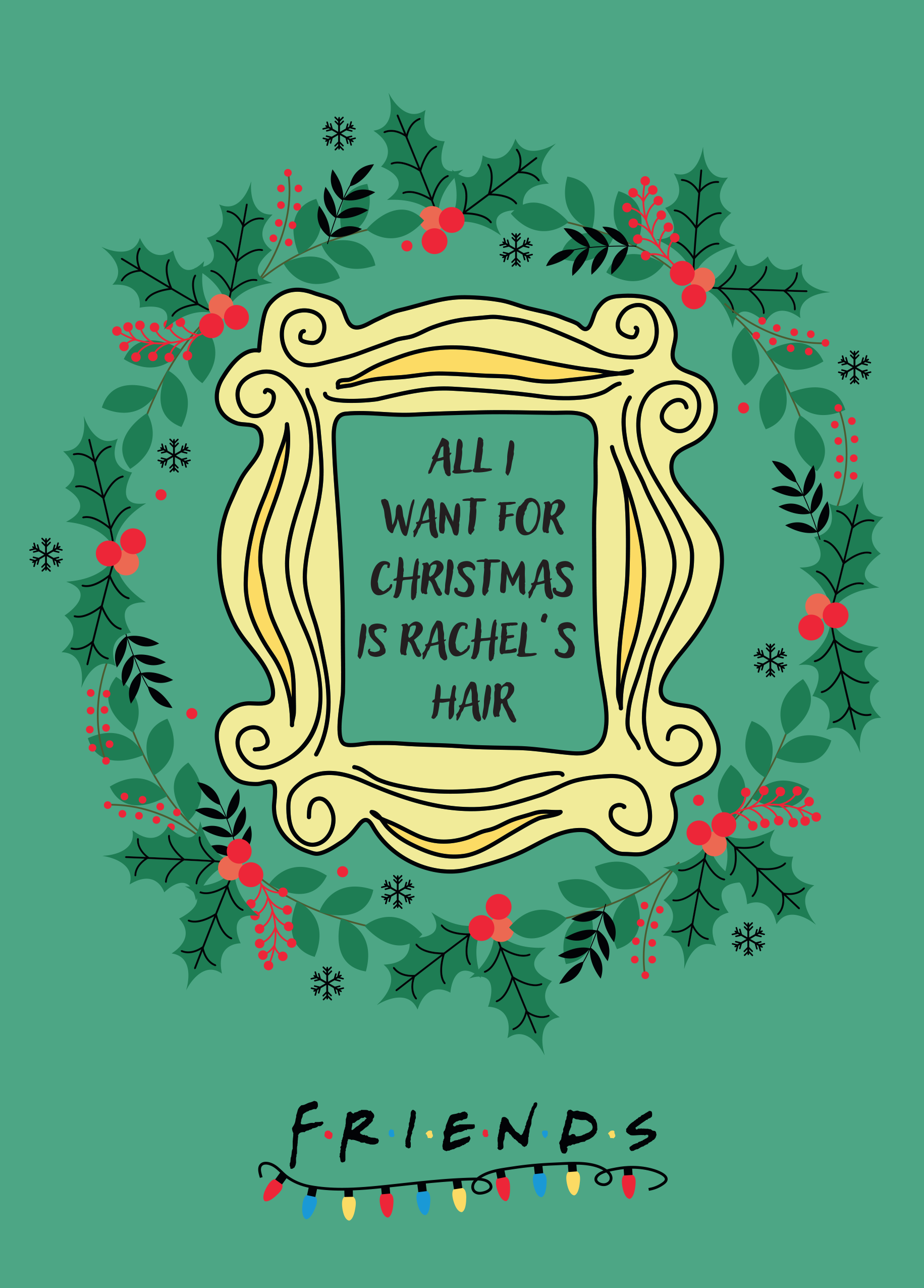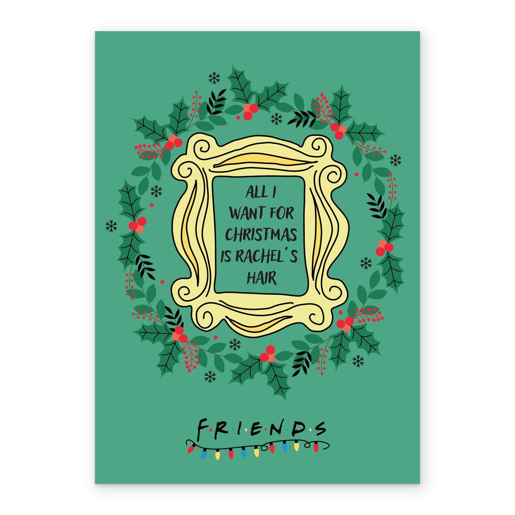 Printed on premium-quality board, this card features the iconic Friends peephole frame with a Christmas wreath, with the message 'All I want for Christmas is Rachel's hair', and comes complete with a co-ordinating white envelope.