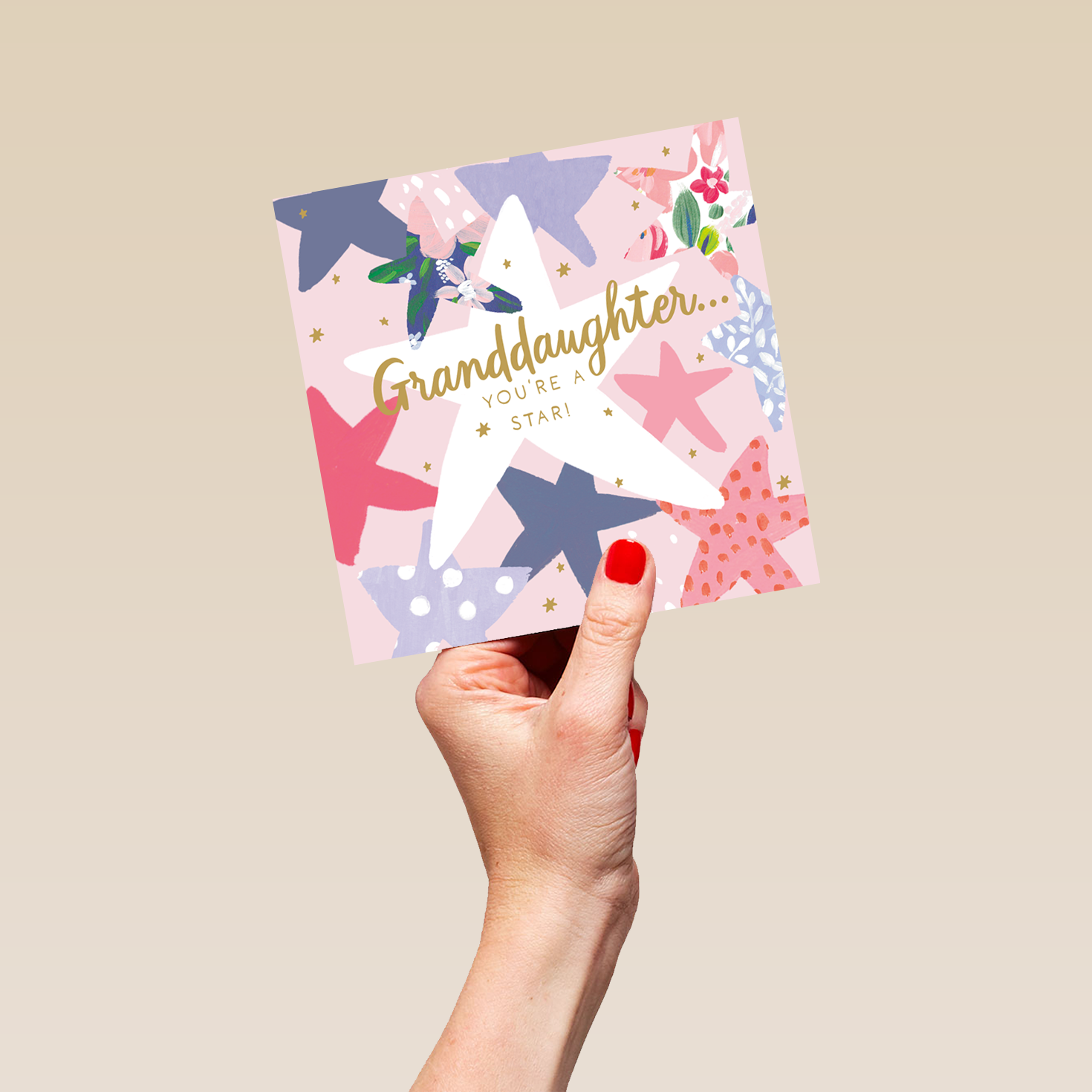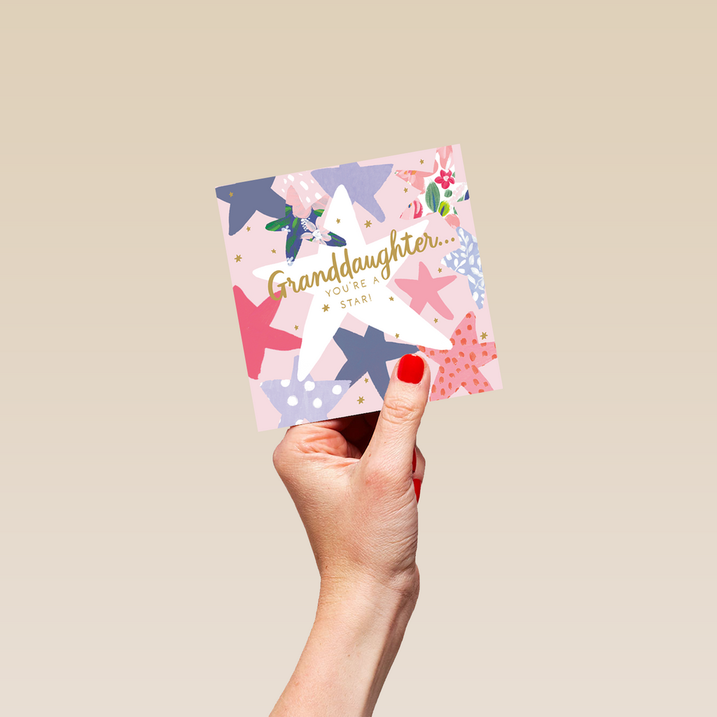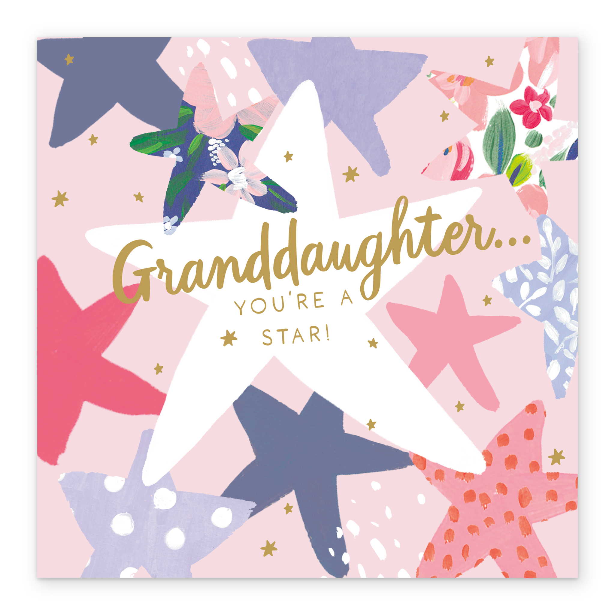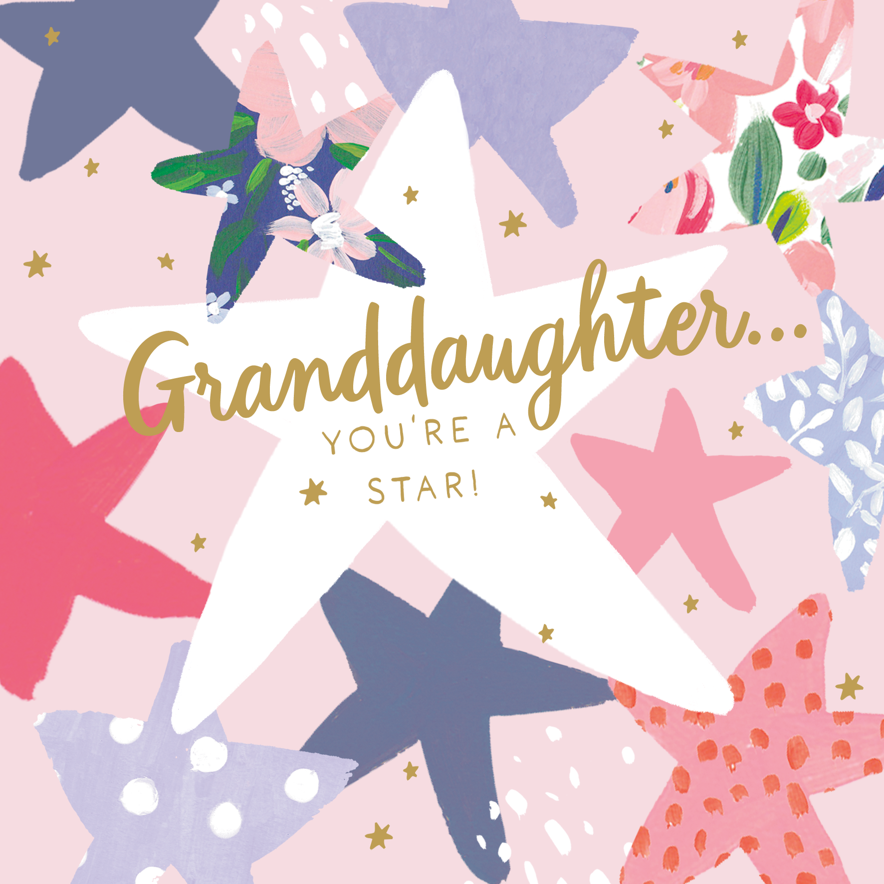 Printed on premium-quality board, this card features a range of illustrated stars with different patterns, with the message 'Granddaughter... You're a Star!', and comes complete with a co-ordinating white envelope.