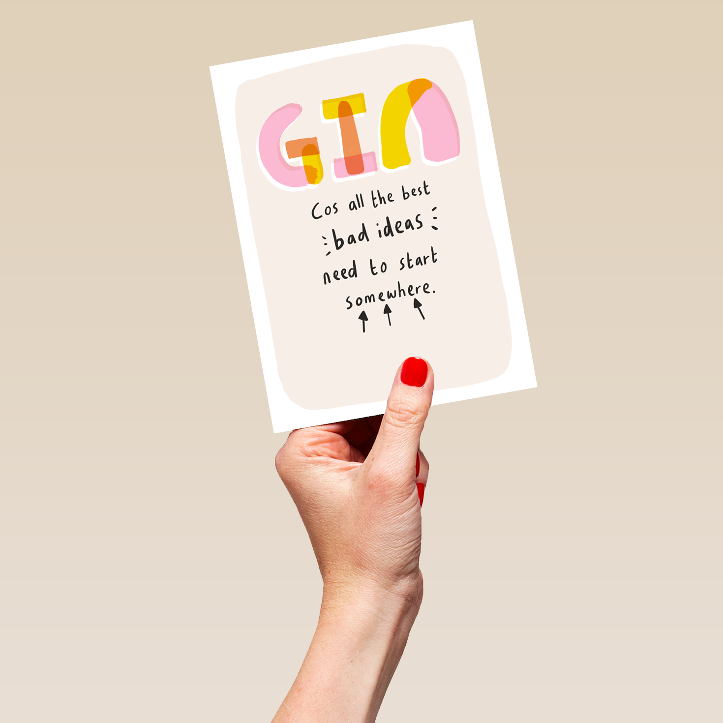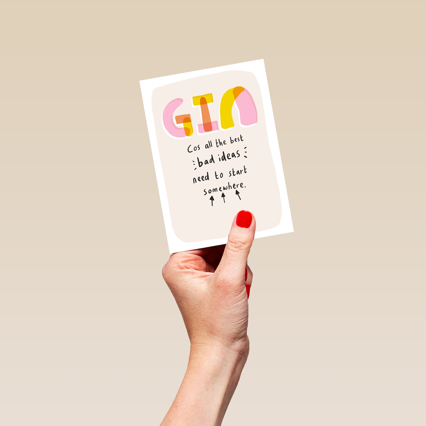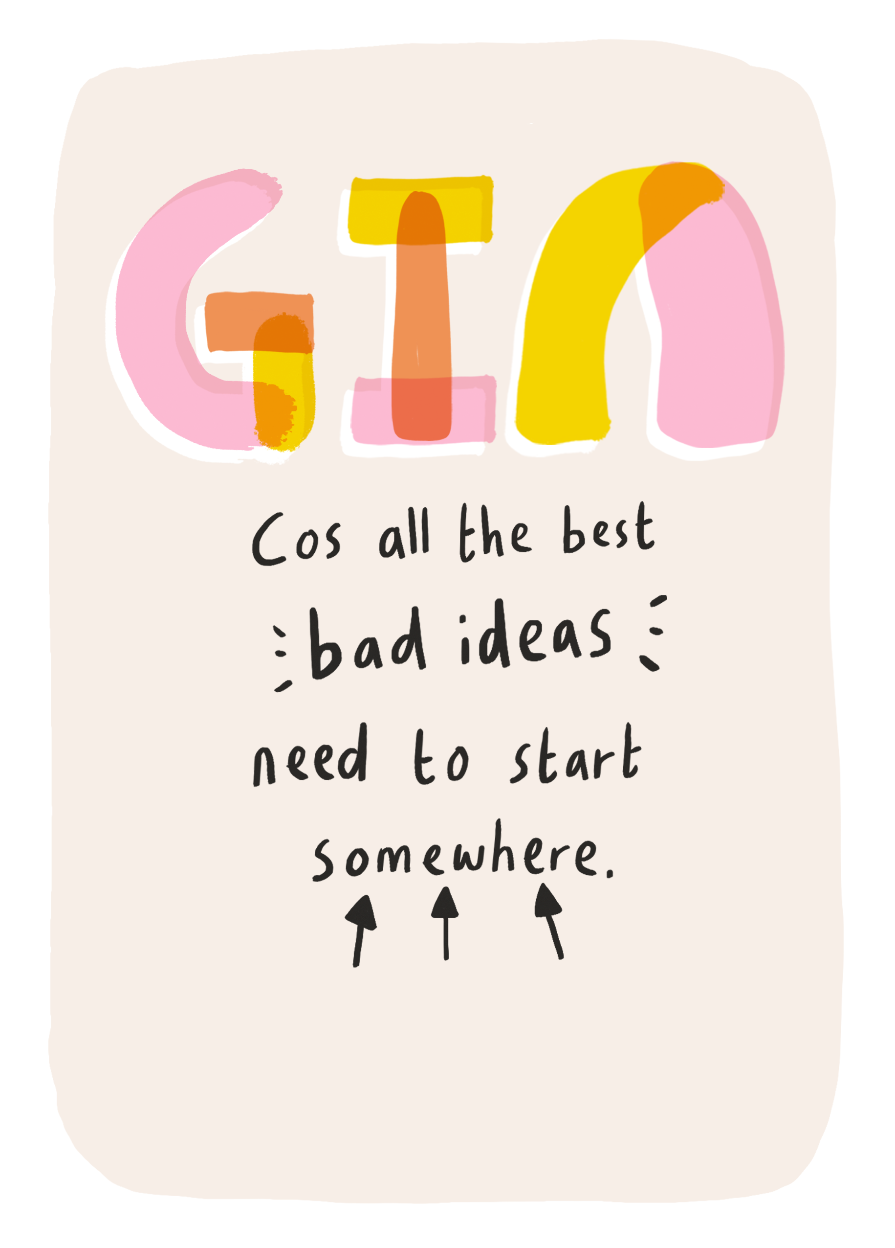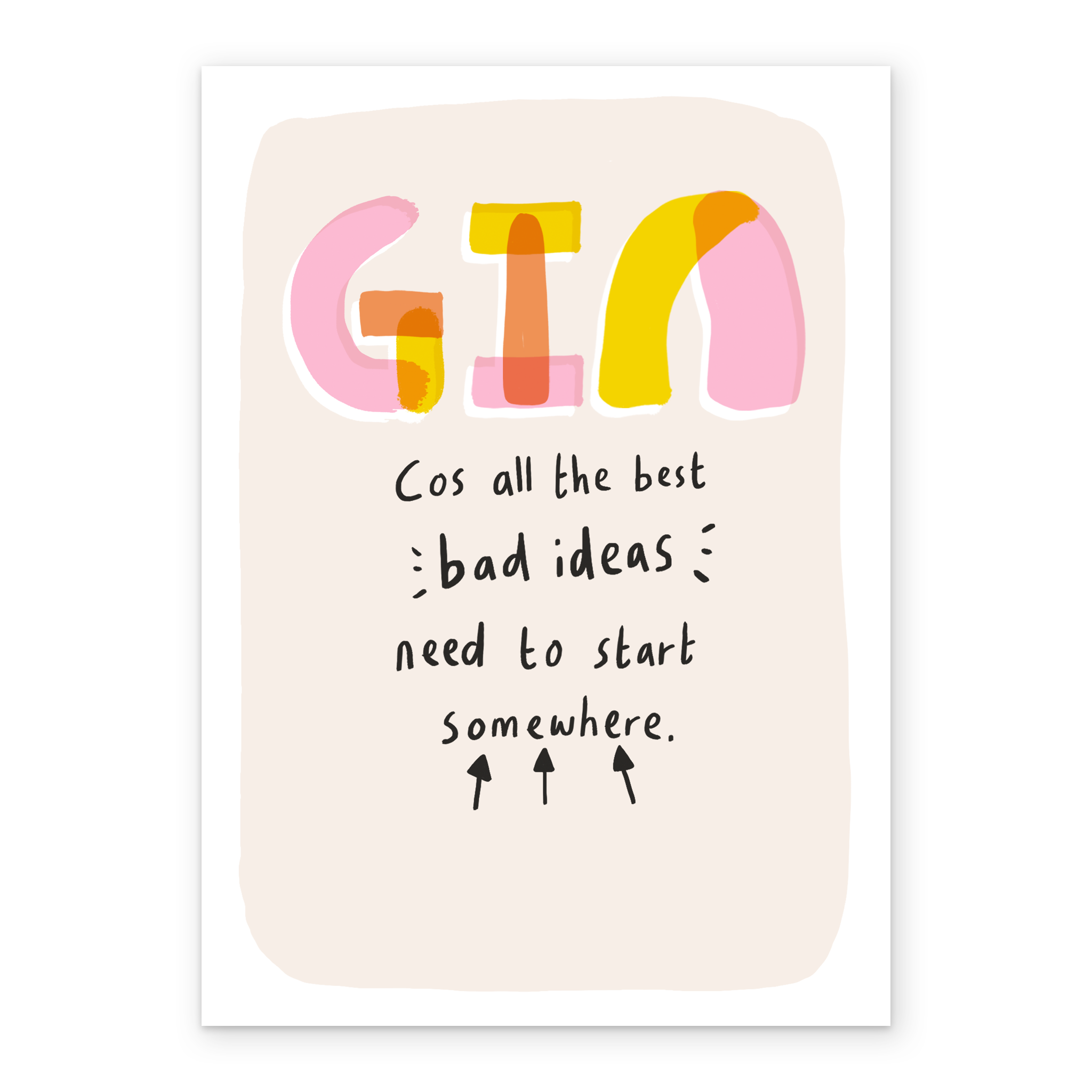 Printed on premium-quality board, this card features colourful lettering, with the message 'GIN Cos all the best bad ideas need to start somewhere.', and comes complete with a co-ordinating white envelope.