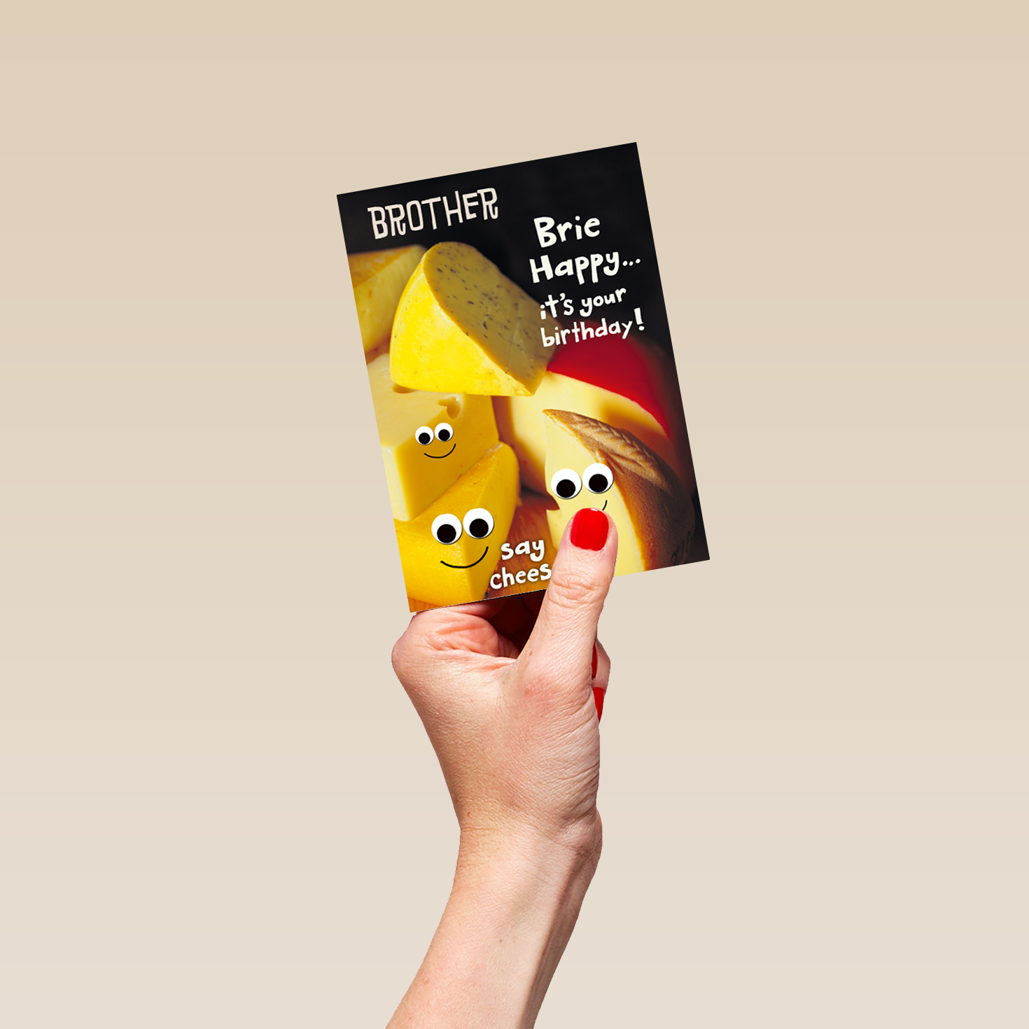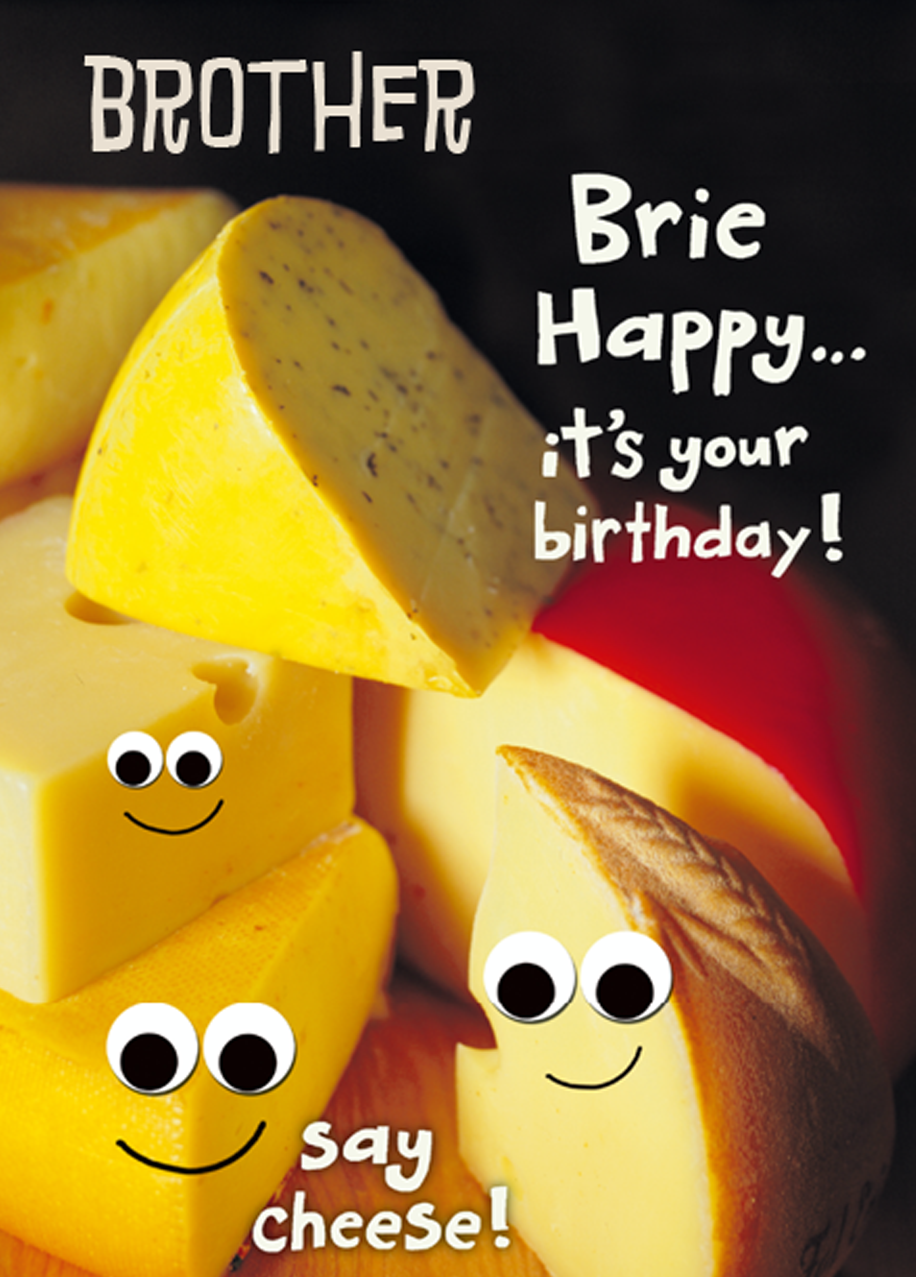 Show them you care with a personalised funny cheese googly eyes birthday card for brother from Hallmark. Our birthday cards are printed on premium quality, FSC®-certified card & delivered nationwide. This card is available as standard 12cm by 16.7cm and large 15.5cm by 21.6cm.