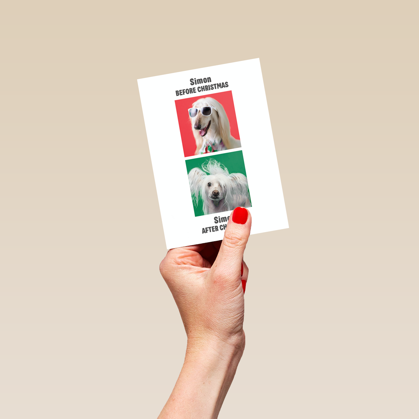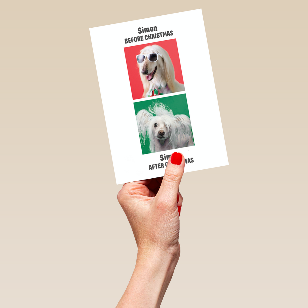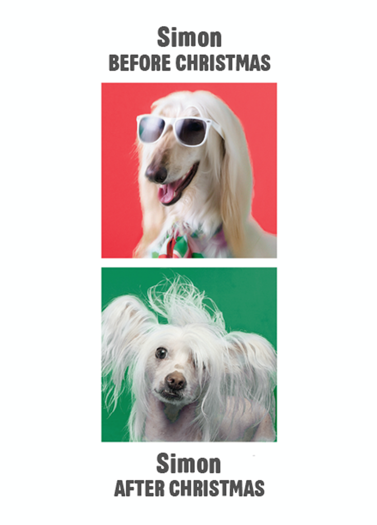 Printed on premium-quality board, this card features funny dogs with a red and green background, with the message 'Before/ After Christmas', and space to personalise a name.