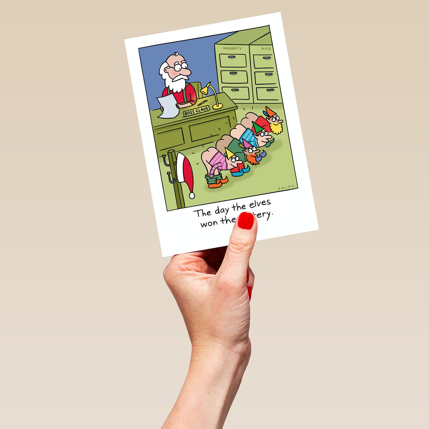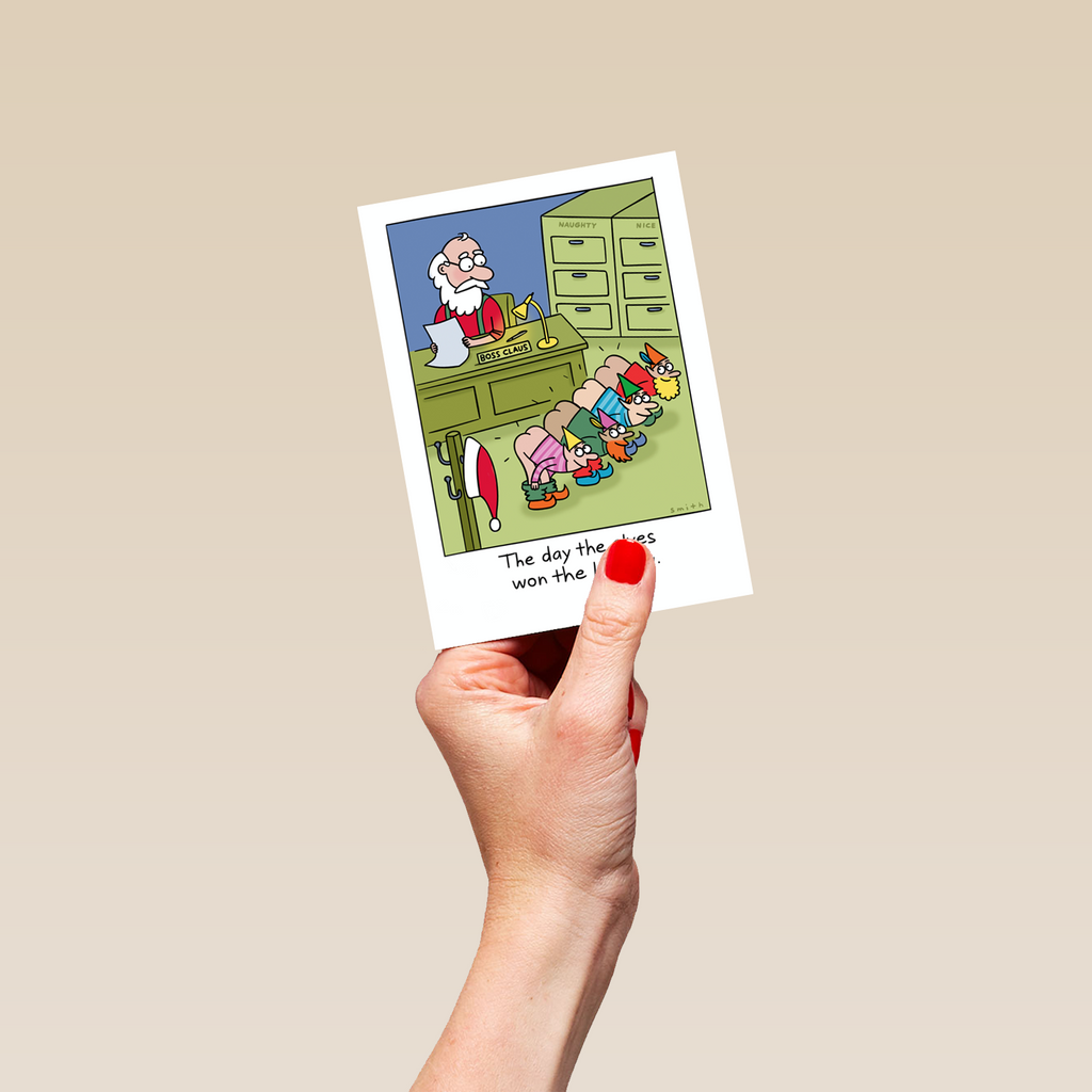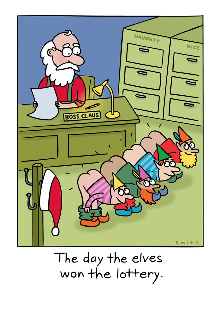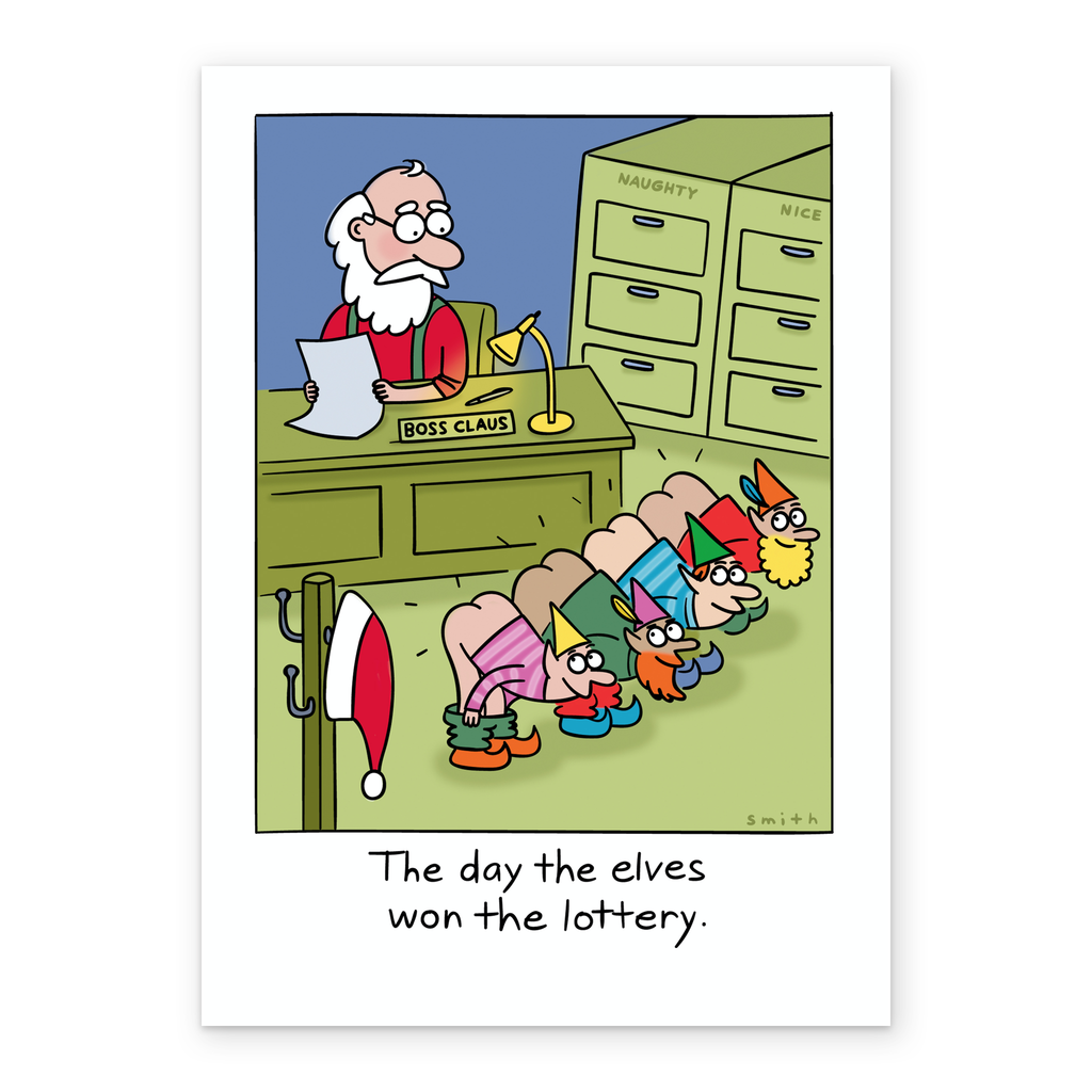 Show them you care with a personalised funny Christmas Shoebox cartoon elves win the lottery card from Hallmark. Our greetings cards are printed on premium quality, FSC®-certified card & delivered nationwide. This card is available as standard 12cm by 16.7cm and large 15.5cm by 21.6cm.