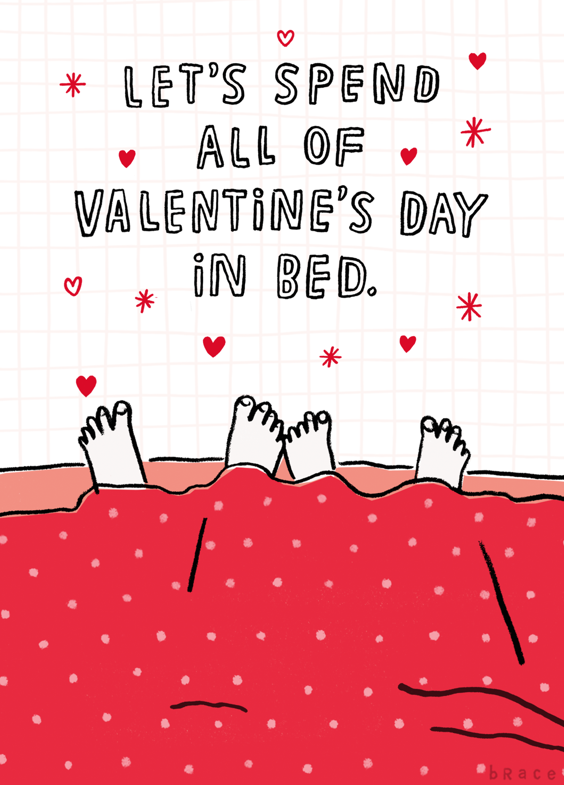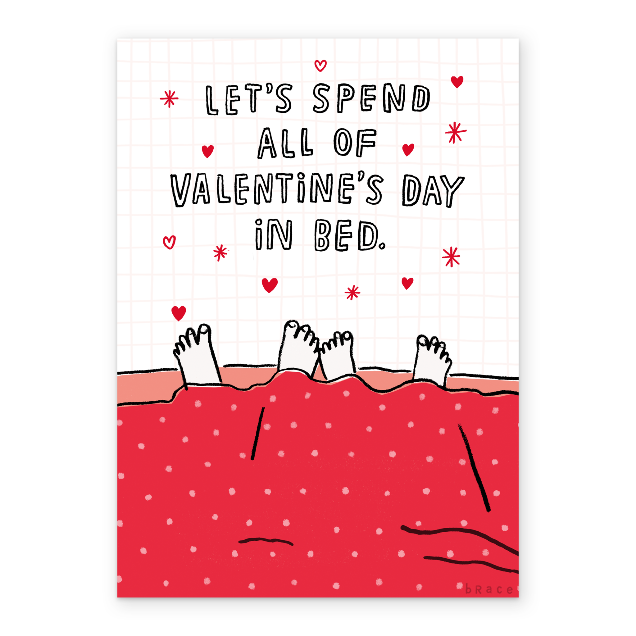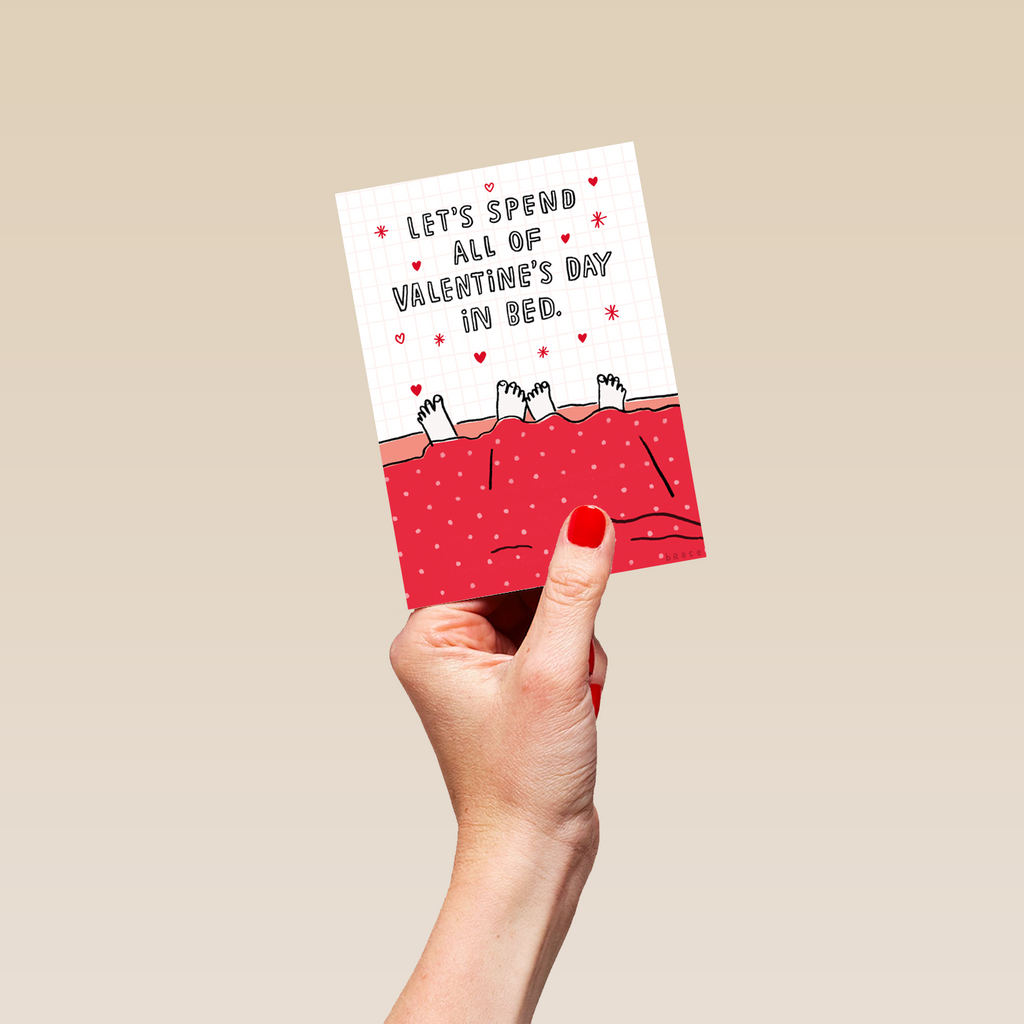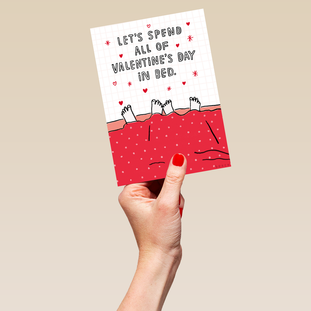 Printed on premium-quality board, this card features feet sticking out of the bottom of the duvet, with the message 'Let's spend all of Valentine's Day in bed', and comes complete with a co-ordinating white envelope.