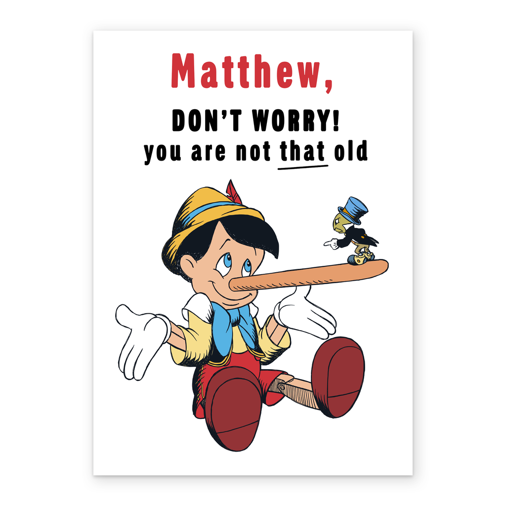 Printed on premium-quality board, this card features Pinocchio and Jiminy Cricket, with the message 'Don't worry, you are not that old', space to personalise a name, and comes complete with a co-ordinating white envelope.
