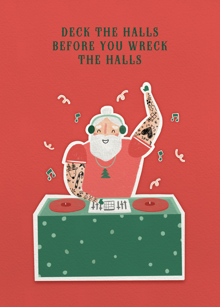 Show them you care with a personalised funny DJ Santa wreck the halls Christmas card from Hallmark. Our greetings cards are printed on premium quality, FSC®-certified card & delivered nationwide. This card is available as standard 12cm by 16.7cm and large 15.5cm by 21.6cm.