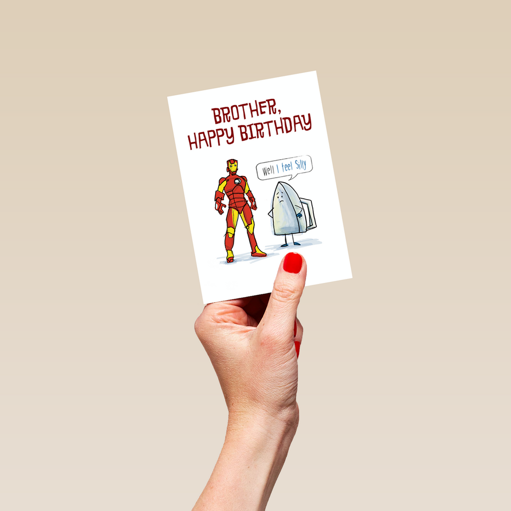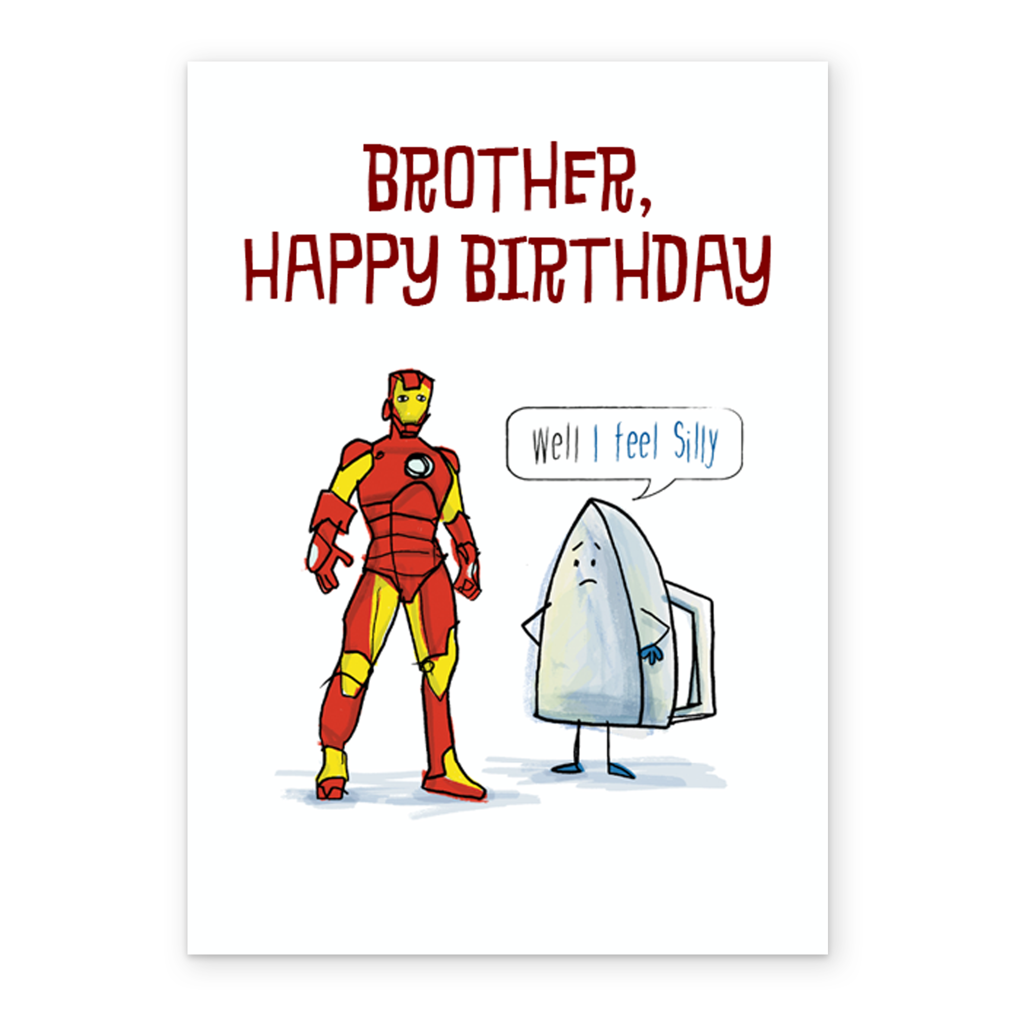 Show them you care with a personalised funny Iron Man cartoon birthday card for brother from Hallmark. Our birthday cards are printed on premium quality, FSC®-certified card & delivered nationwide. This card is available as standard 12cm by 16.7cm and large 15.5cm by 21.6cm.