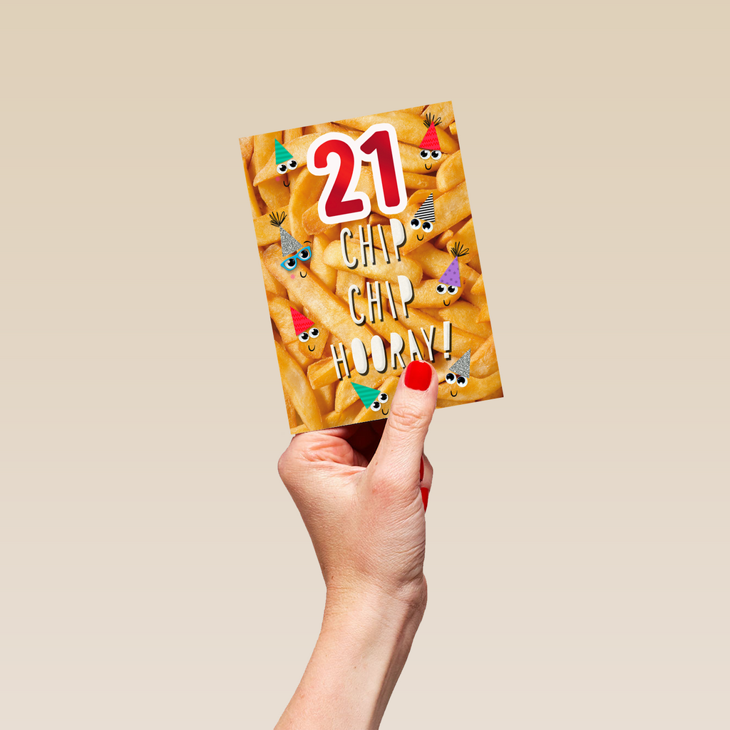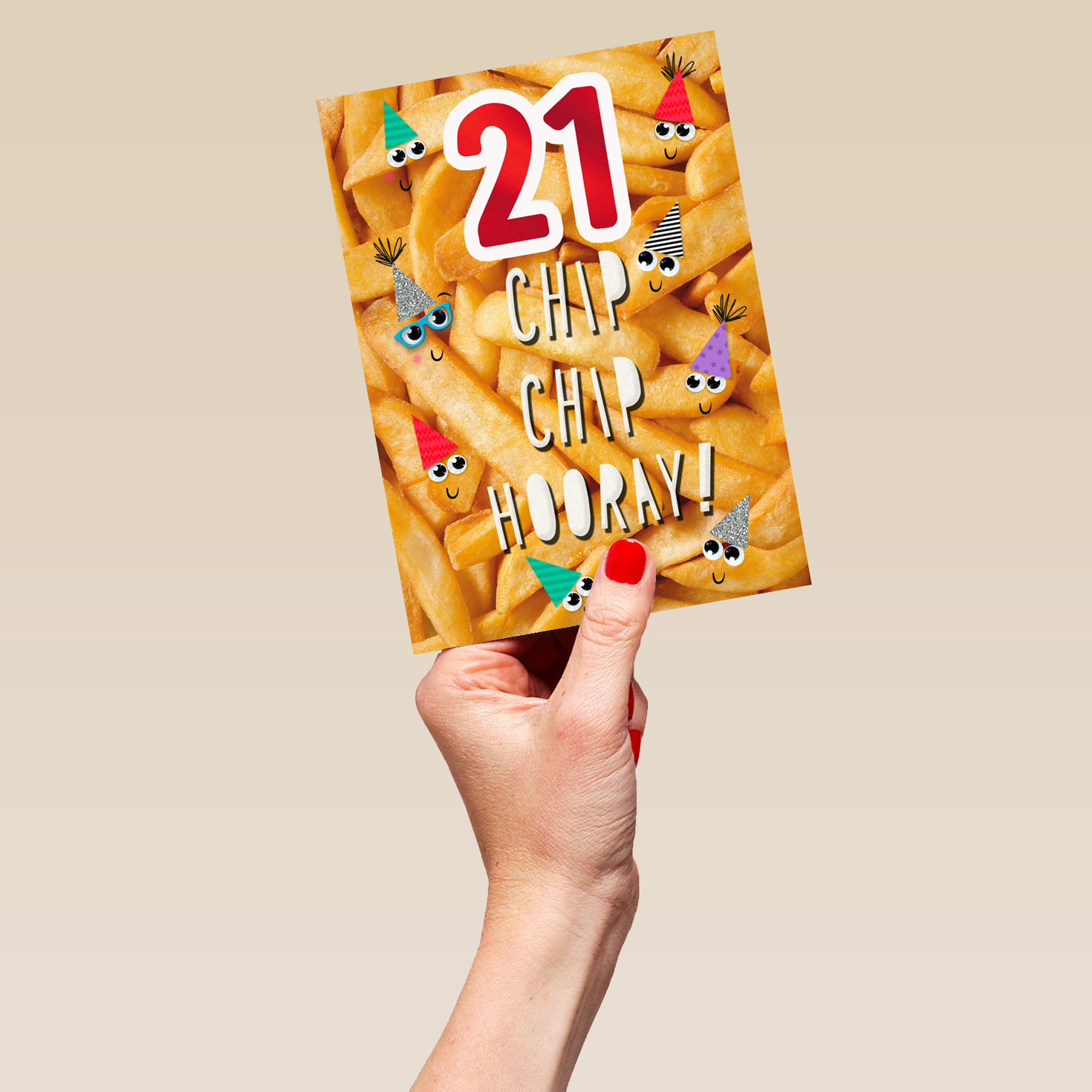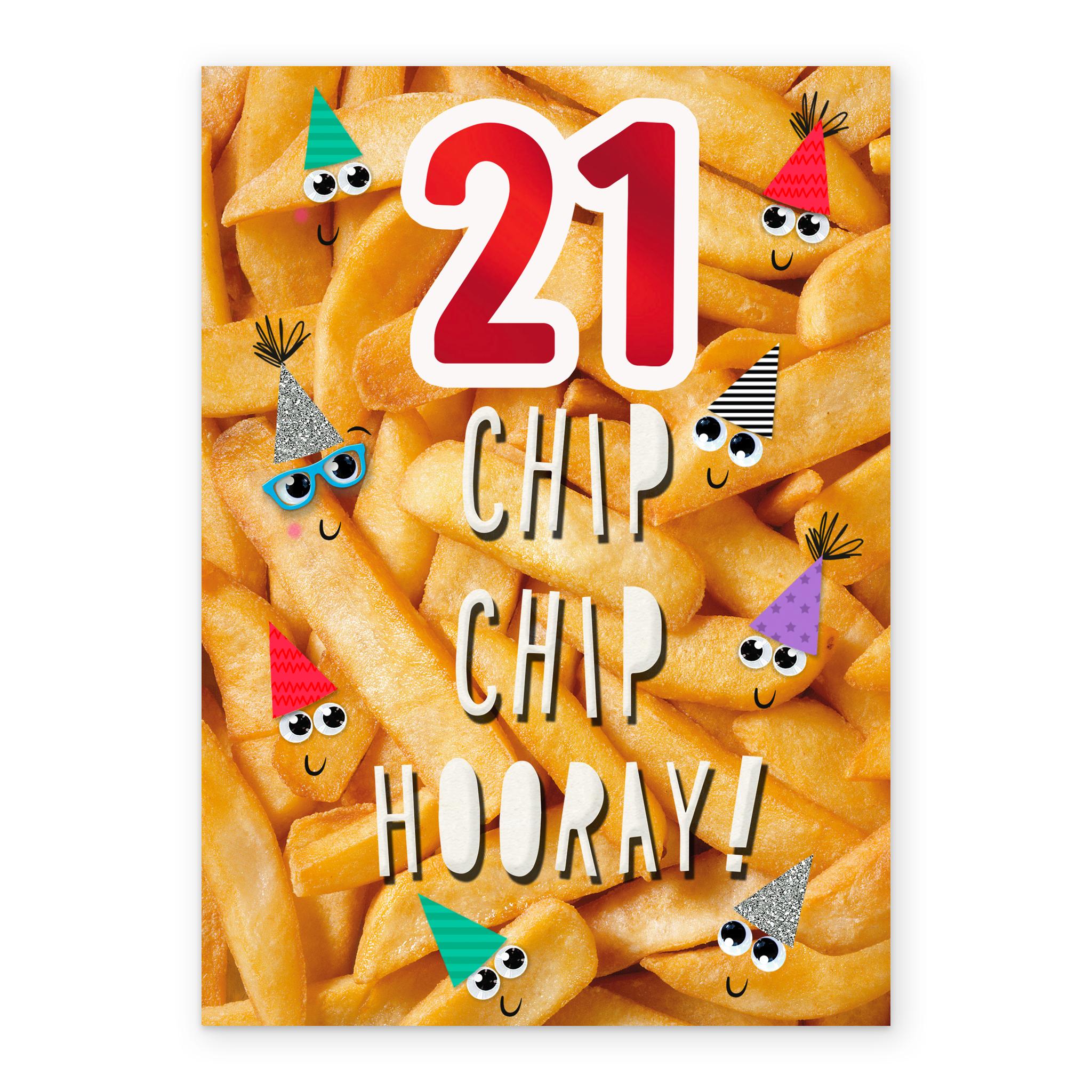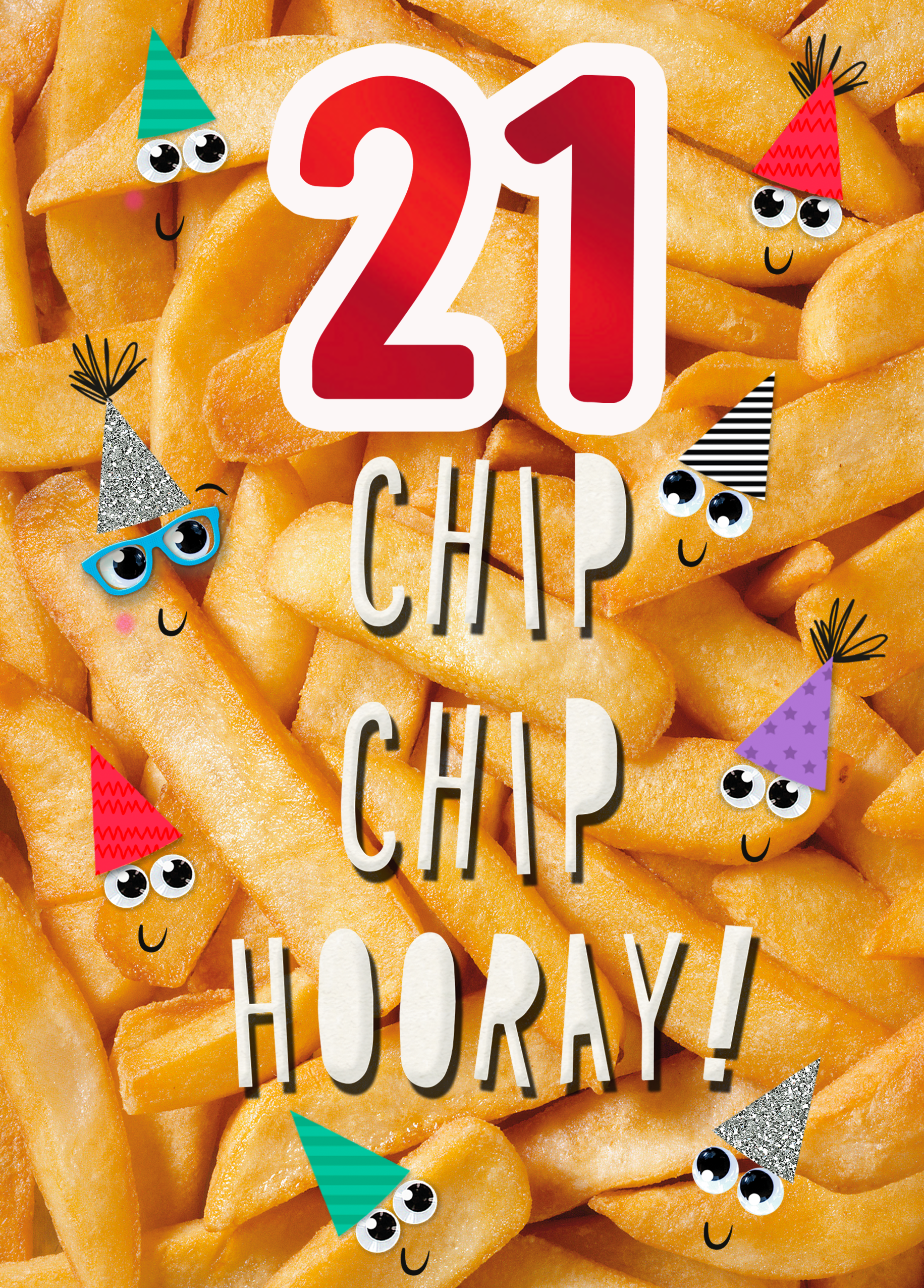 Printed on premium-quality board, this card features tasty potato chips with smiley faces and colourful party hats, and contemporary red and white text, with the message '21 Chip Chip Hooray!', and comes complete with a co-ordinating white envelope.