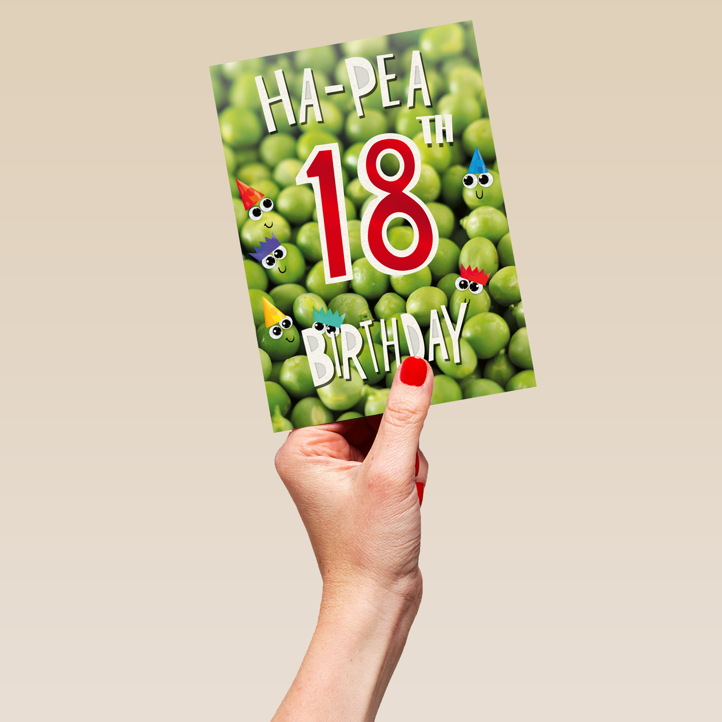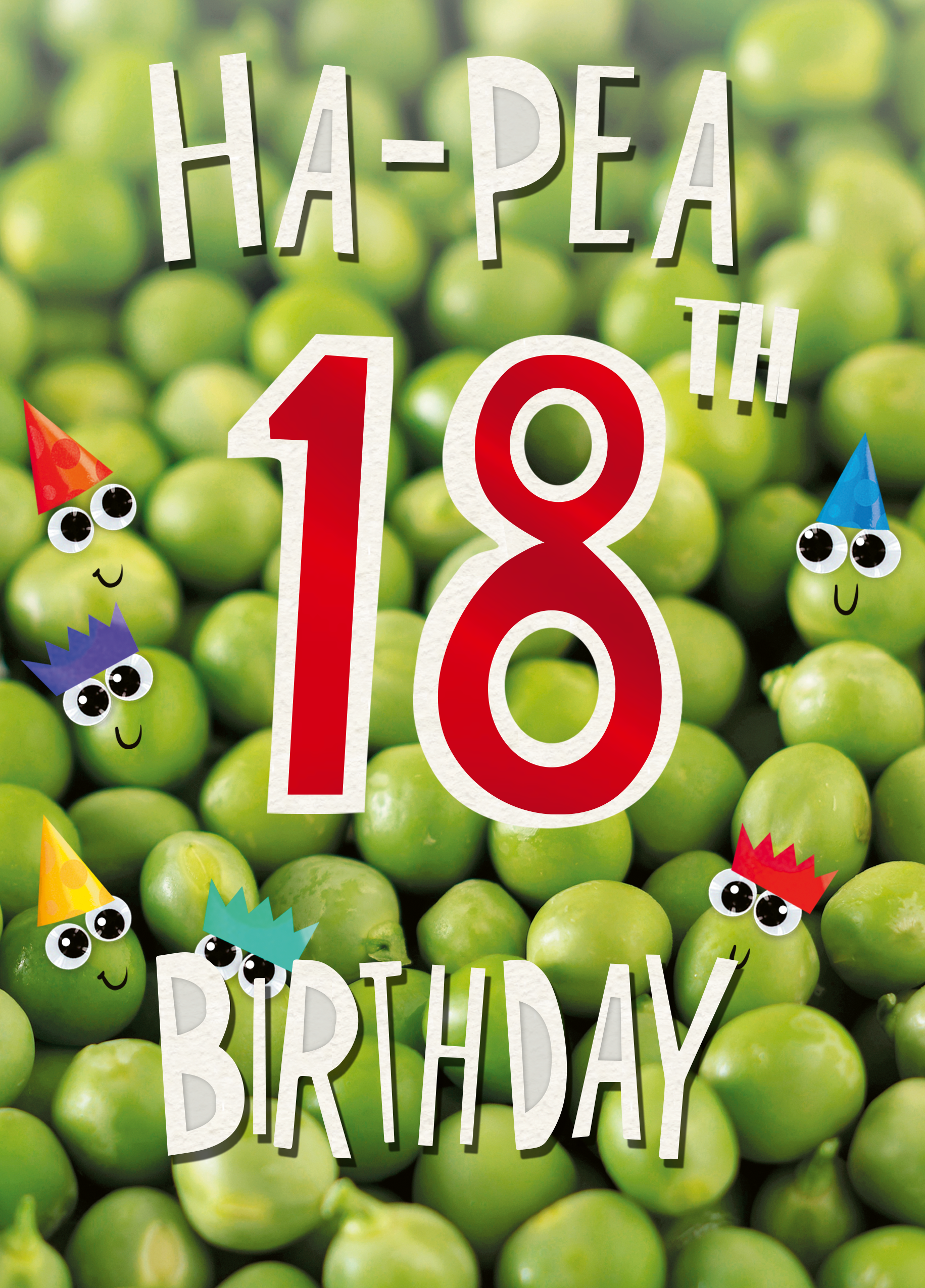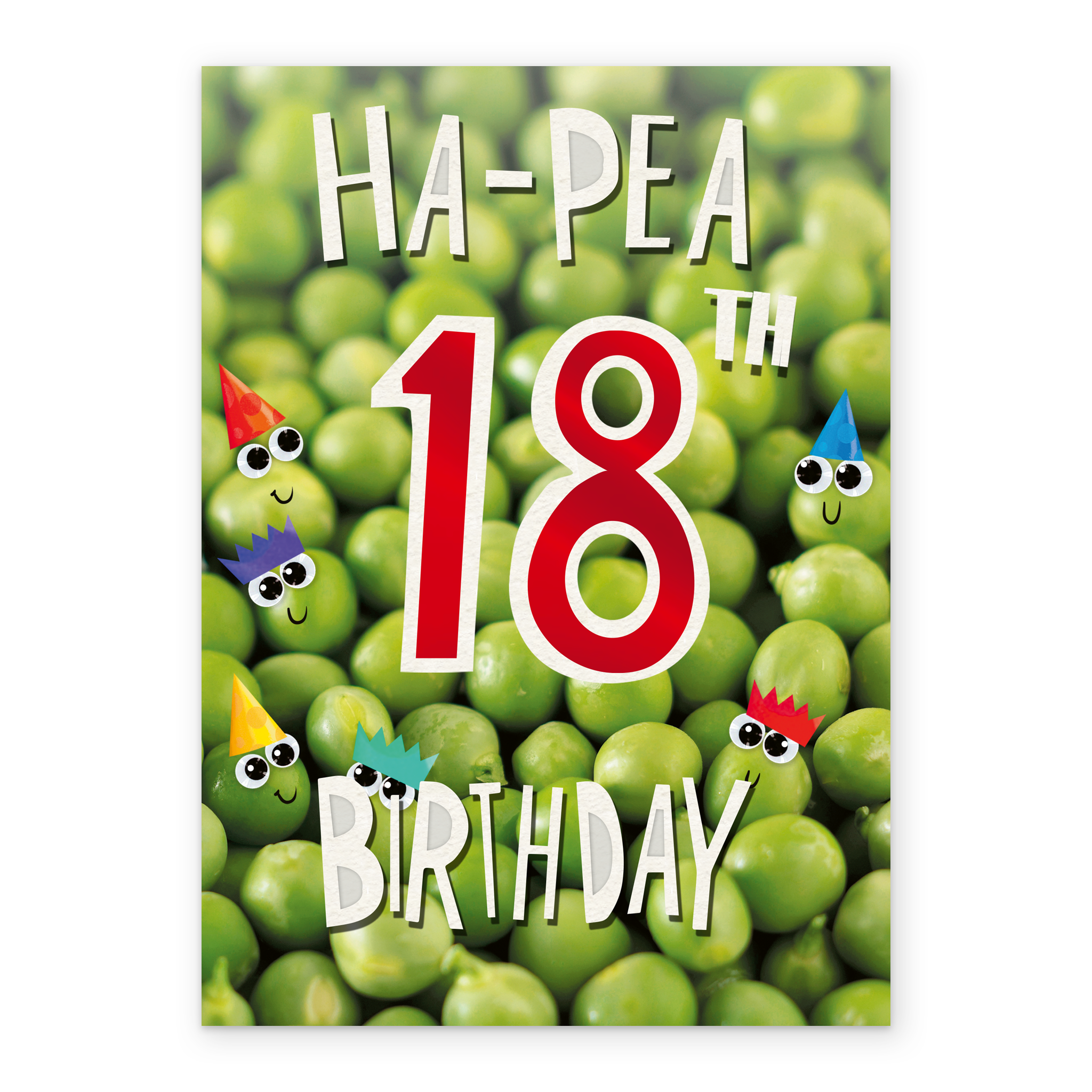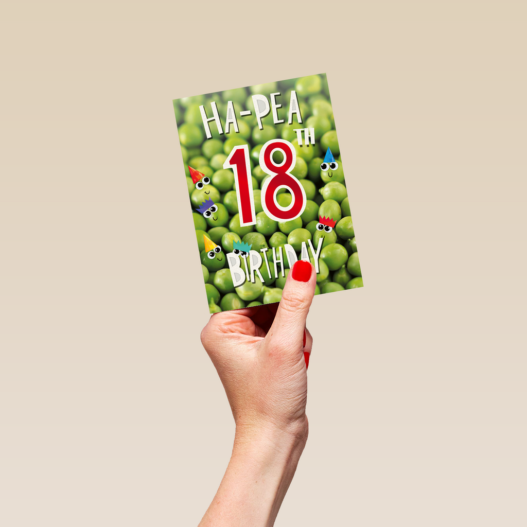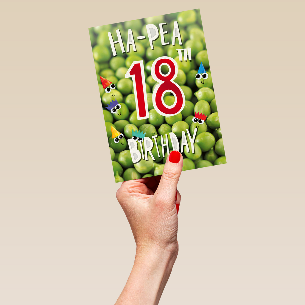 Printed on premium-quality board, this card features healthy green peas with smiley faces and colourful party hats, and contemporary red and white text, with the message 'Ha-Pea 18th Birthday', and comes complete with a co-ordinating white envelope.