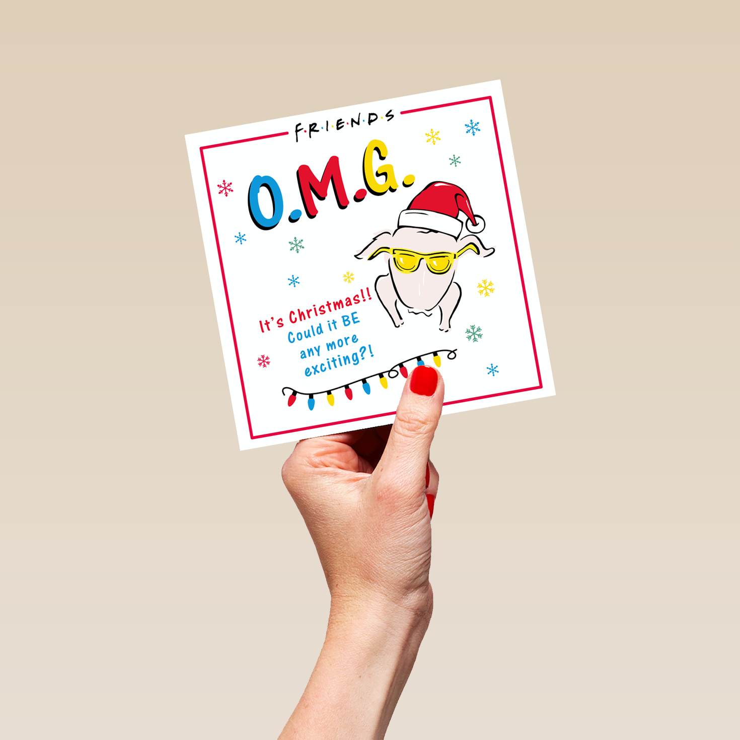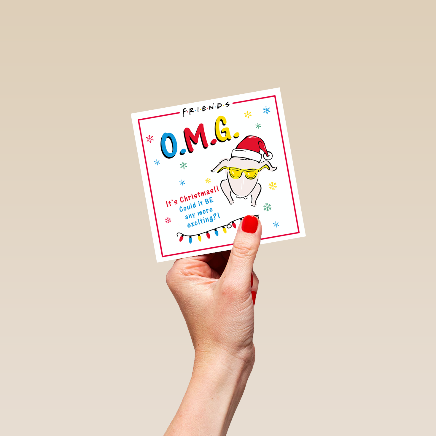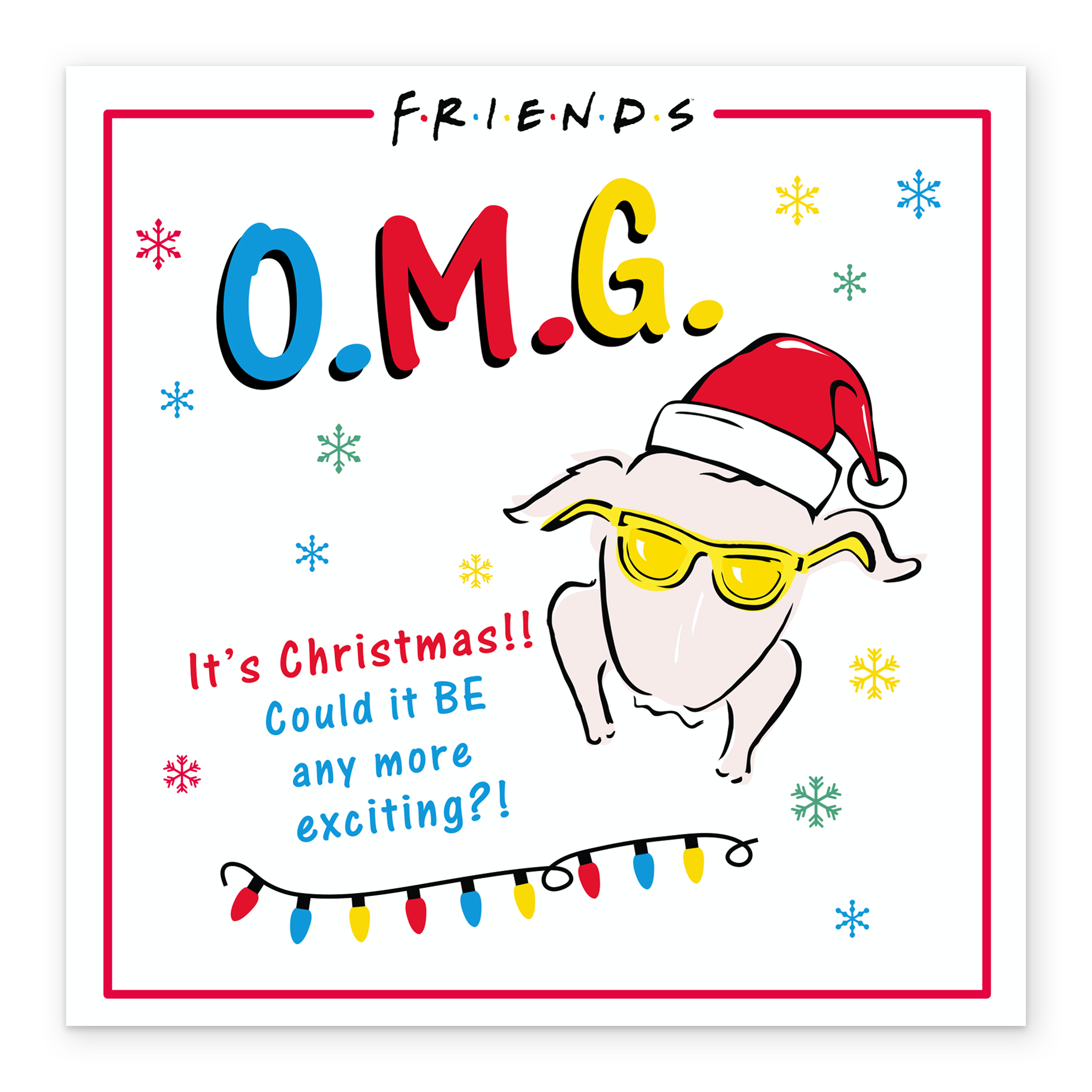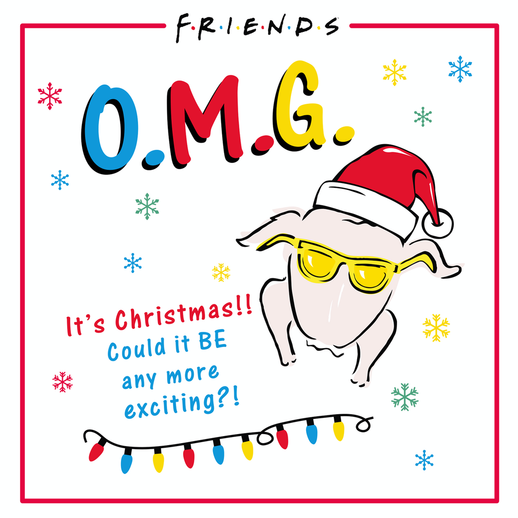 Show them you care with a personalised funny Friends™ O M G turkey Christmas card from Hallmark. Our Christmas cards are printed on premium quality, FSC®-certified card & delivered nationwide. This card is available as standard 12cm by 12cm and large 15cm by 15cm.