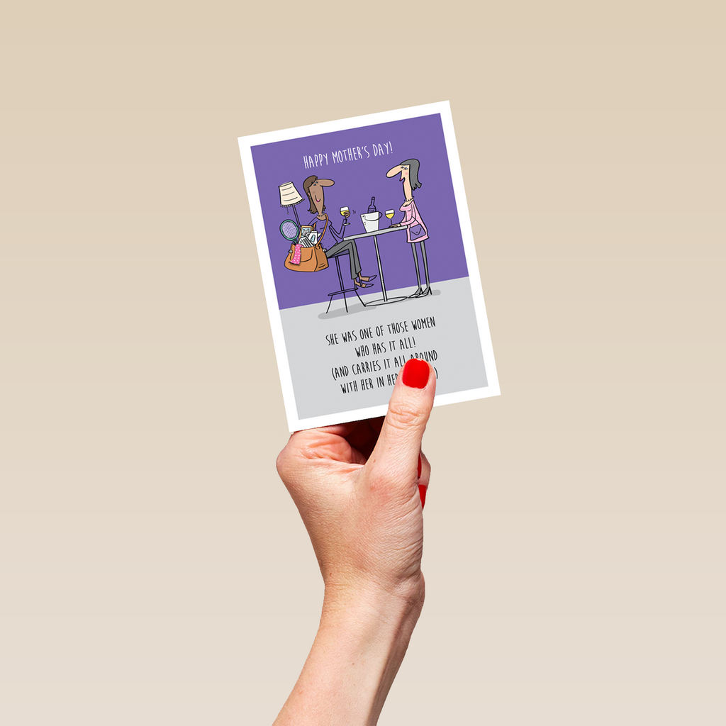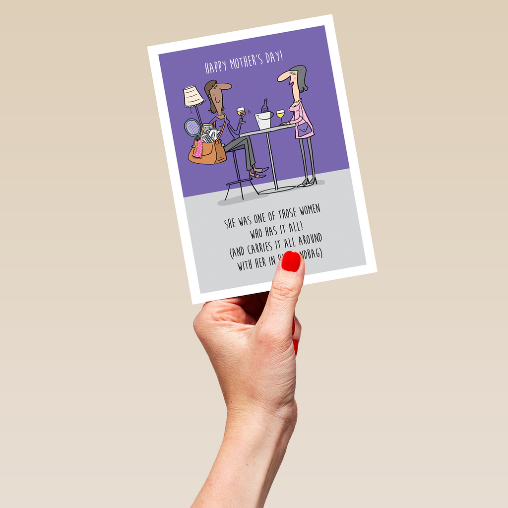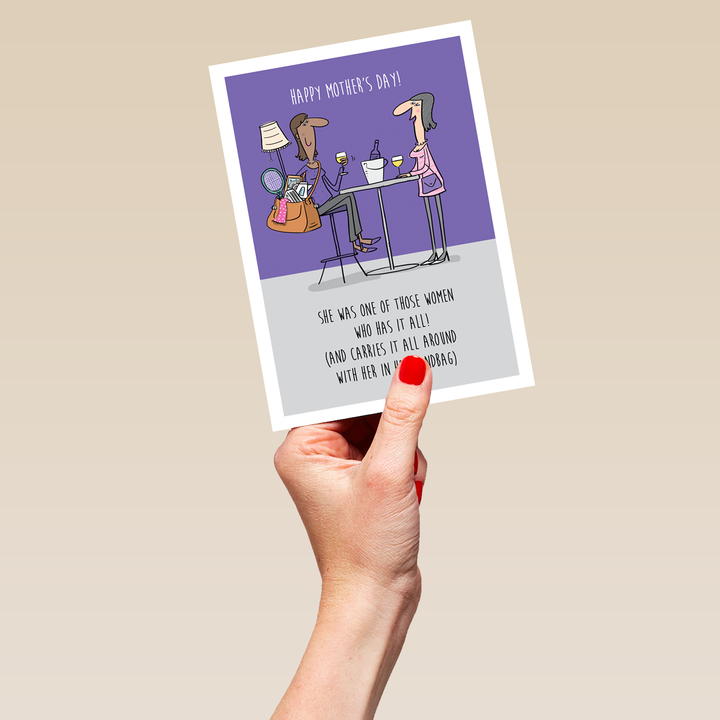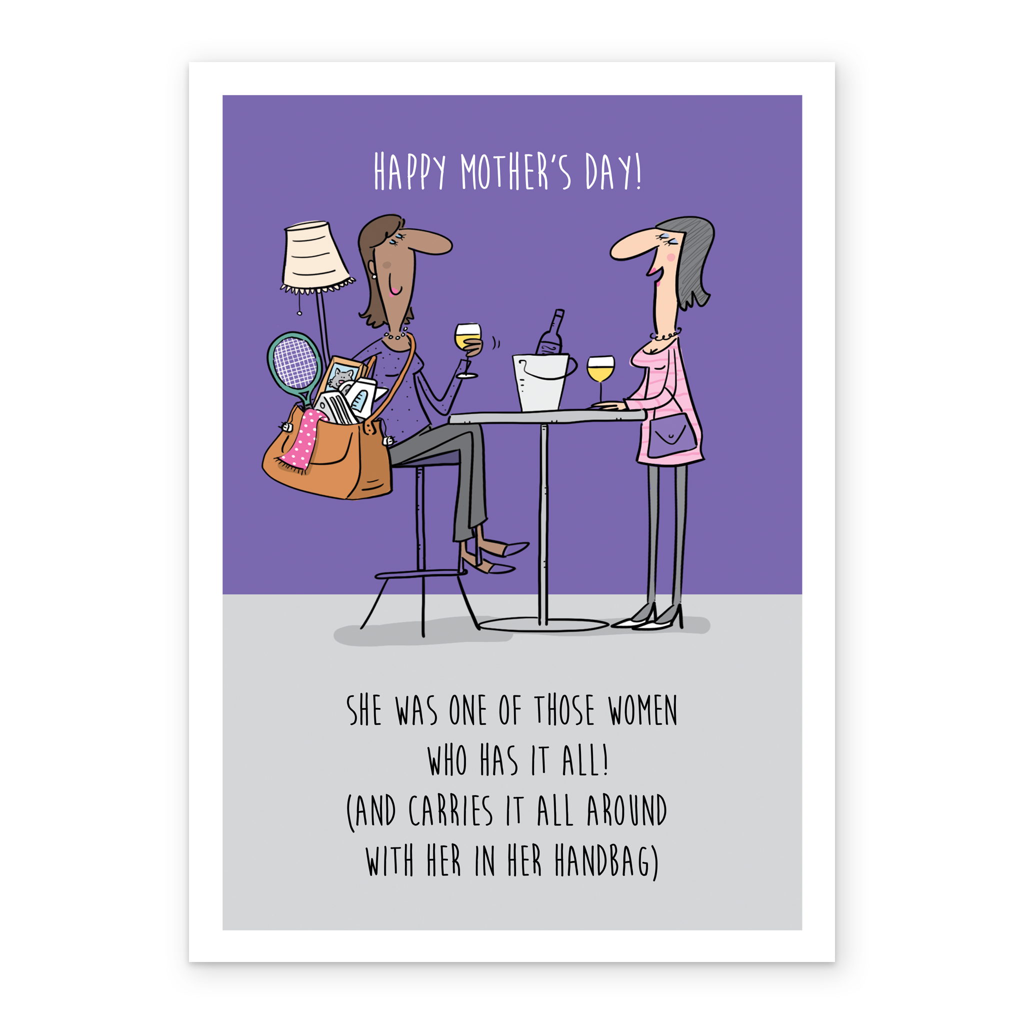 Printed on premium-quality board, this card features a funny illustration of two women catching up over drinks, one with a hand bag full of random objects, with the message 'Happy Mother's Day! She was one of those women who has it all! (And carries it all around with her in her handbag)', and comes complete with a co-ordinating white envelope.