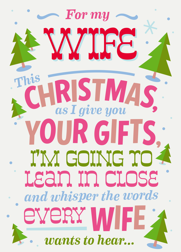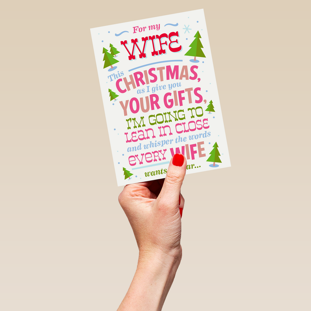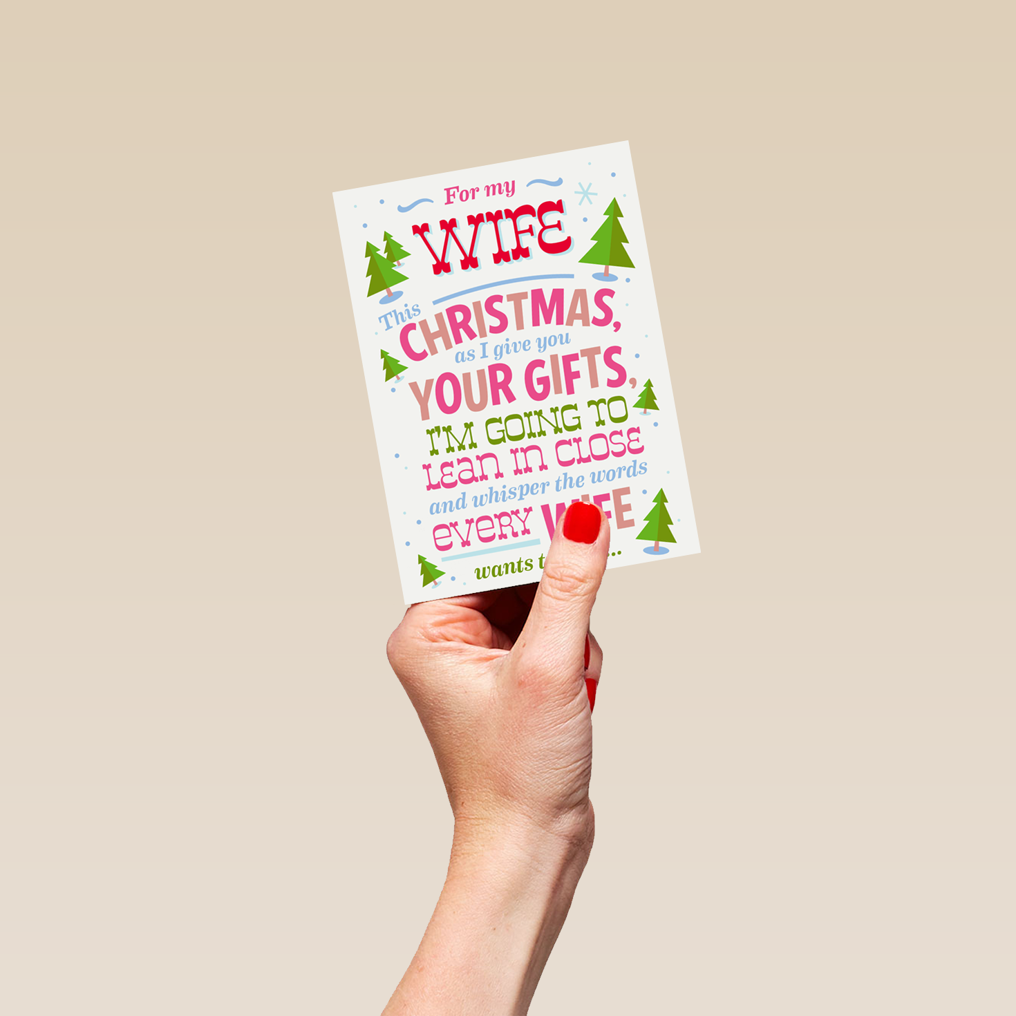 Printed on premium-quality board, this card features the message 'For My Wife, This Christmas as I give you Your Gifts, I'm Going To Lean In Close and whisper the words every Wife wants to hear...', festive illustrations, and comes complete with a co-ordinating white envelope.
