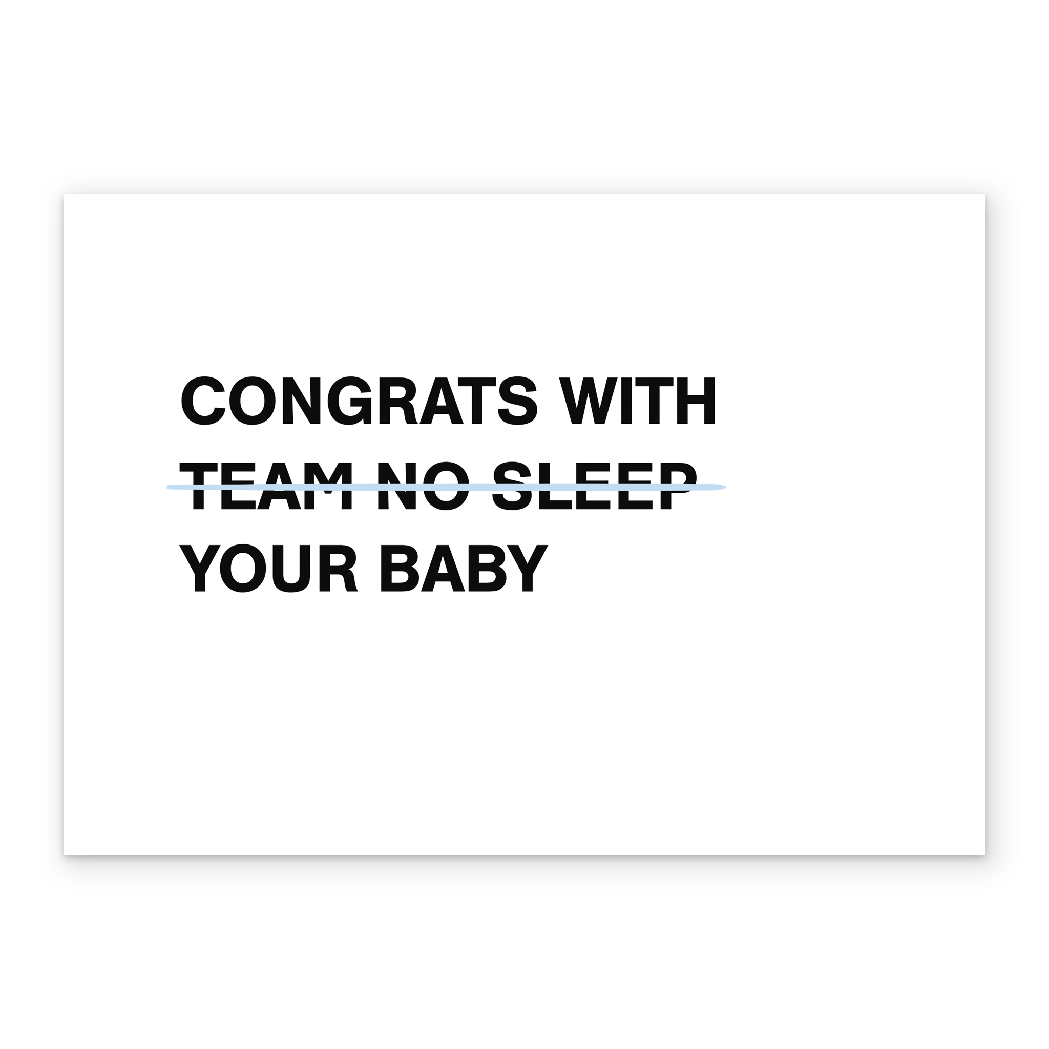Printed on premium-quality board, this card features a funny, crossed out message with a blue line, with the message 'Congrats with team no sleep (crossed out) your baby', and comes complete with a co-ordinating white envelope.