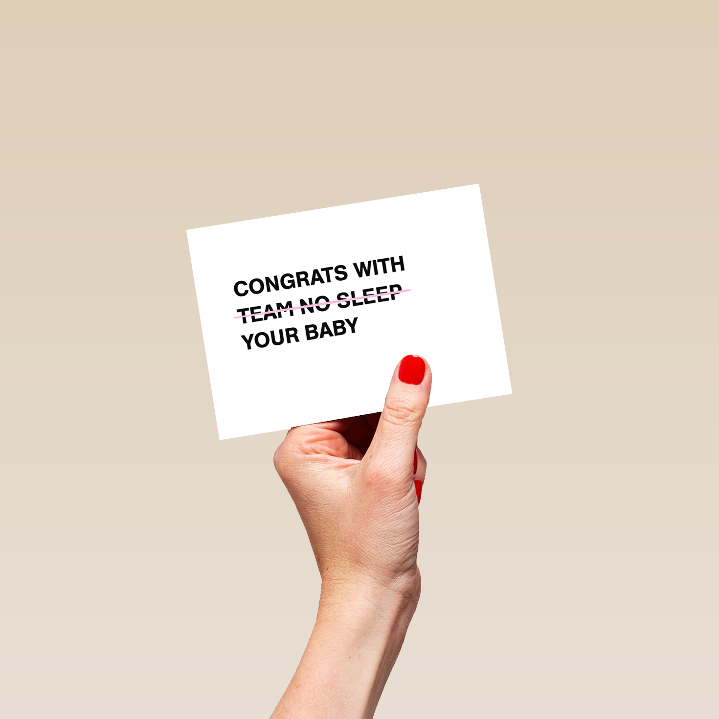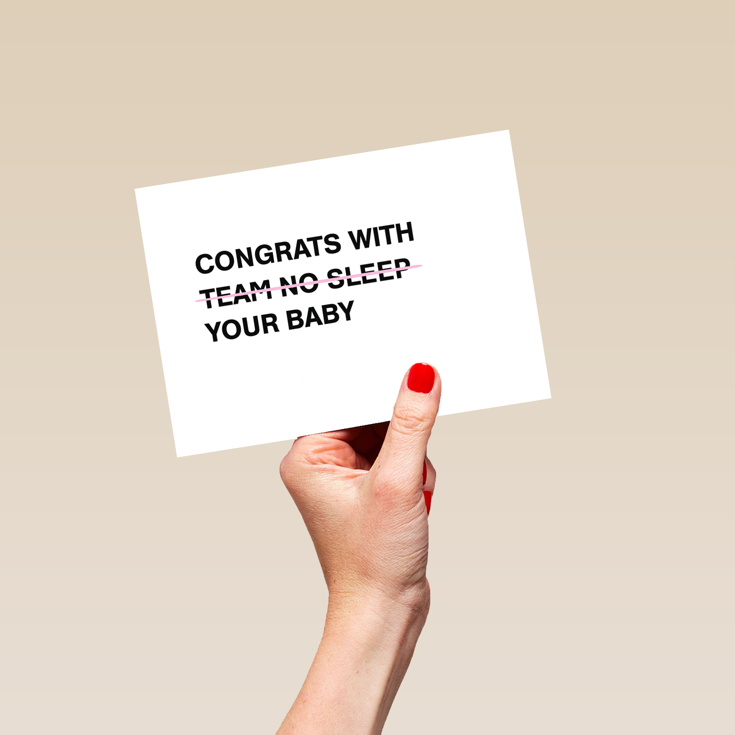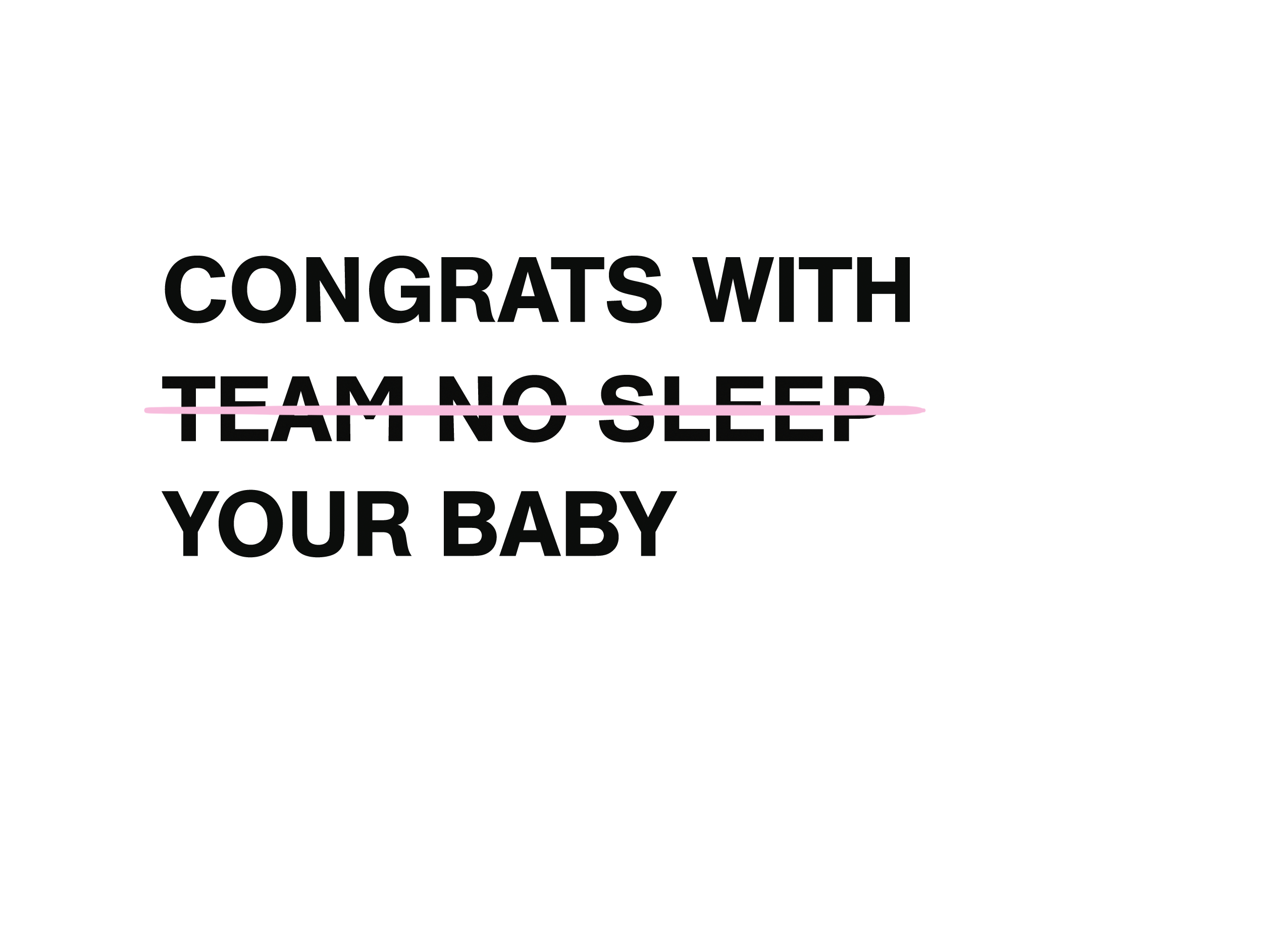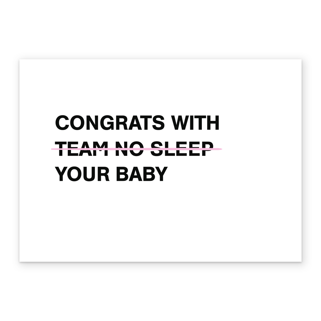 Printed on premium-quality board, this card features a funny, crossed out message with a pink line, with the message 'Congrats with team no sleep (crossed out) your baby', and comes complete with a co-ordinating white envelope.