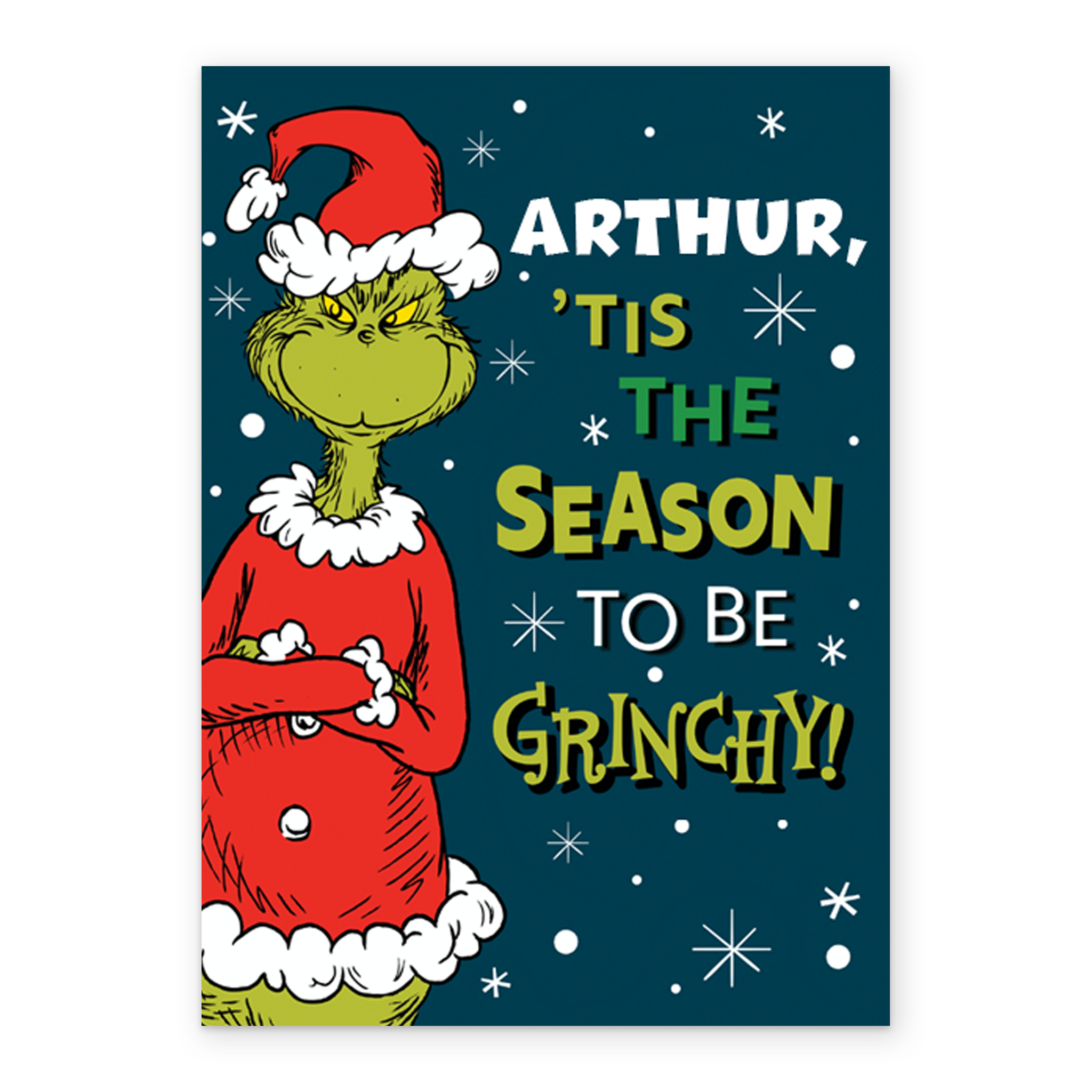 Show them you care with a personalised Christmas card, with a funny and mischievous Grinch.