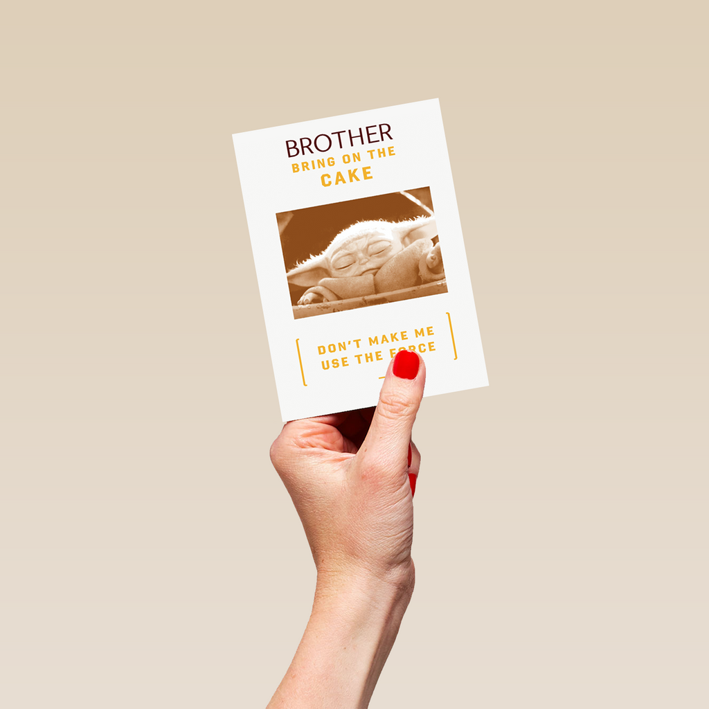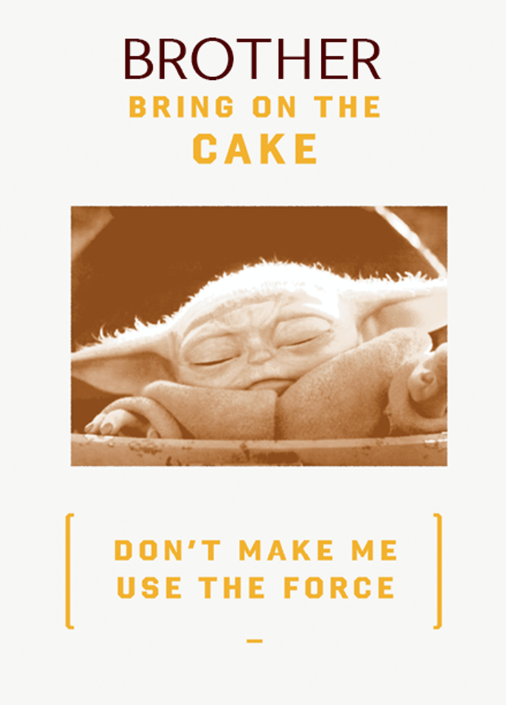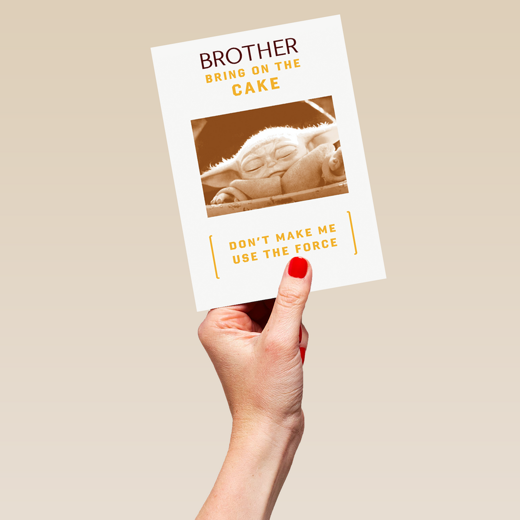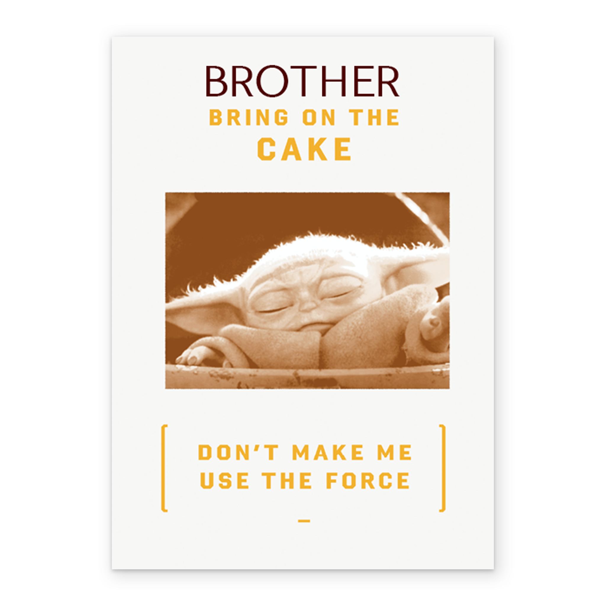 Show them you care with a personalised funny Star Wars™ The Mandalorian™ birthday card for brother from Hallmark. Our birthday cards are printed on premium quality, FSC®-certified card & delivered nationwide. This card is available as standard 12cm by 16.7cm and large 15.5cm by 21.6cm.