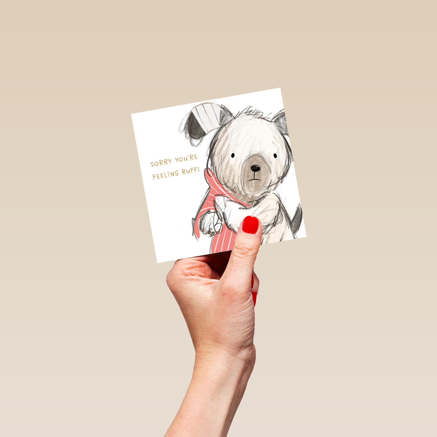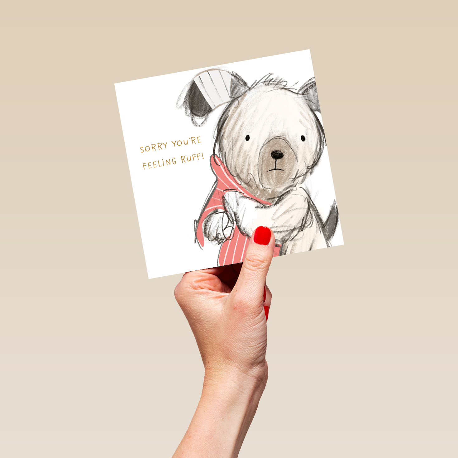 Printed on premium-quality board, this card features a cute, sketch style illustration of a sweet, black and white dog, cuddling a red and white striped blanket, set against a white background with gold-coloured lettering, with the message 'Sorry you're feeling ruff!', space to personalise your message, and comes complete with a co-ordinating white envelope.