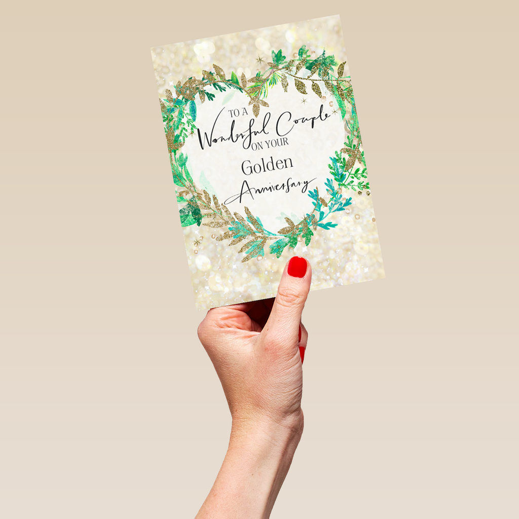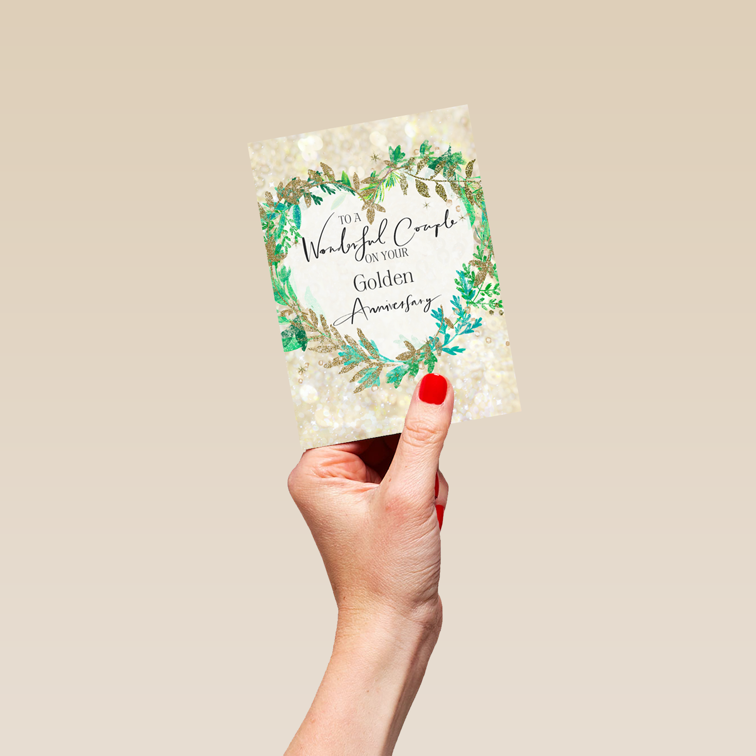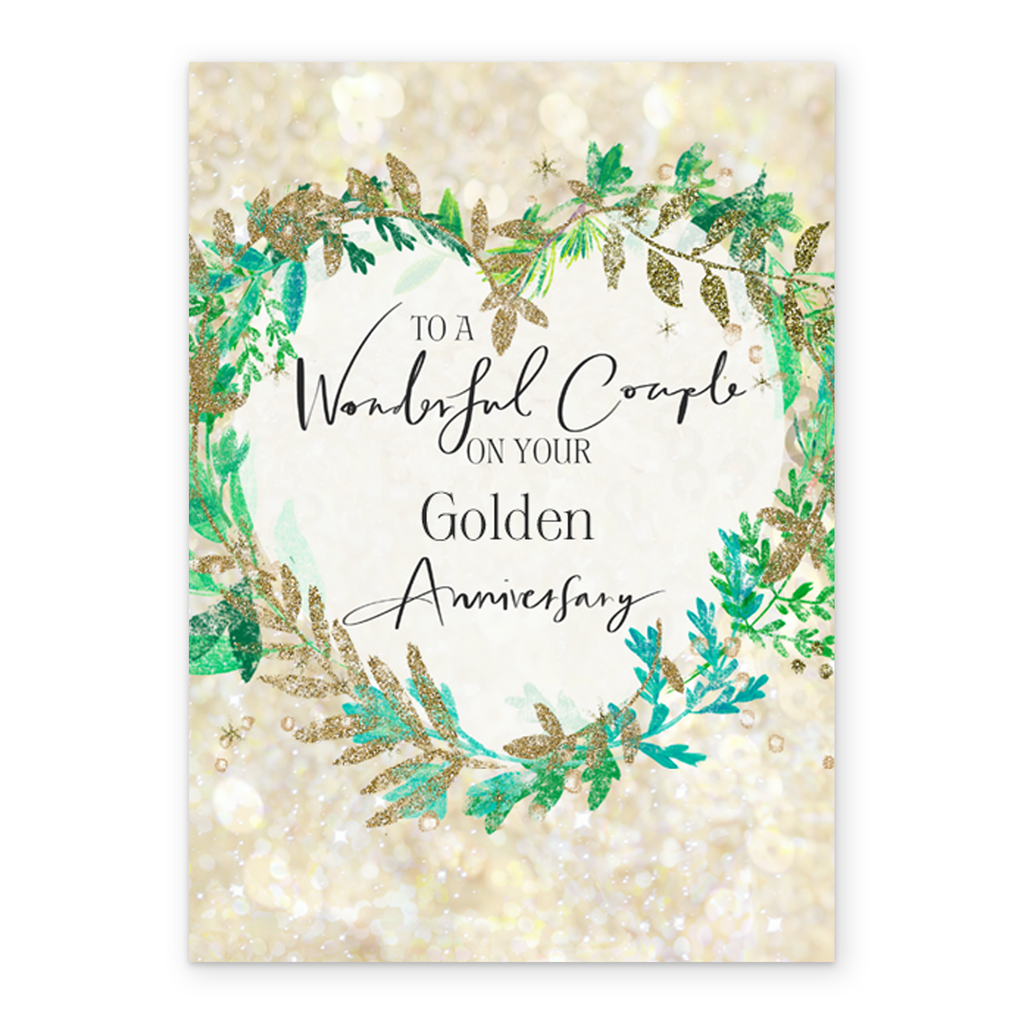 Printed on premium-quality board, this card features a floral wreath in a heart shape, with the message 'To A Wonderful Couple on your Golden Anniversary', space to personalise your message, and comes complete with a co-ordinating white envelope.