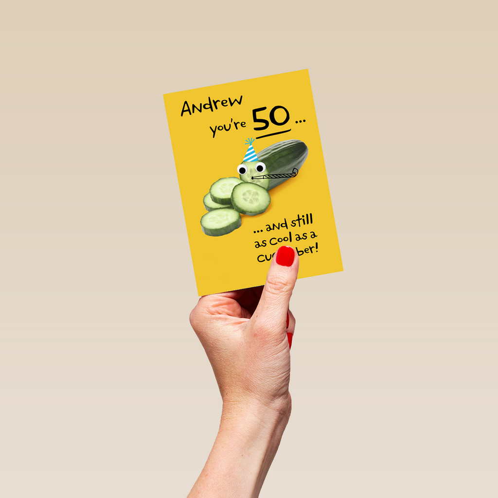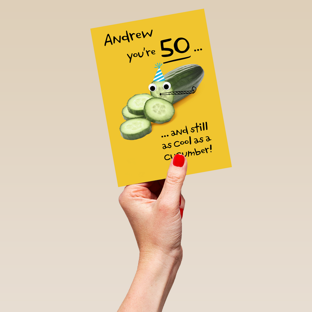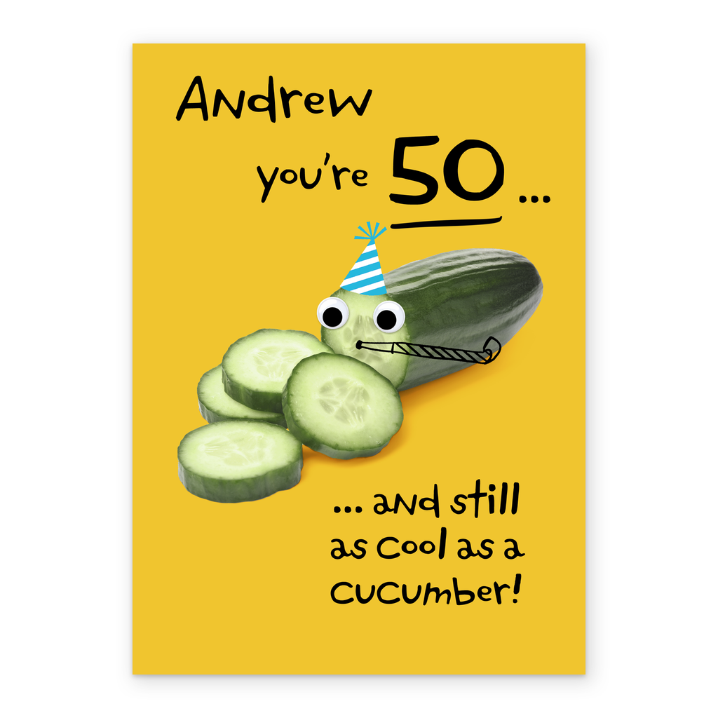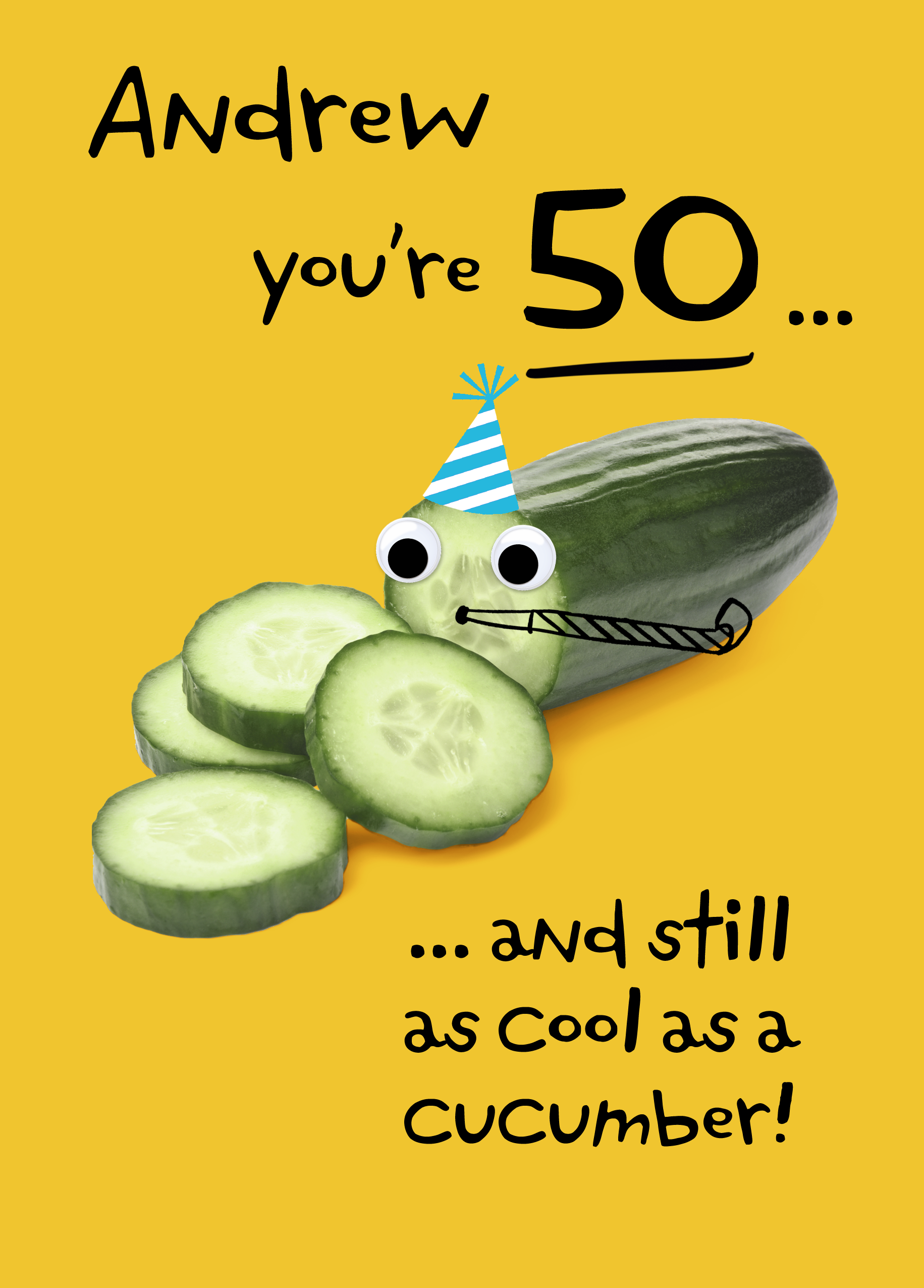 Printed on premium-quality board, this card features a photographic partially sliced cucumber, with the largest section embellished with an illustrated party hat, streamer horn and 'googly' eyes, set against a bright yellow background with black lettering above and below the image, with the message '[NAME] you're 50… …and still as cool as a cucumber!', space to personalise a name & age, and comes complete with a co-ordinating white envelope.