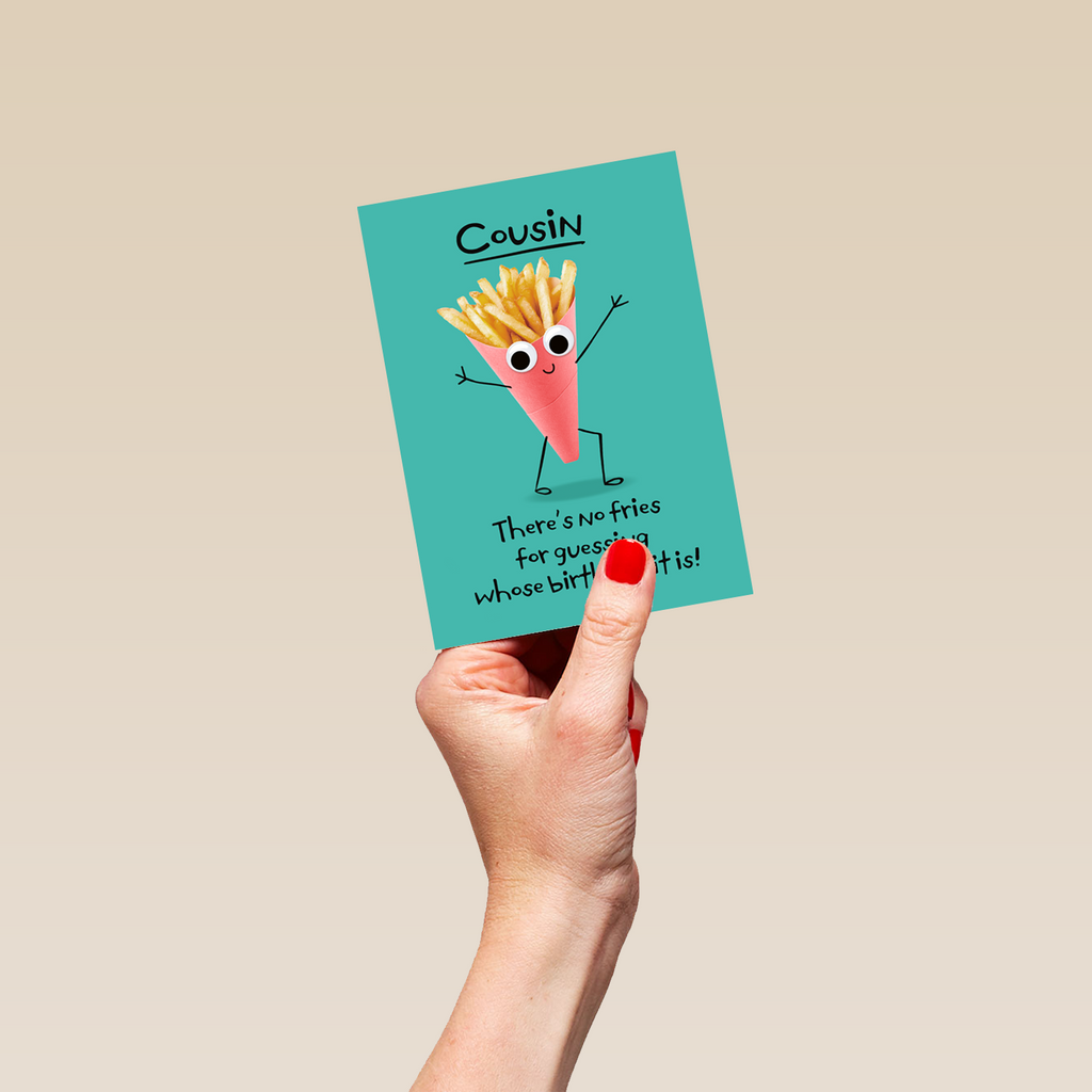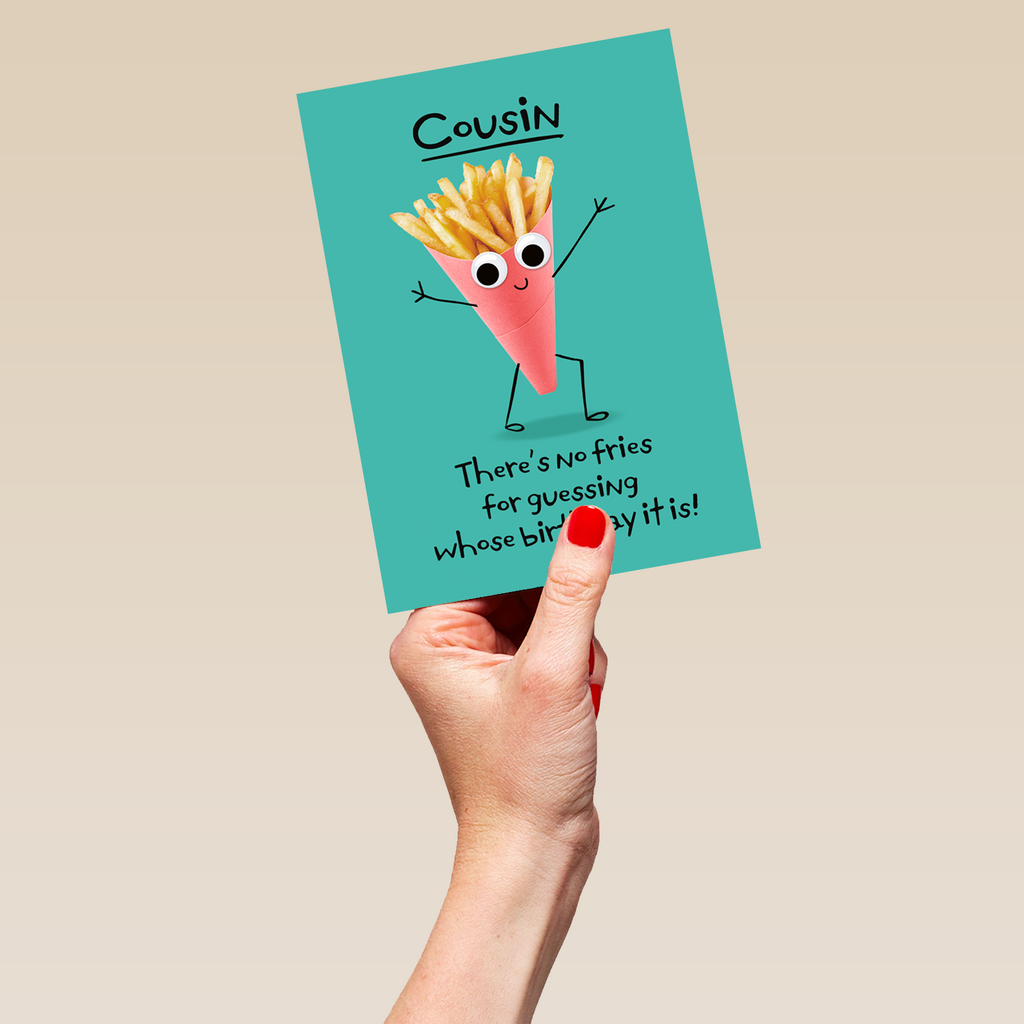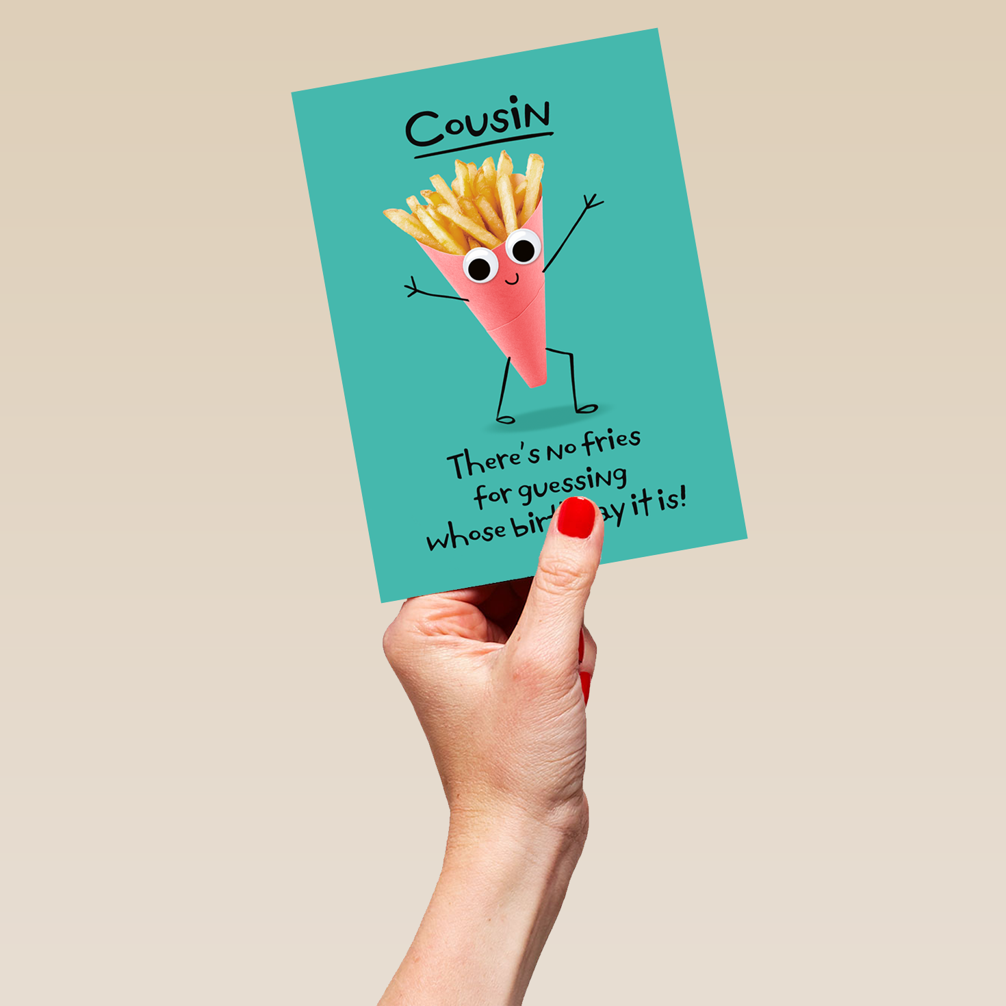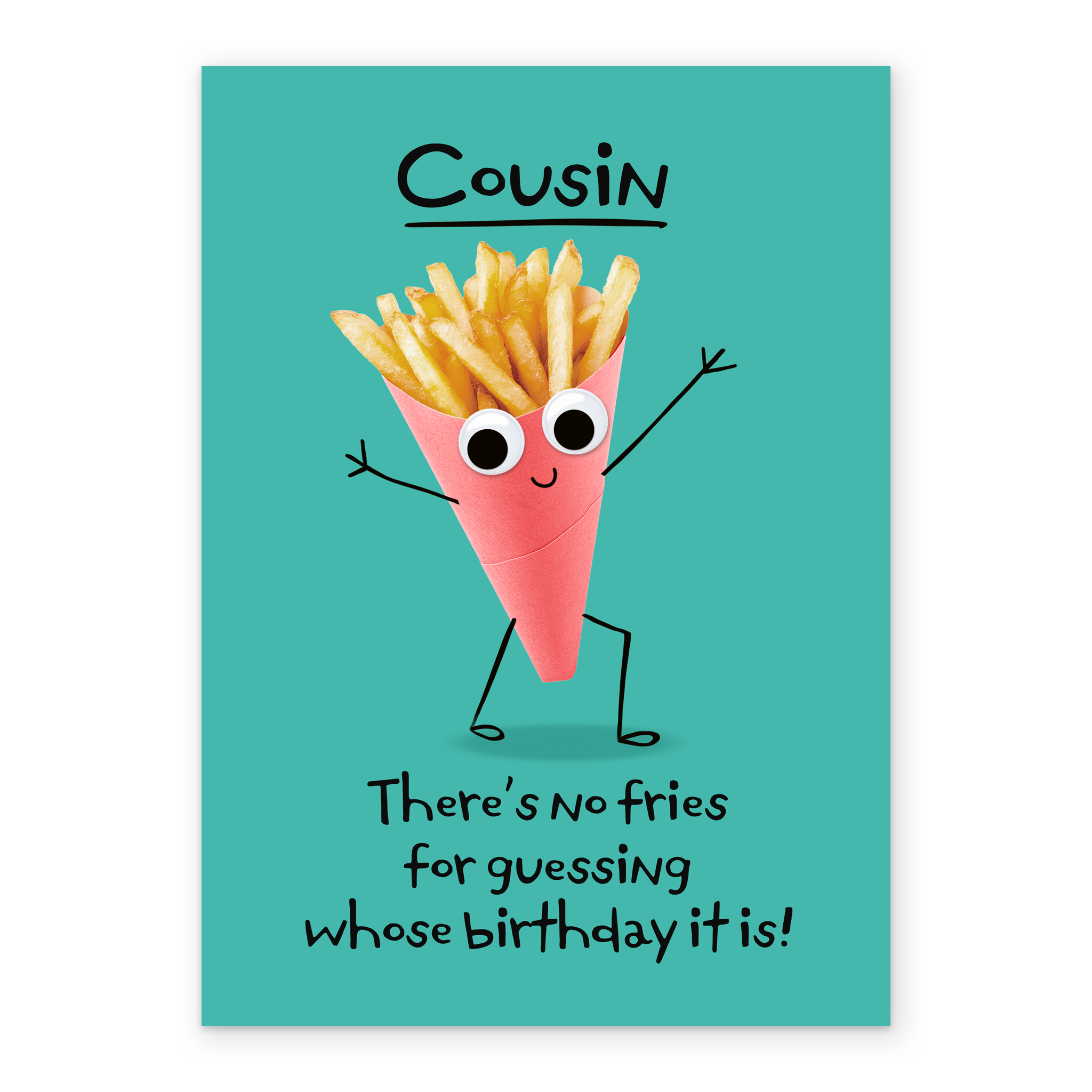 Printed on premium-quality board, this card features a photographic paper cone filled with fries, embellished with illustrated arms, smile and 'googly' eyes, set against a teal background with black lettering above and below the image, with the message 'Cousin There's no fries for guessing who's birthday it is!', space to personalise a name, and comes complete with a co-ordinating white envelope.