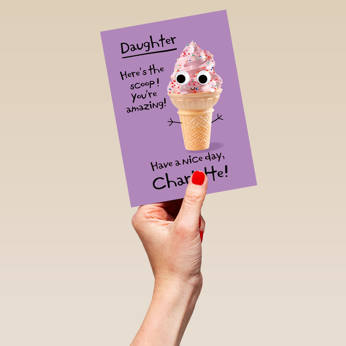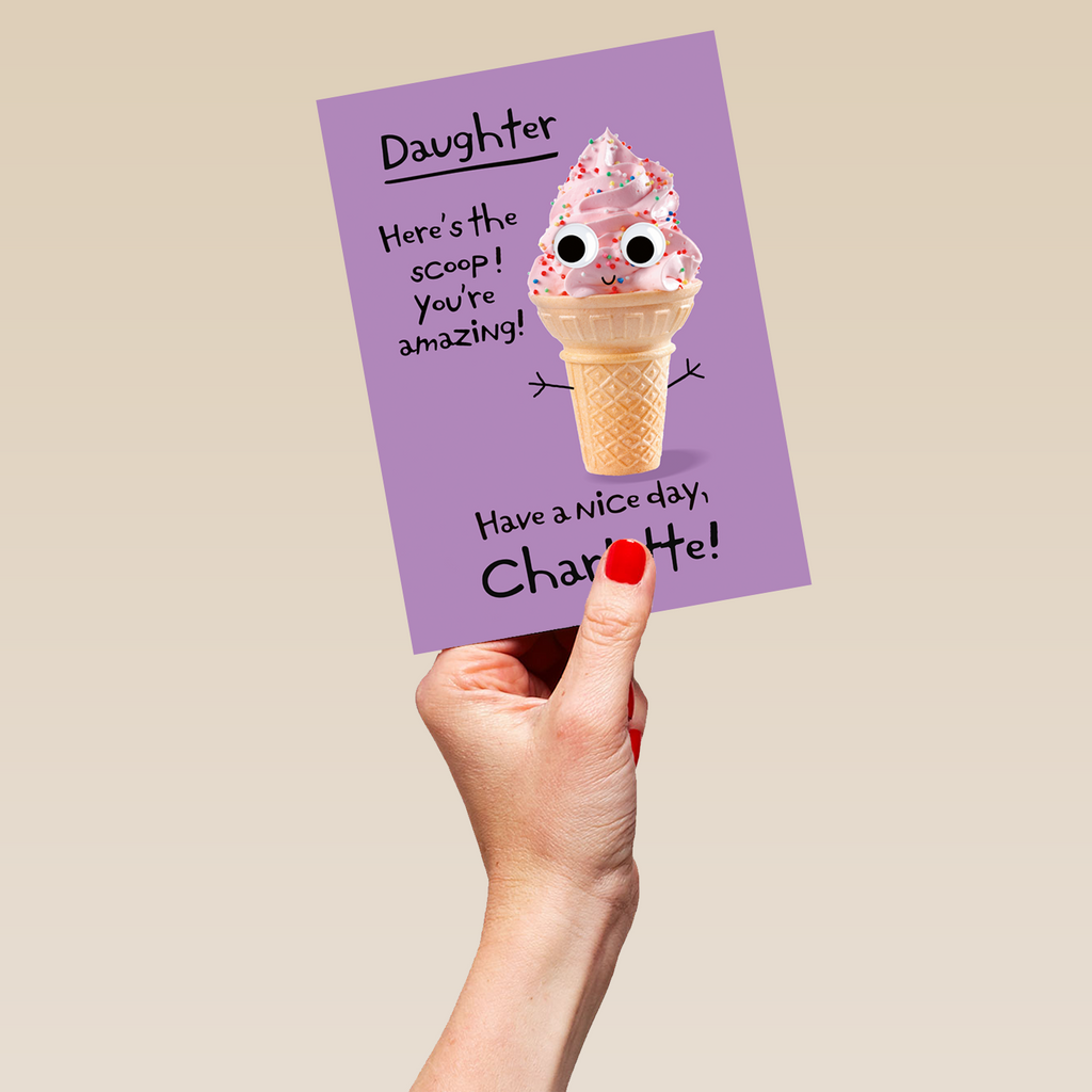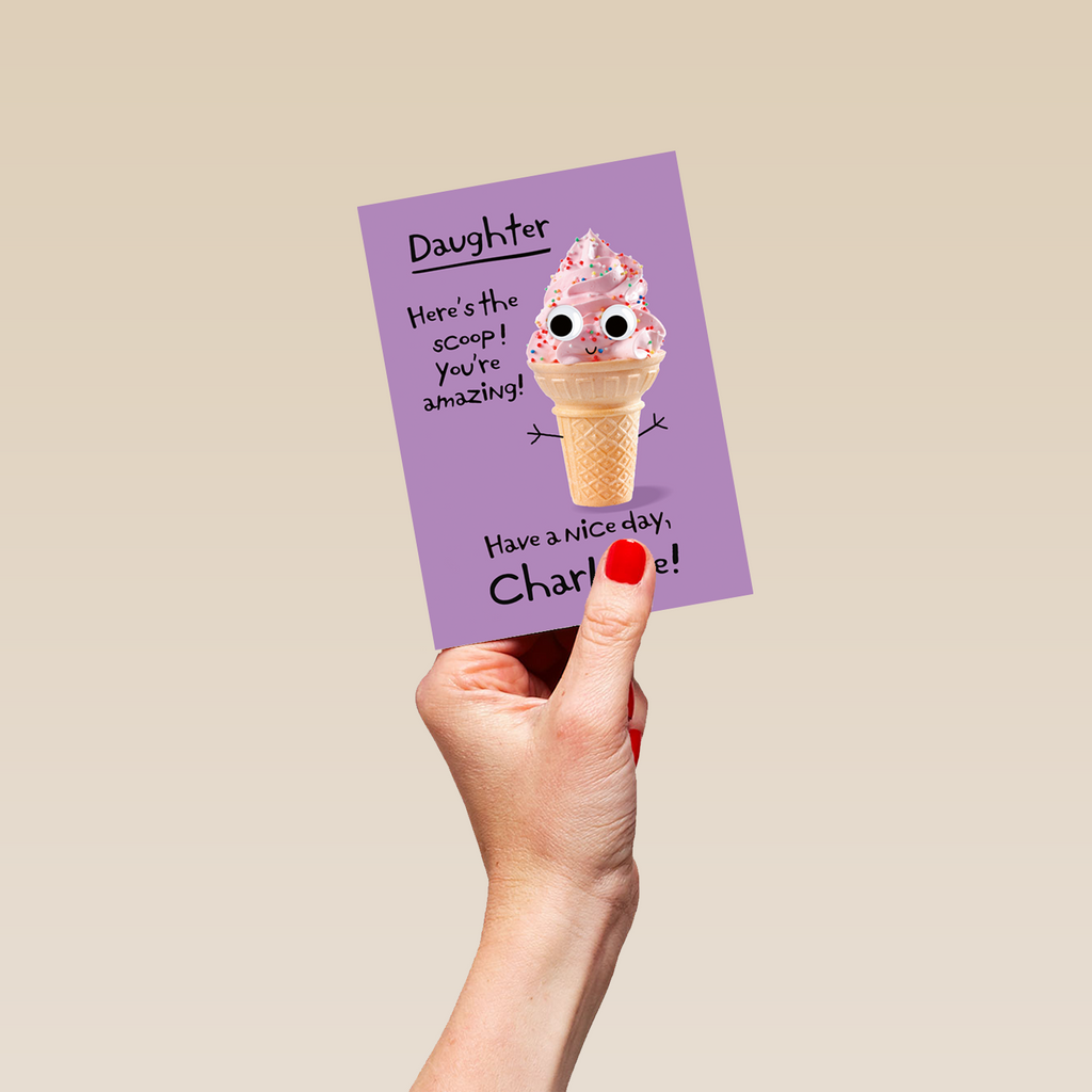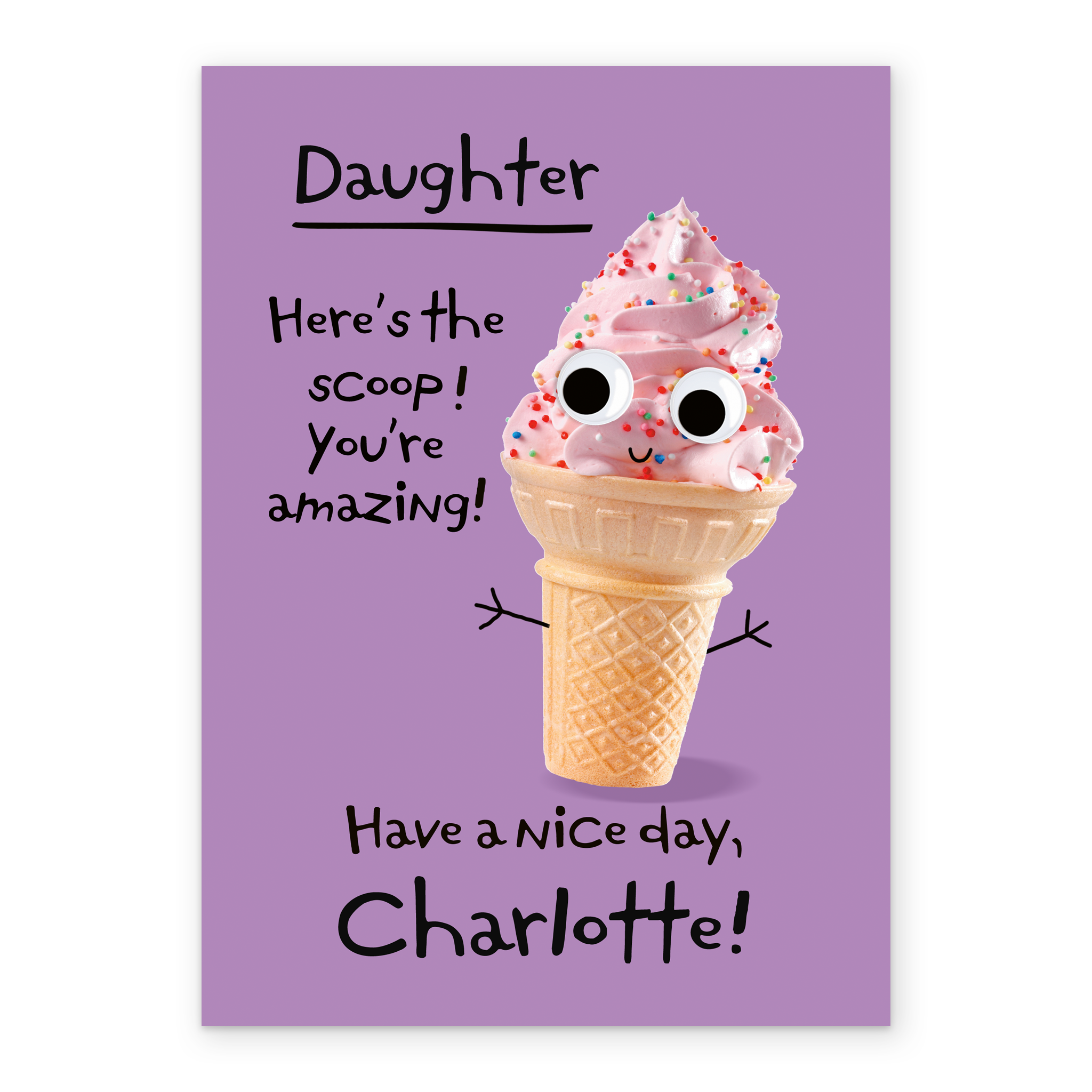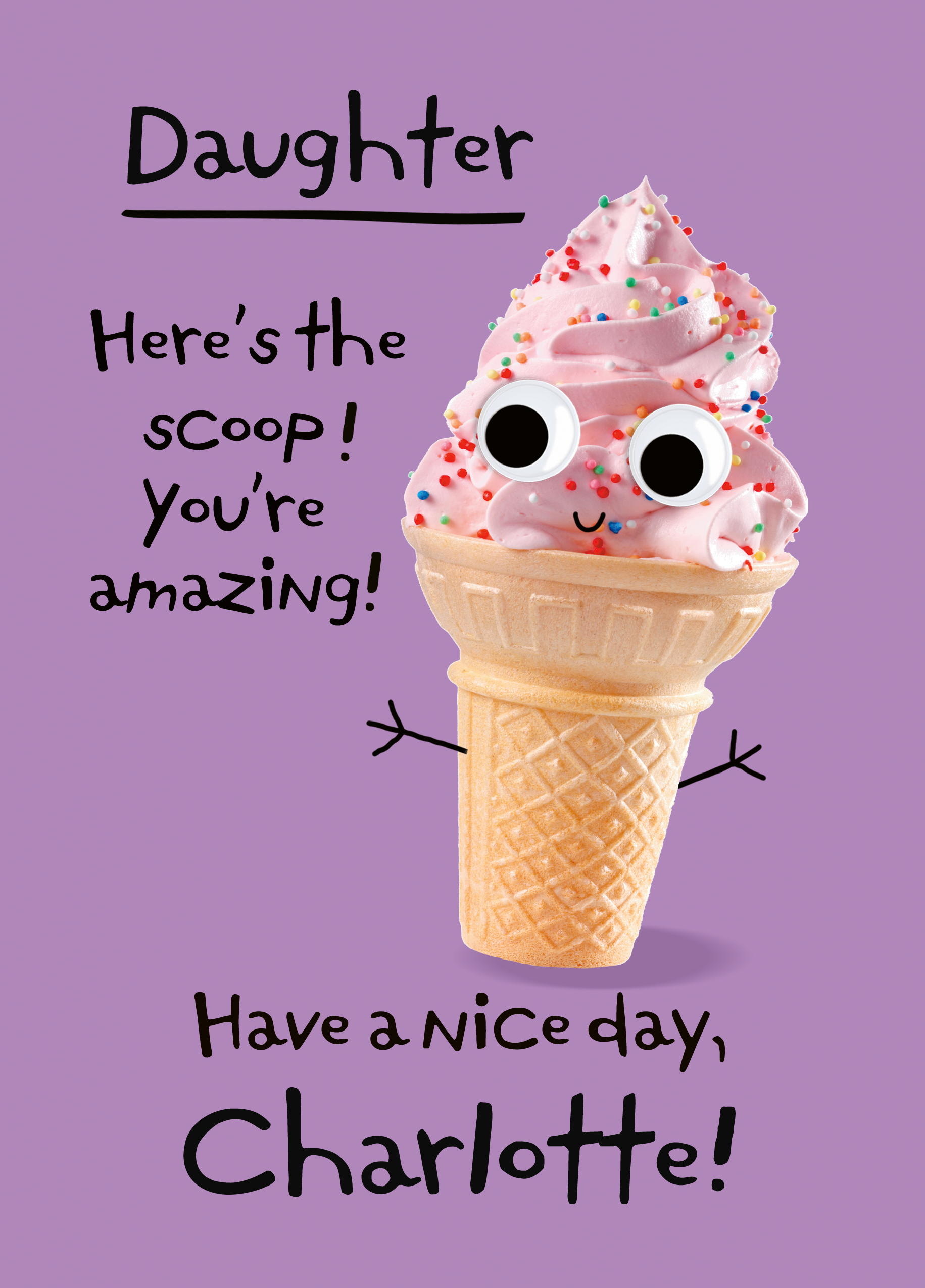 Printed on premium-quality board, this card features a photographic sprinkle covered, ice-cream in a half cone, embellished with illustrated arms, smile and 'googly' eyes, set against a bright purple background with black lettering above and below the image, with the message 'Daughter Here's the scoop! You're amazing! Have a nice day [NAME]!', space to personalise a name, and comes complete with a co-ordinating white envelope.