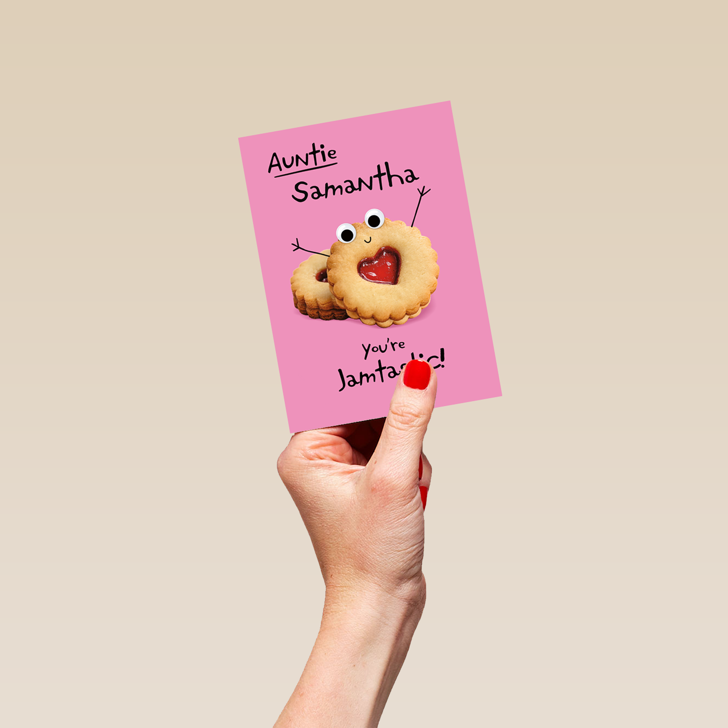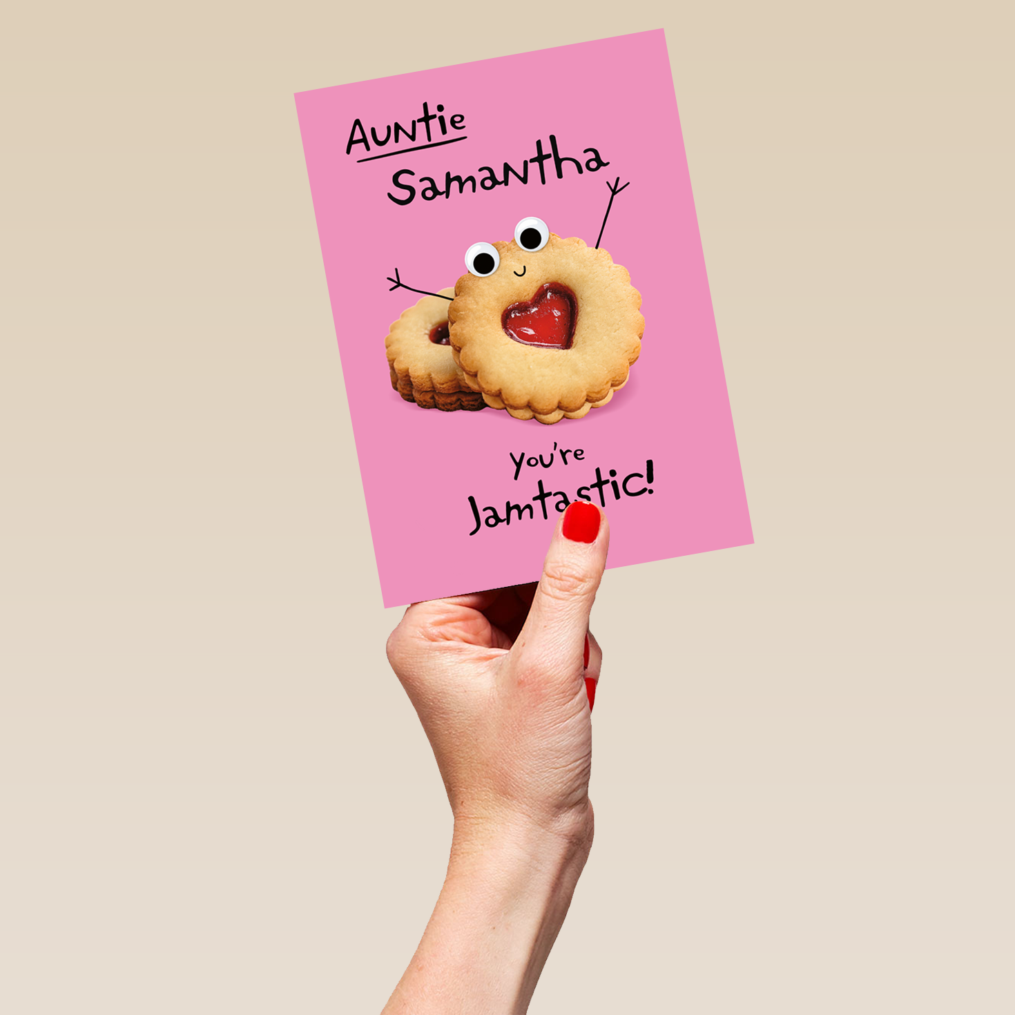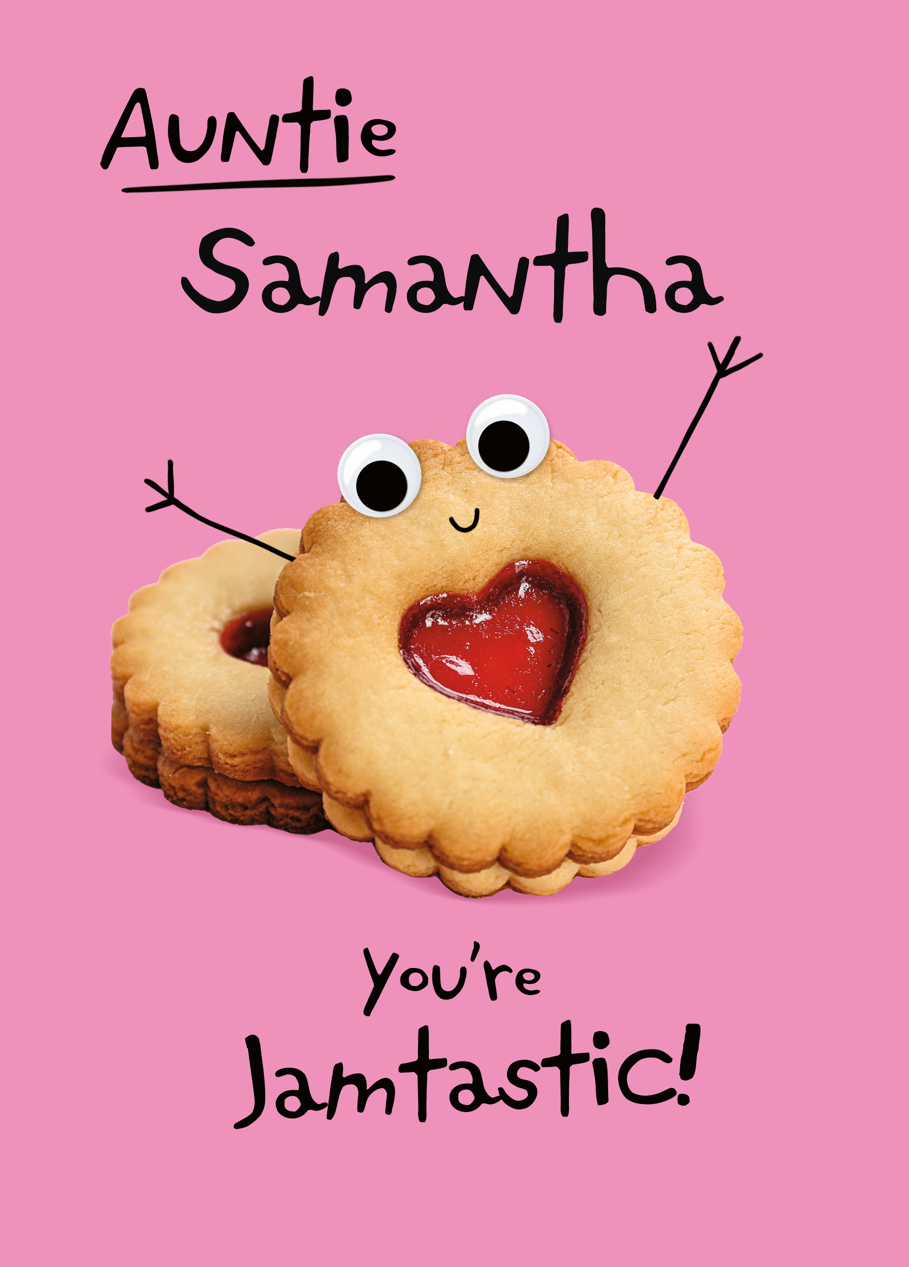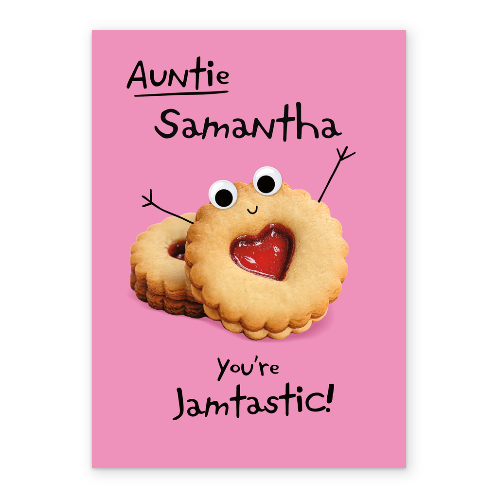 Printed on premium-quality board, this card features two photographic jam-centred biscuits, with the top one embellished with illustrated arms, smile and 'googly' eyes, set against a bright pink background with black lettering above and below the image, with the message 'Auntie [NAME] You're Jamtastic!', space to personalise a name, and comes complete with a co-ordinating white envelope.