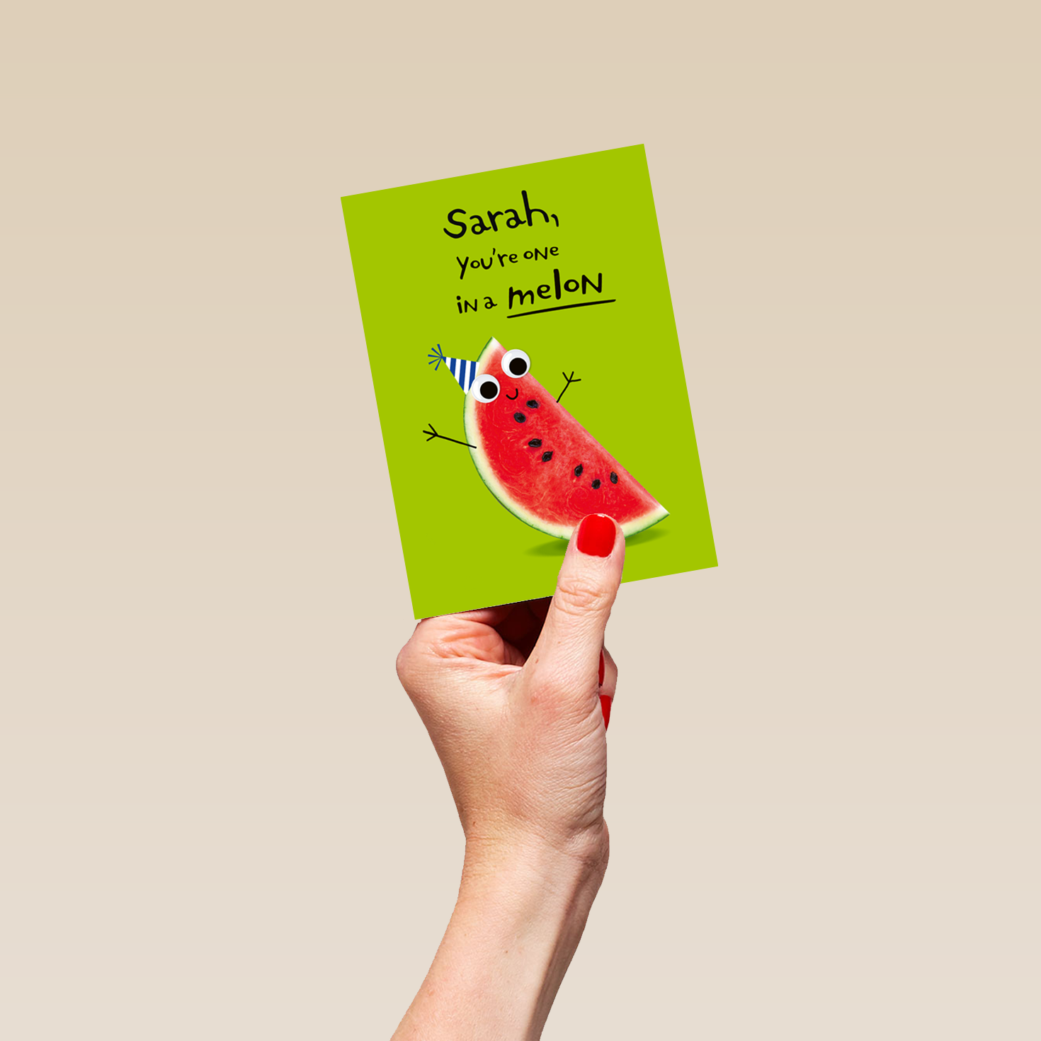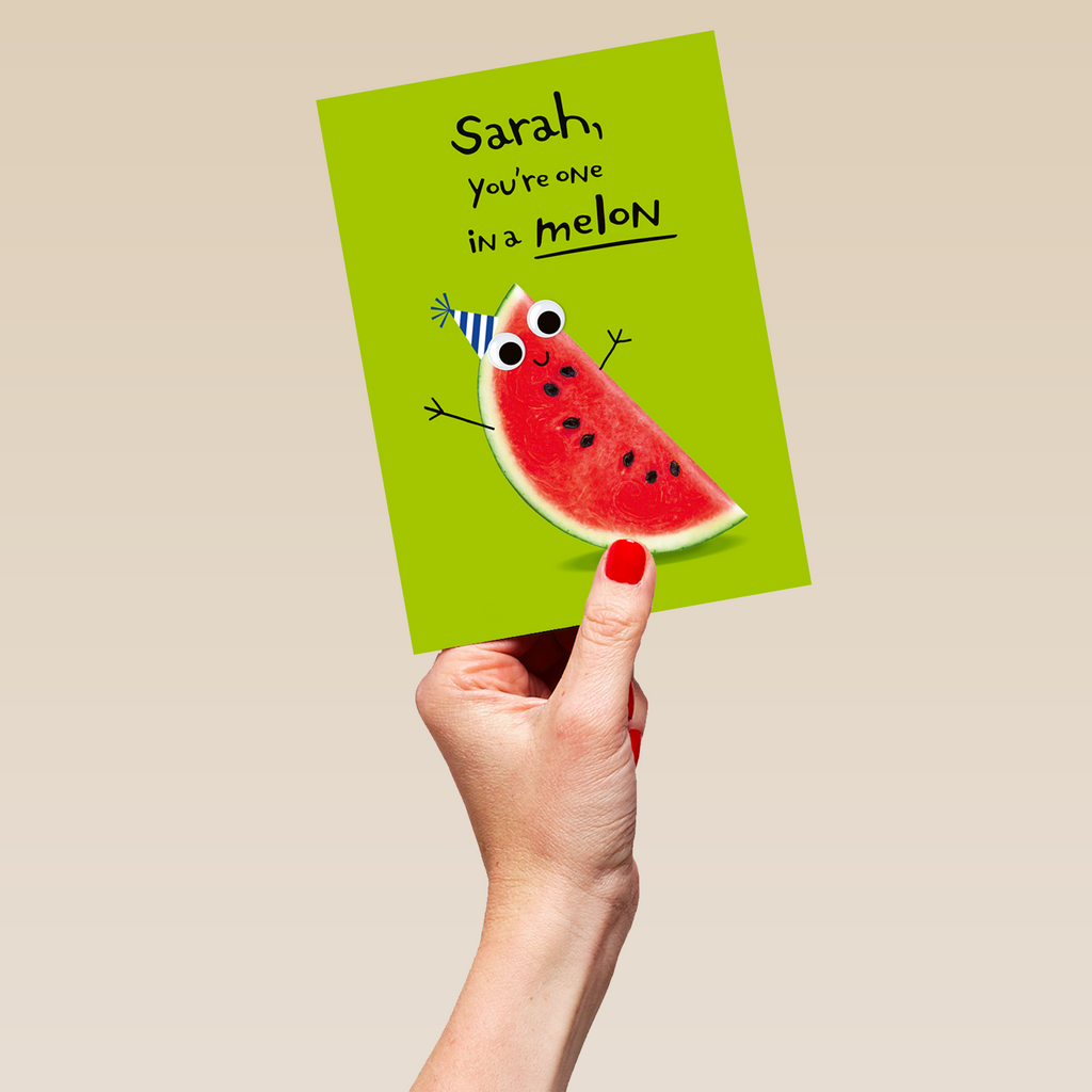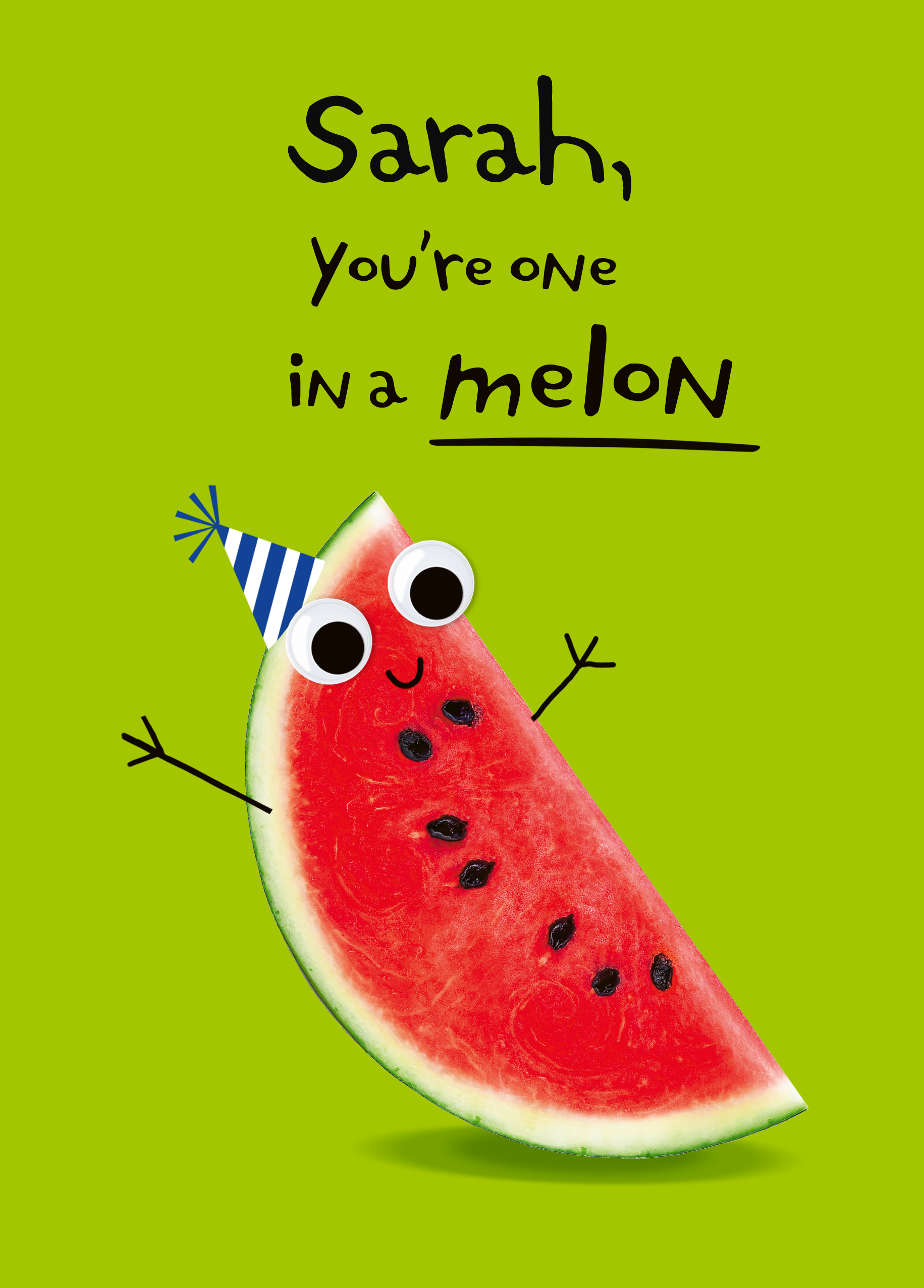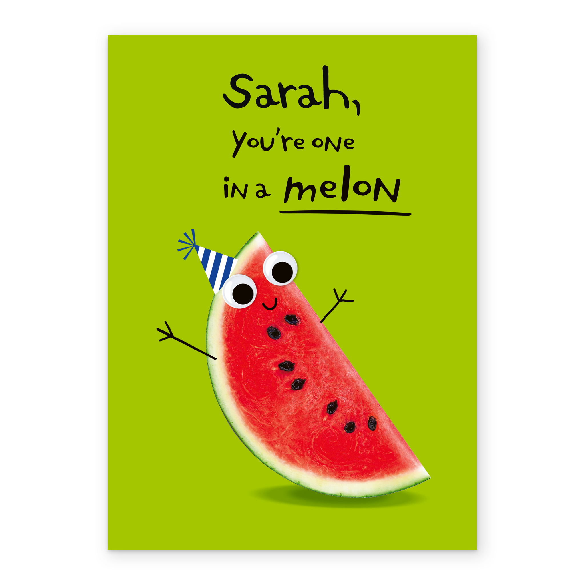 Printed on premium-quality board, this card features a photographic slice of watermelon, embellished with illustrated arms, party hat, smile and 'googly' eyes, set against a two-tone bright green background with black lettering above the image, with the message '[NAME] you're one in a melon', space to personalise a name, and comes complete with a co-ordinating white envelope.