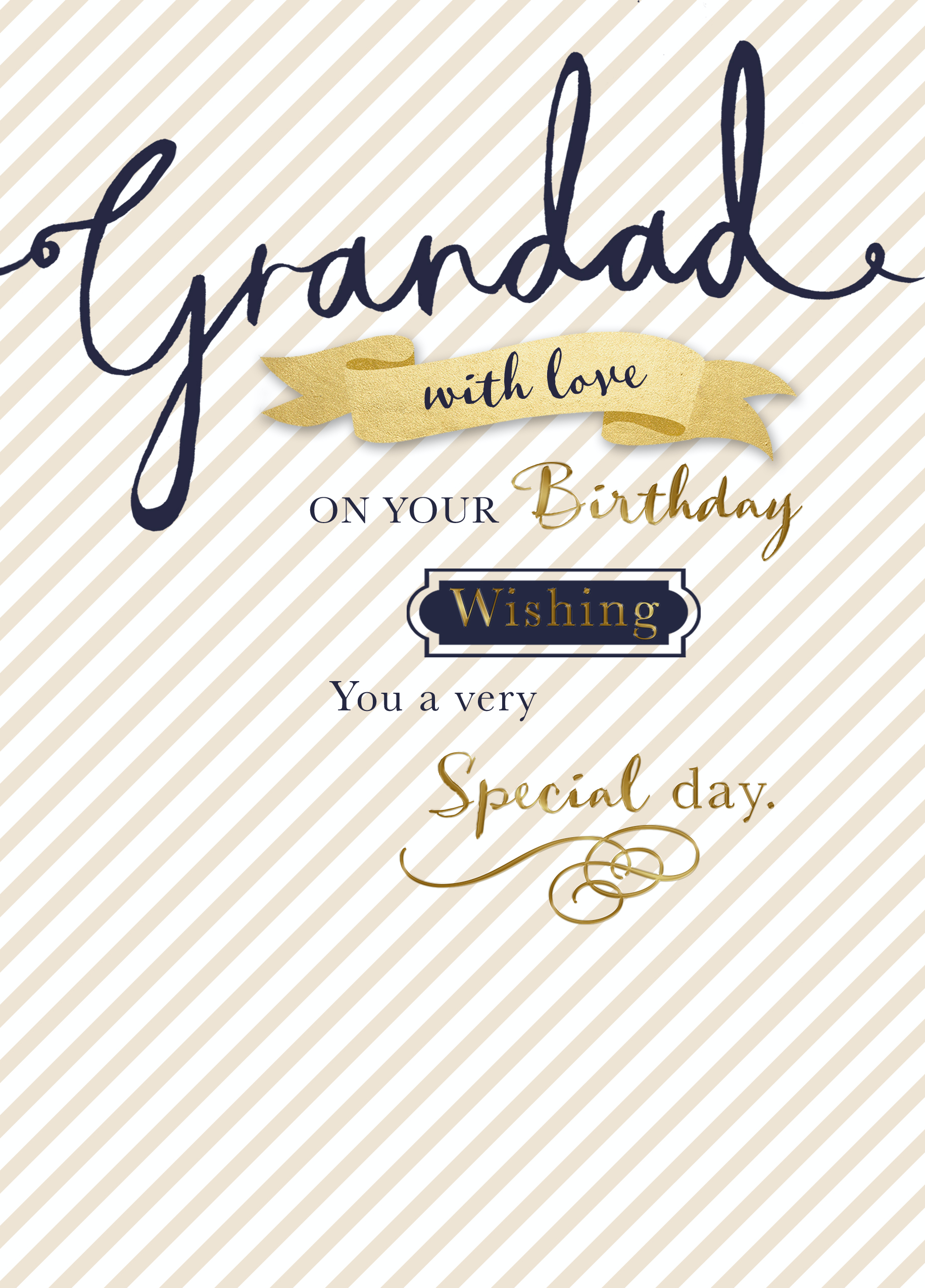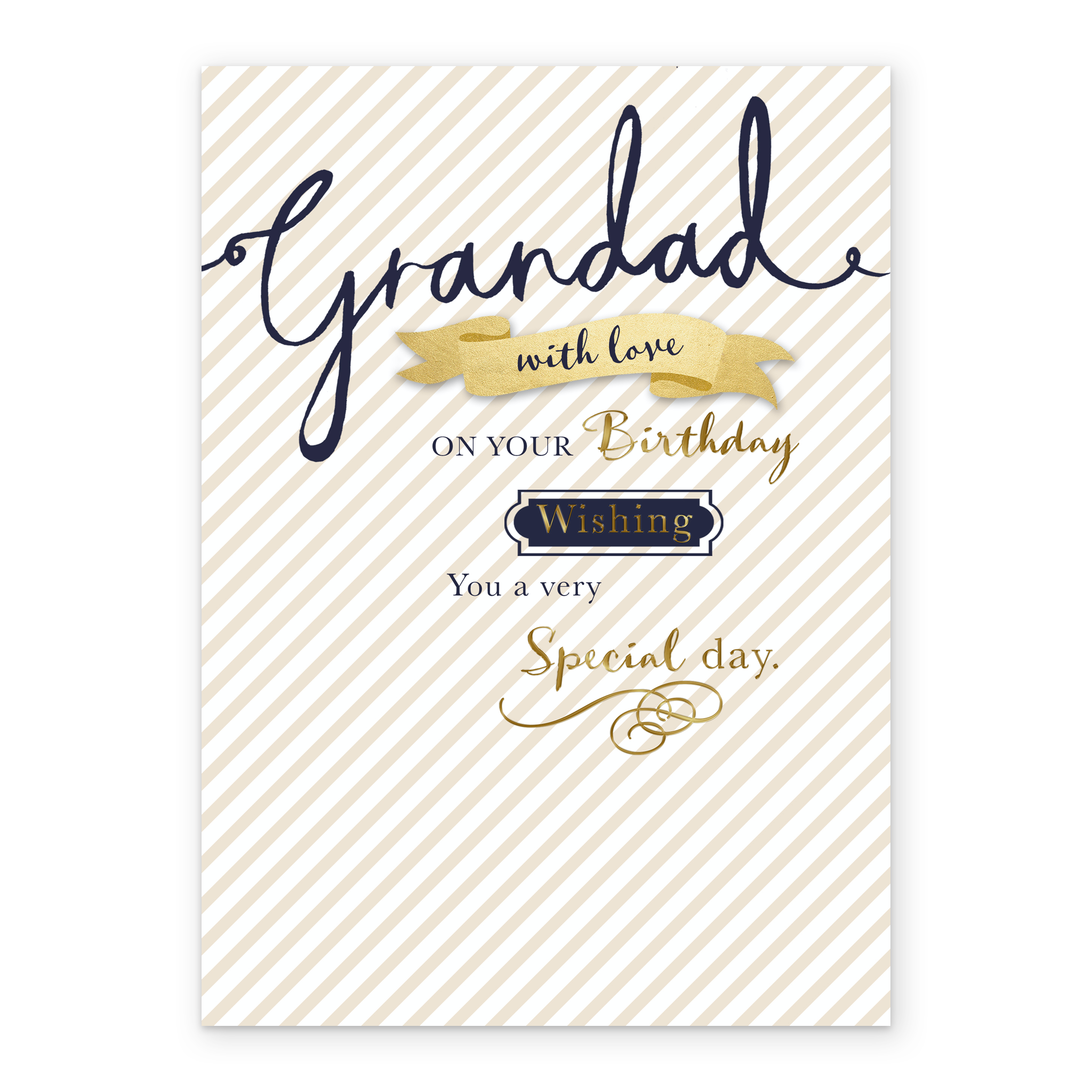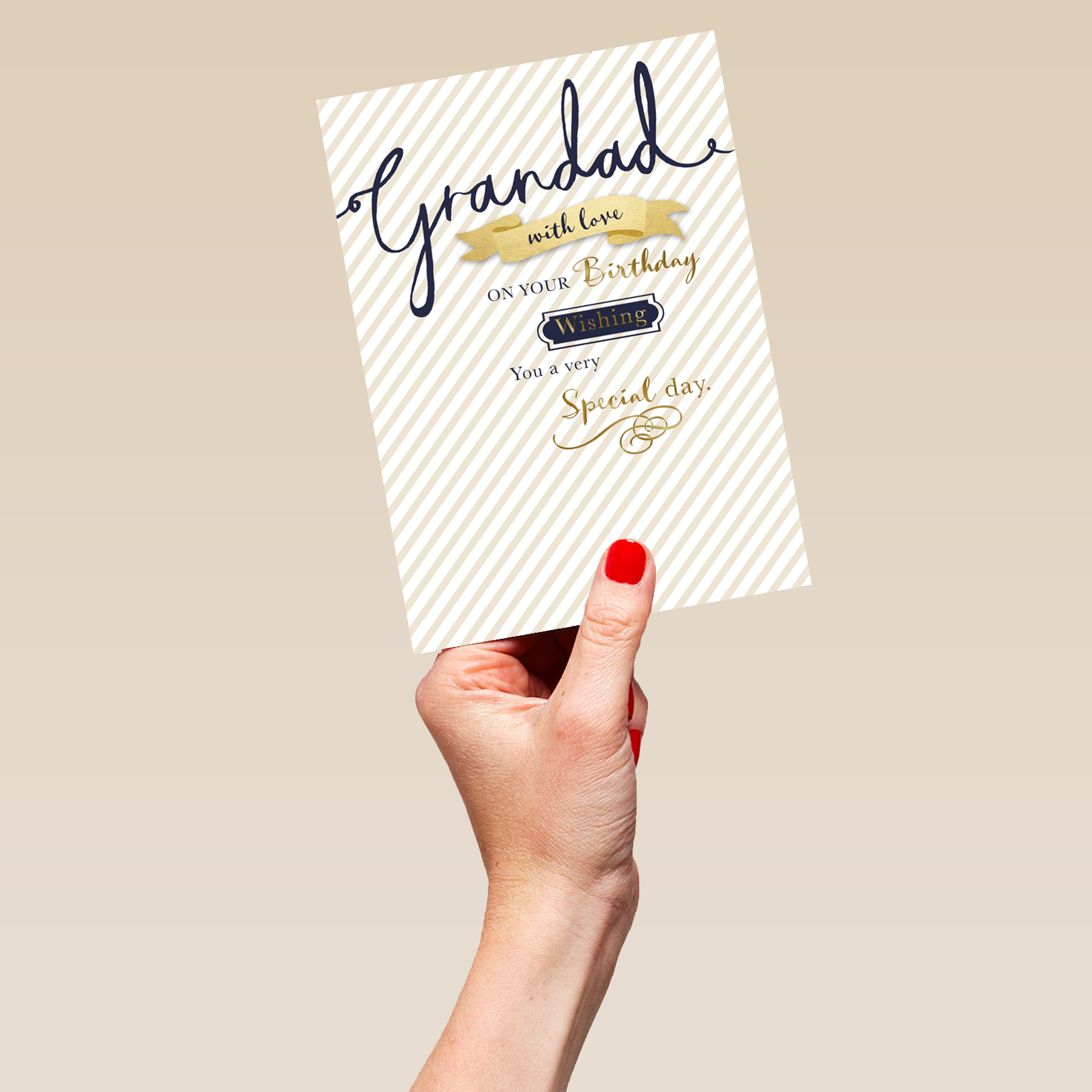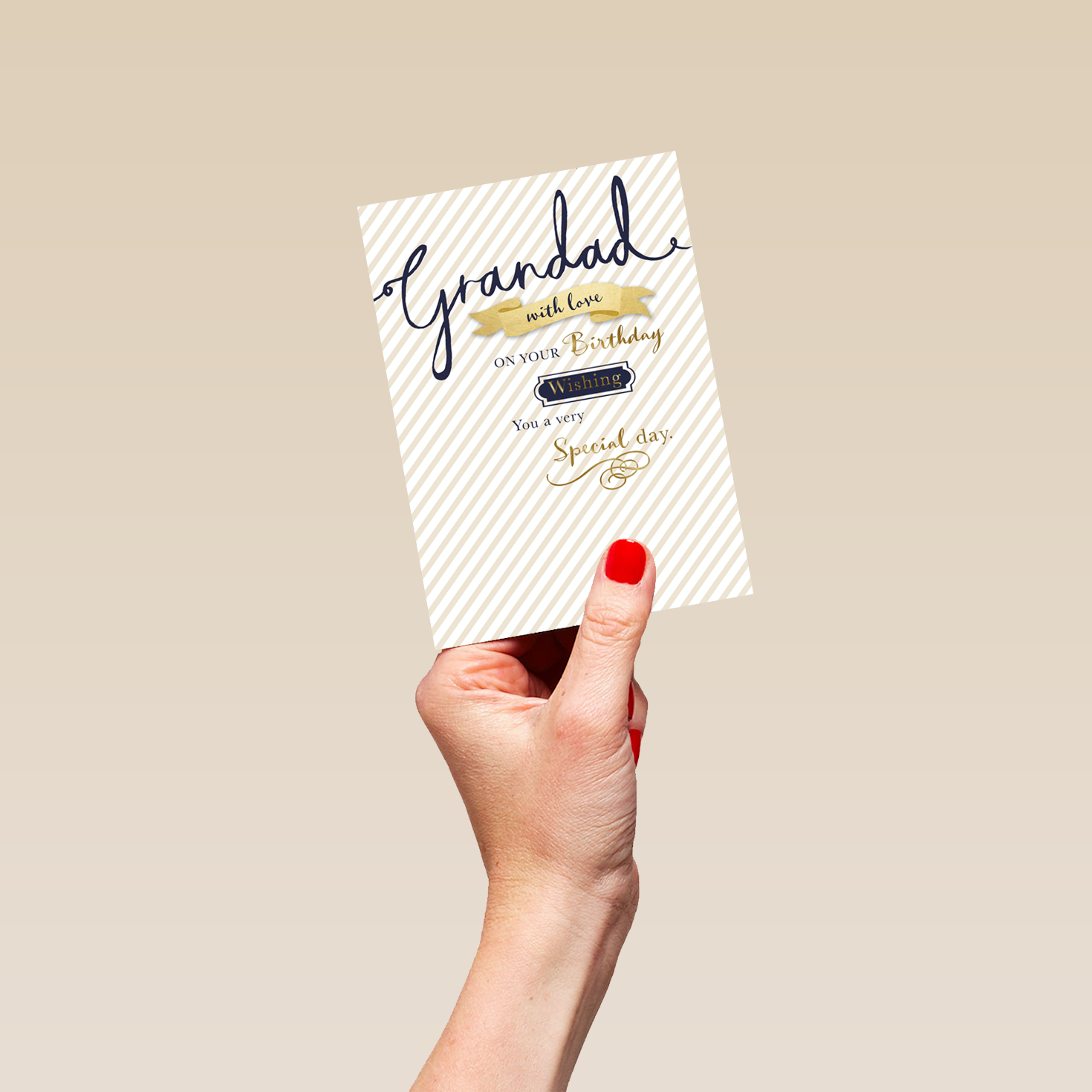 Show them you care with a personalised grandad with love birthday card from Hallmark. Our greetings cards are printed on premium quality, FSC®-certified card & delivered nationwide. This card is available as standard 12cm by 16.7cm and large 15.5cm by 21.6cm.