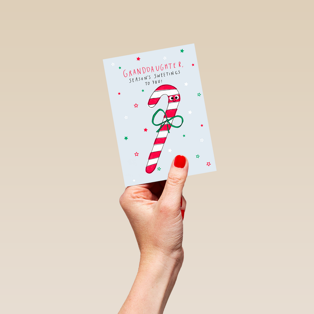 Show them you care with a personalised granddaughter candy cane card from Hallmark. Our Christmas cards are printed on premium quality, FSC®-certified card & delivered nationwide. This card is available as standard 12cm by 16.7cm and large 15.5cm by 21.6cm.