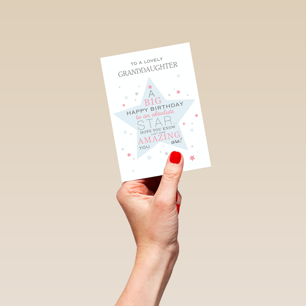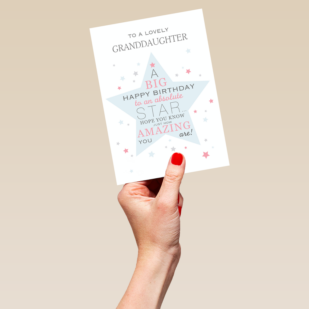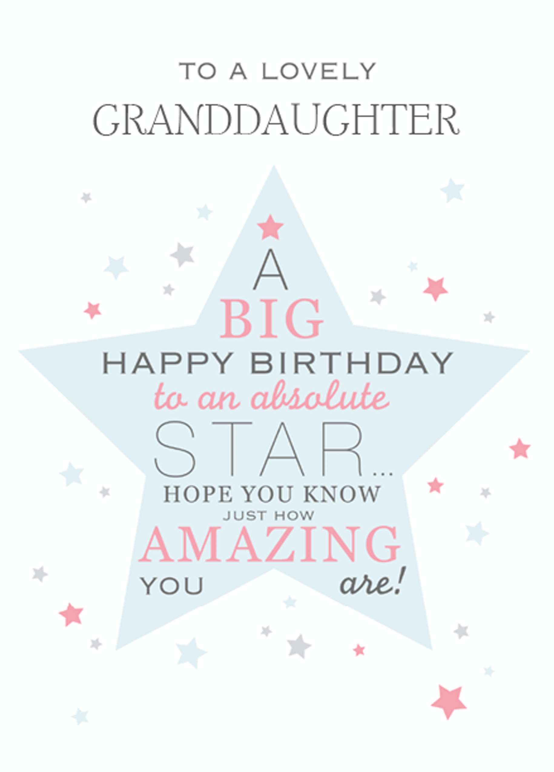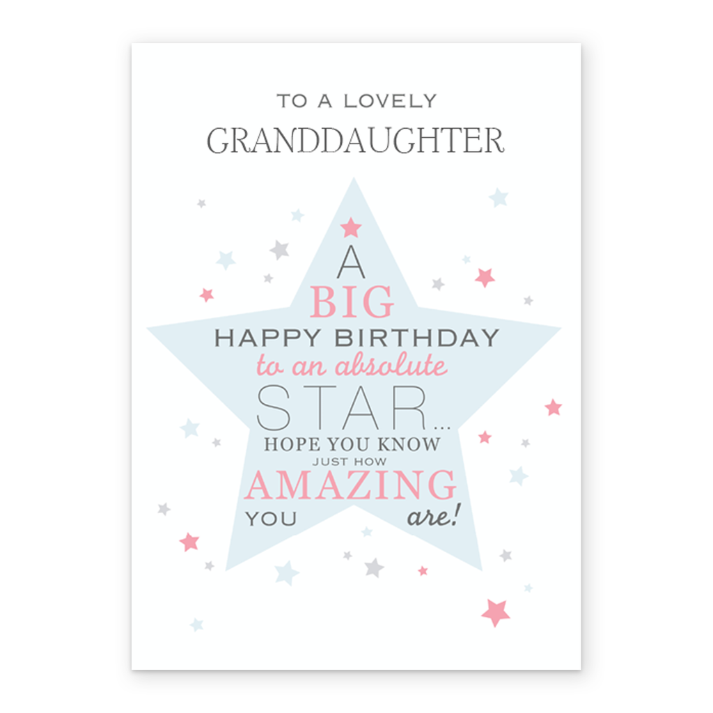 Show them you care with a personalised granddaughter contemporary star card from Hallmark. Our birthday cards are printed on premium quality, FSC®-certified card & delivered nationwide. This card is available as standard 12cm by 16.7cm and large 15.5cm by 21.6cm.