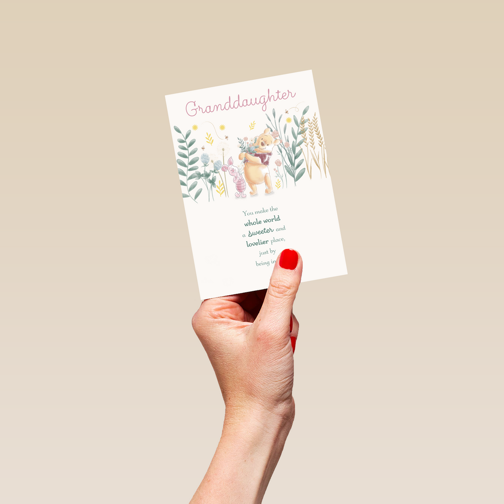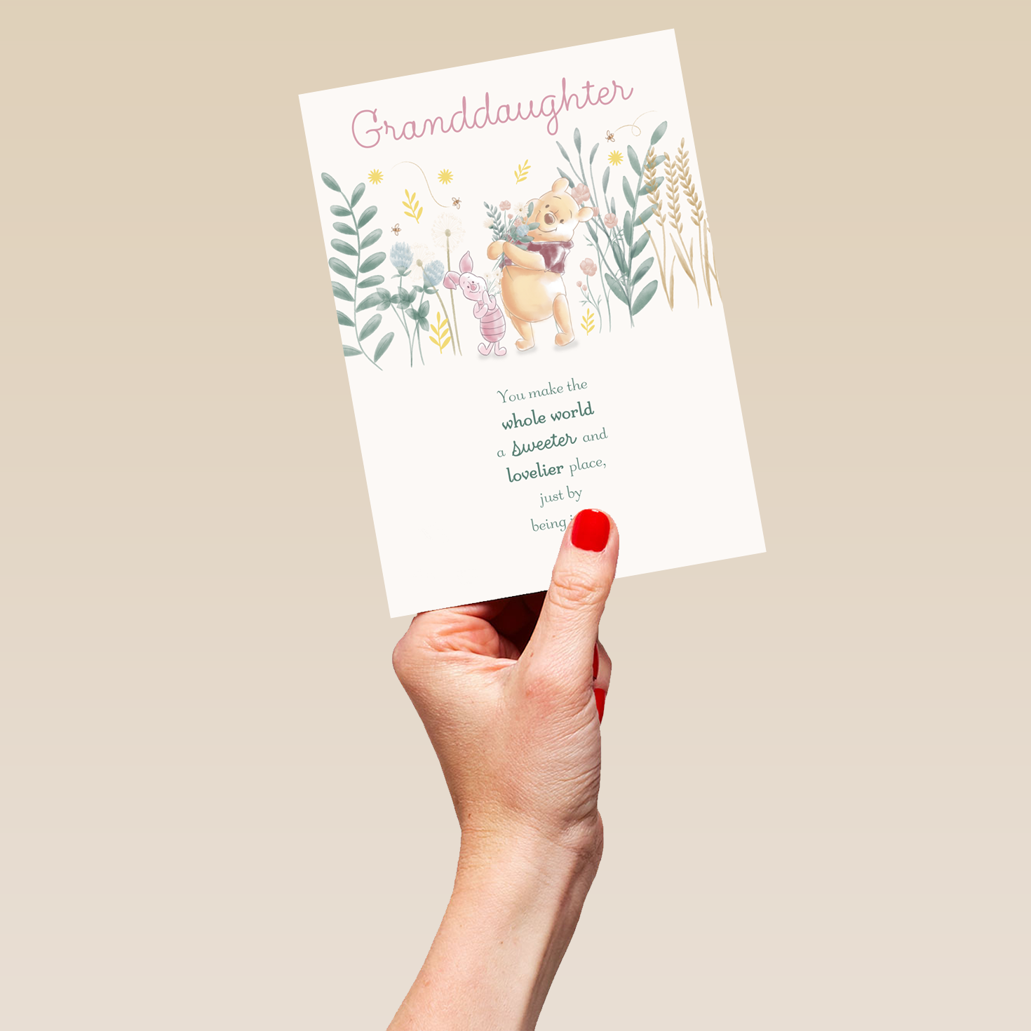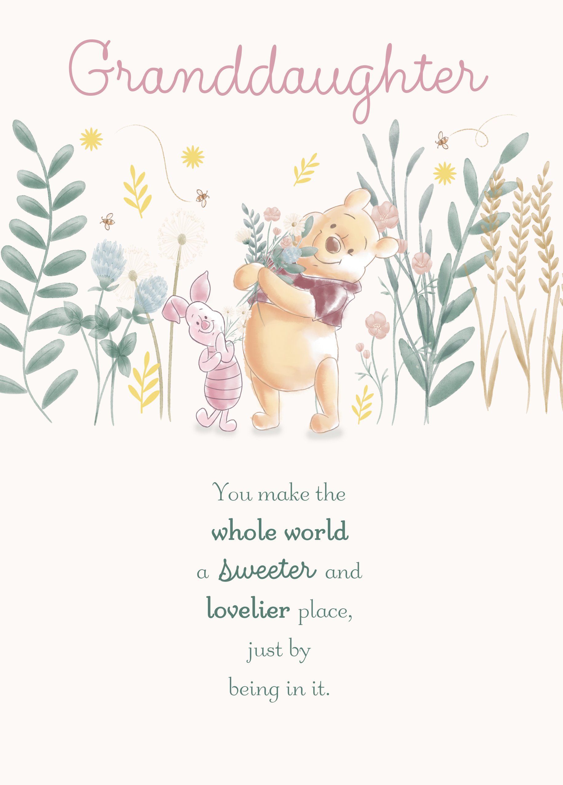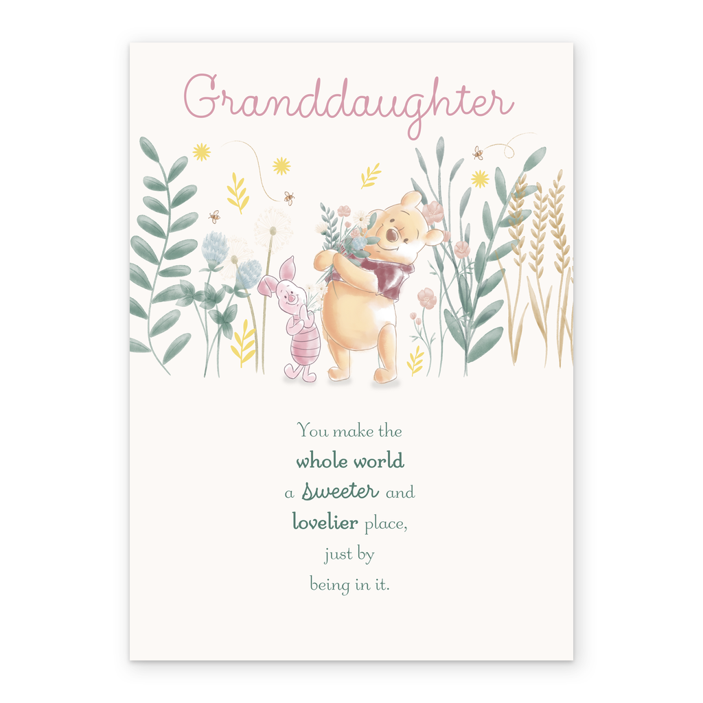 Printed on premium-quality board, this card features an adorable design of Winnie the Pooh and Piglet, with the message ‘Granddaughter, you make the whole world a sweeter and lovelier place, just by being in it', space to personalise a name, and comes complete with a co-ordinating white envelope.