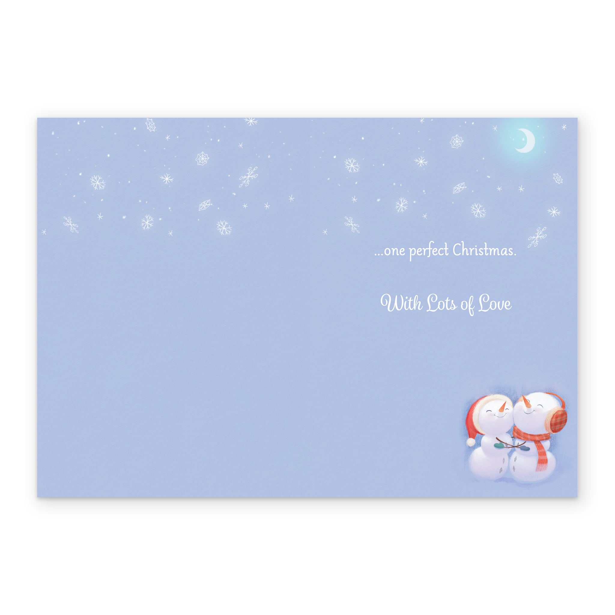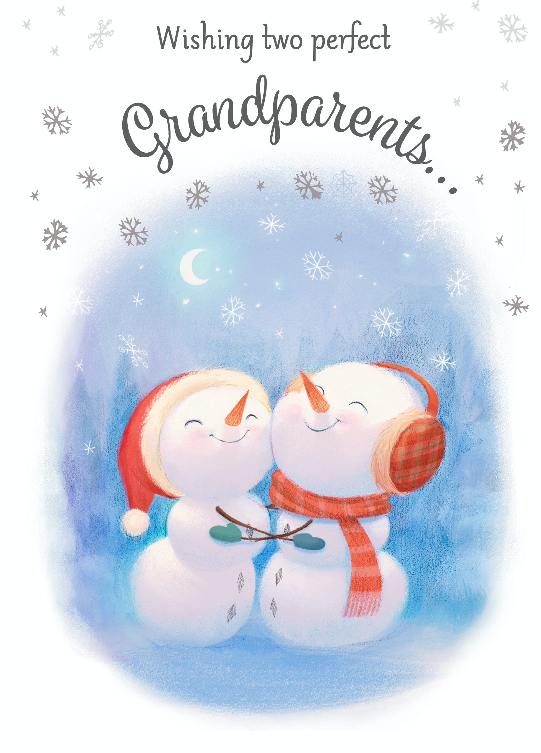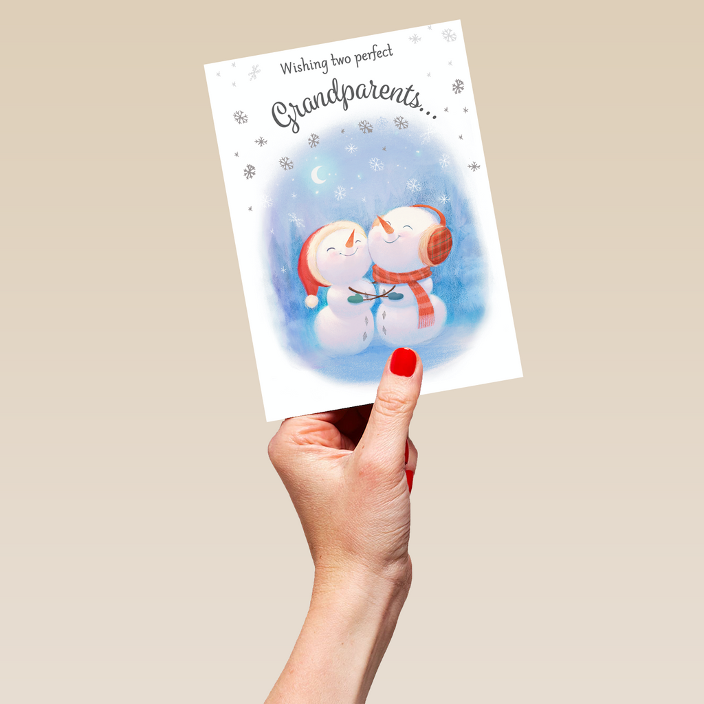 Show them you care with a personalised grandparents cute snowmen card from Hallmark. Our Christmas cards are printed on premium quality, FSC®-certified card & delivered nationwide. This card is available as standard 12cm by 16.7cm and large 15.5cm by 21.6cm.