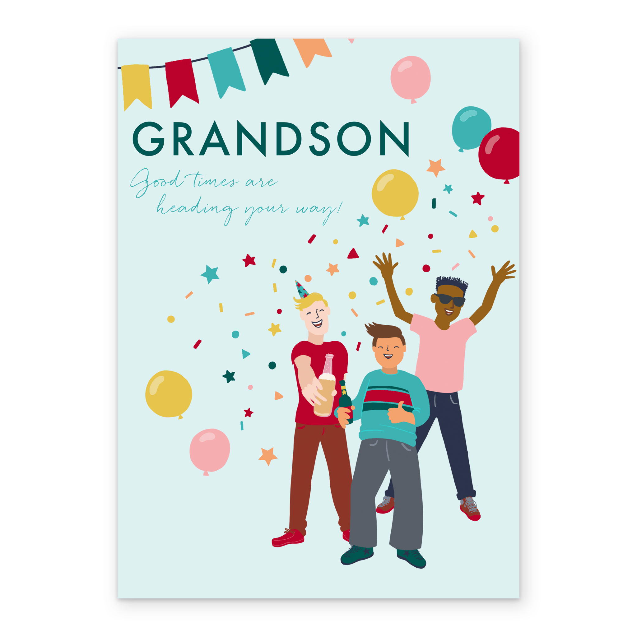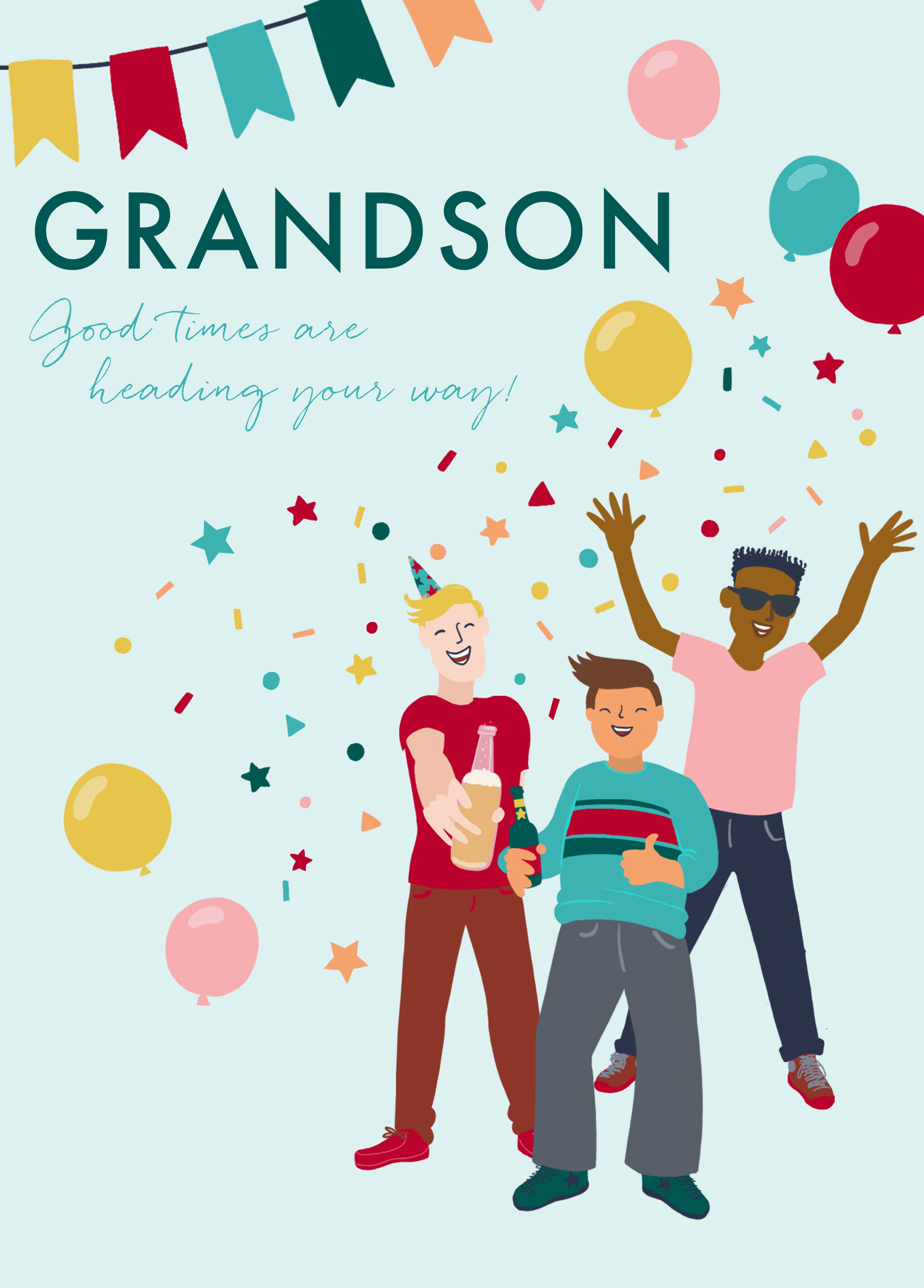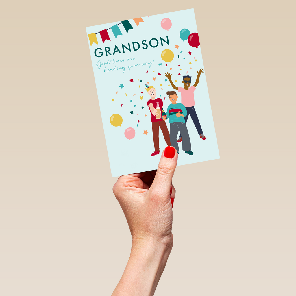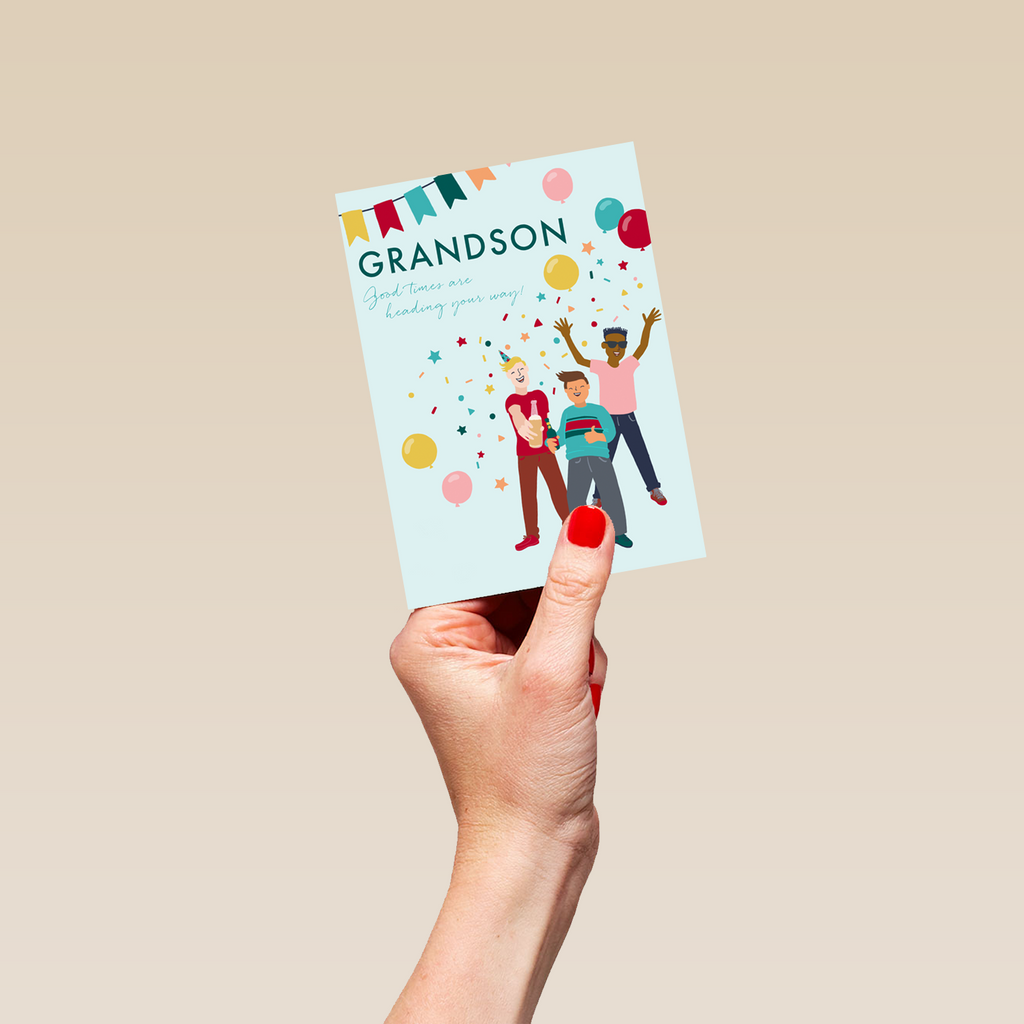 Show them you care with a personalised grandson party birthday card from Hallmark. Our greetings cards are printed on premium quality, FSC®-certified card & delivered nationwide. This card is available as standard 12cm by 16.7cm and large 15.5cm by 21.6cm.