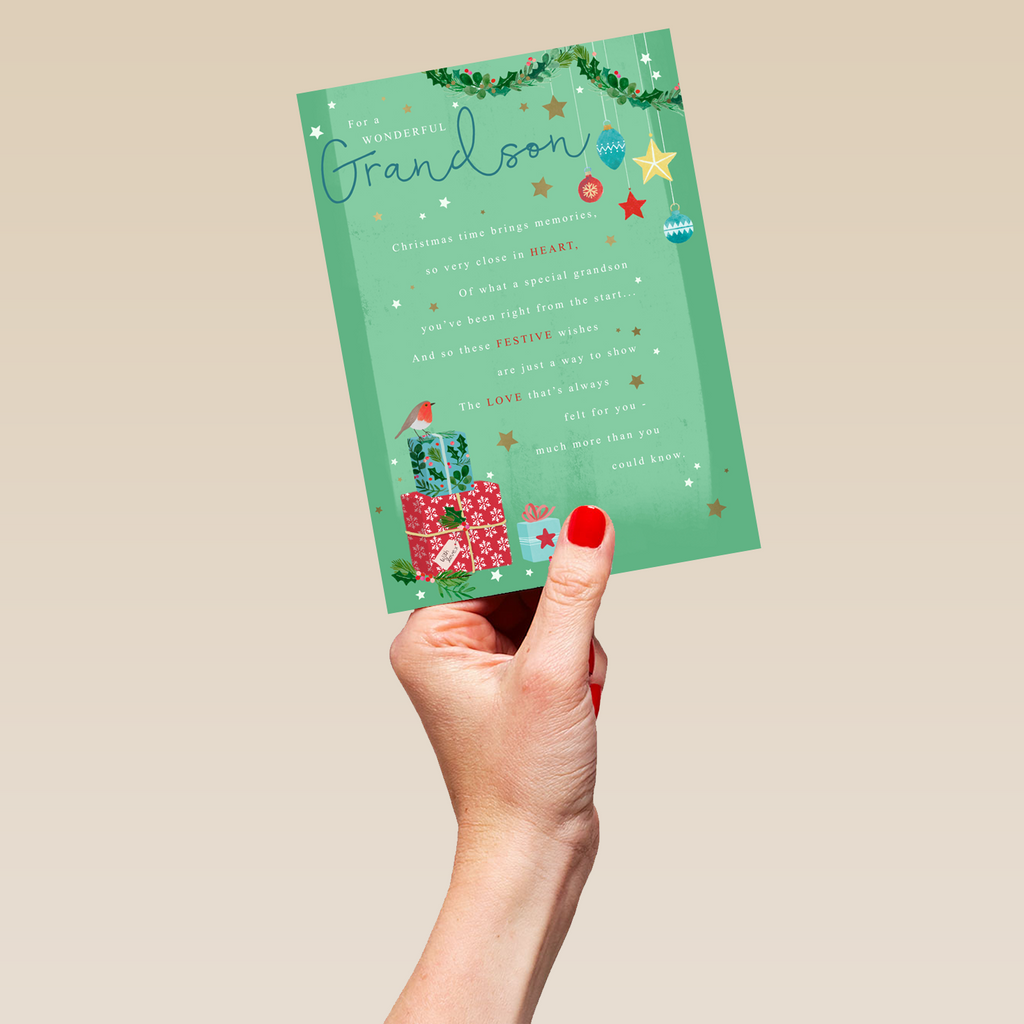 Show them you care with a personalised grandson presents verse traditional Christmas card from Hallmark. Our greetings cards are printed on premium quality, FSC®-certified card & delivered nationwide. This card is available as standard 12cm by 16.7cm and large 15.5cm by 21.6cm.