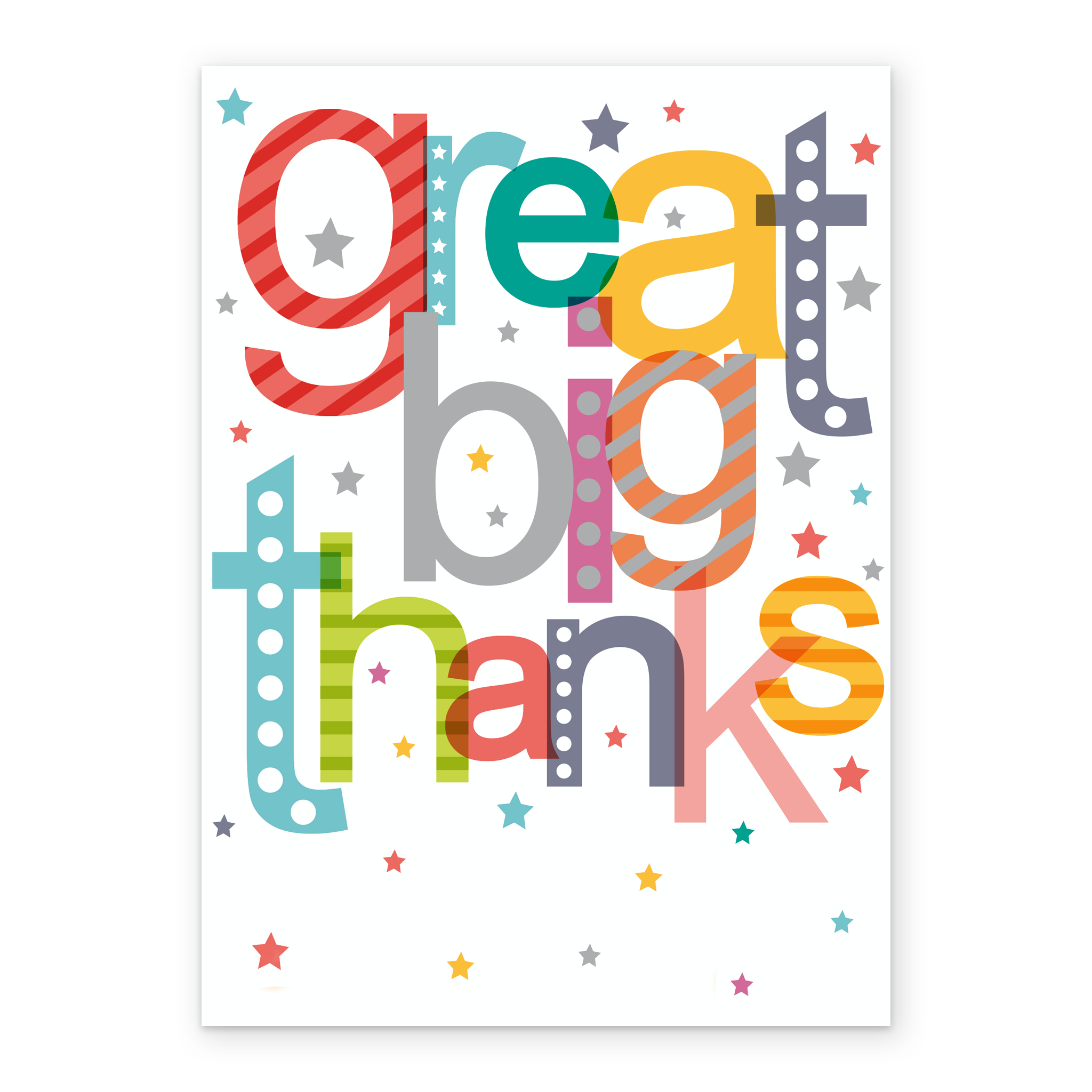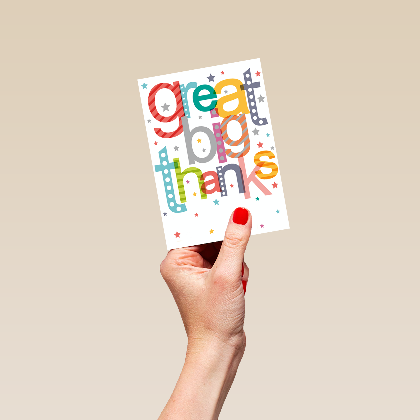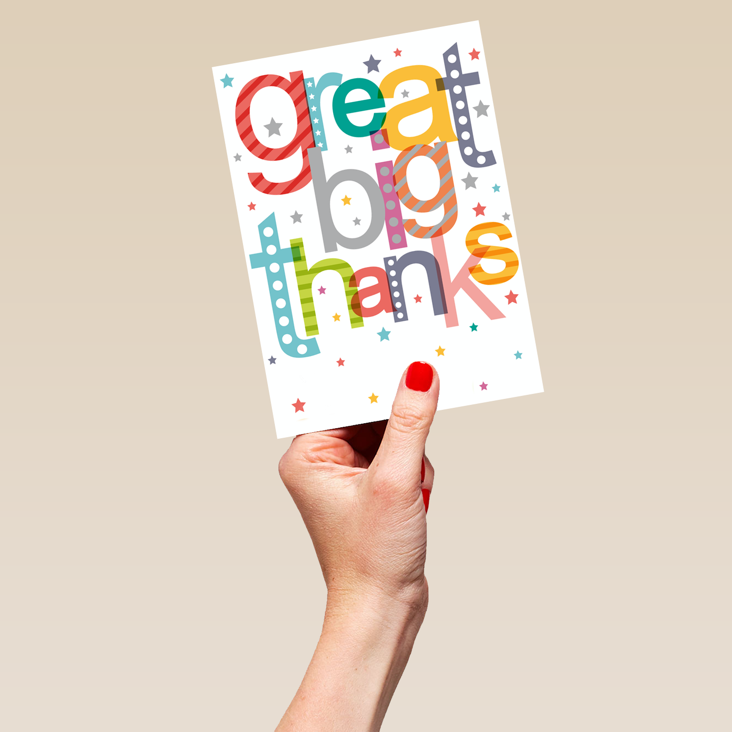 Show them you care with a personalised great big thanks card from Hallmark. Our thank you cards are printed on premium quality, FSC®-certified card & delivered nationwide. This card is available as standard 12cm by 16.7cm and large 15.5cm by 21.6cm.