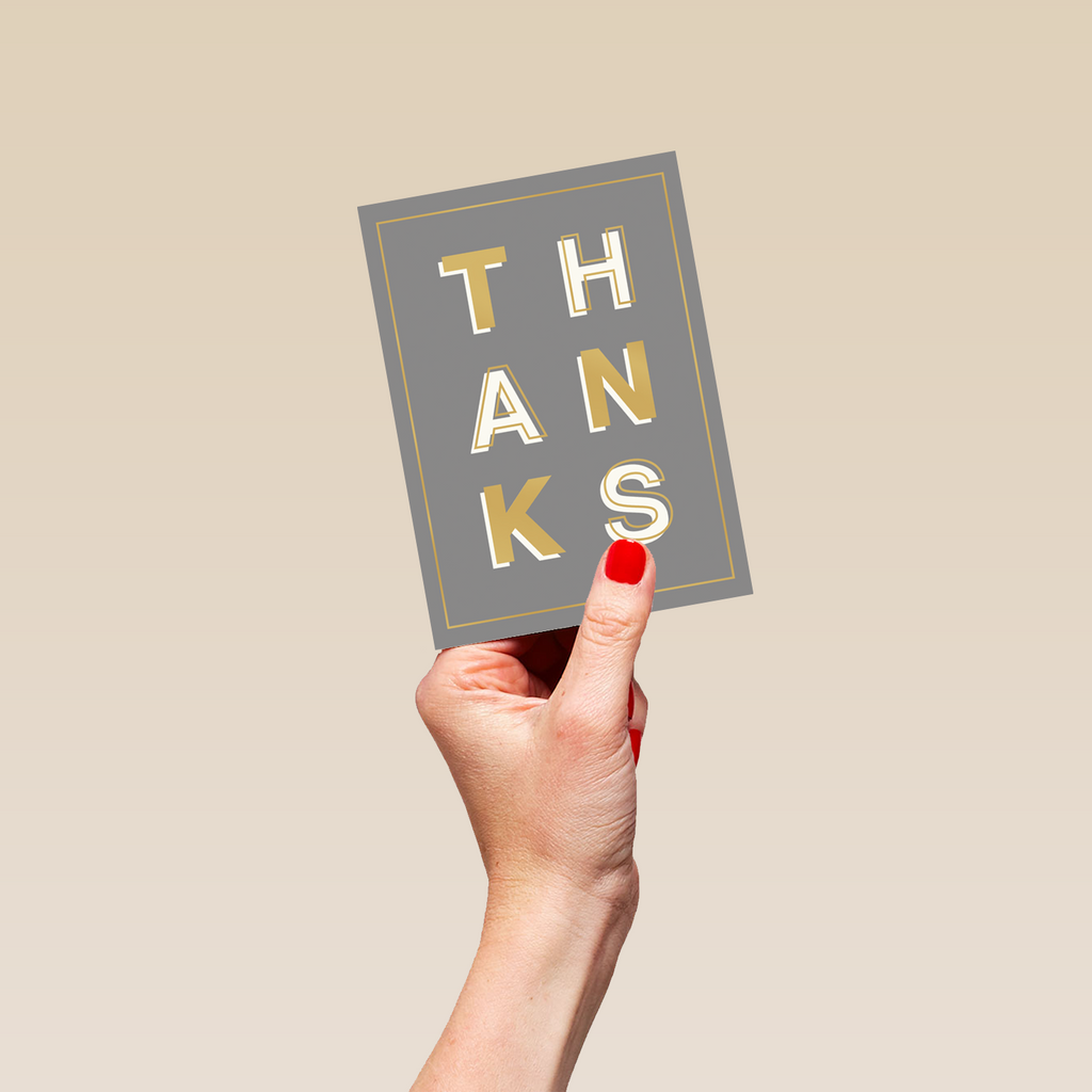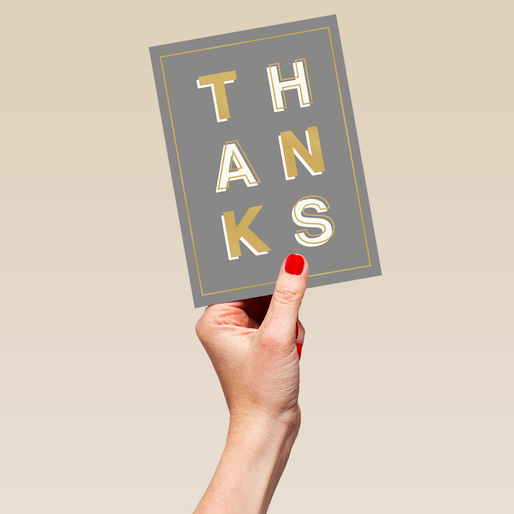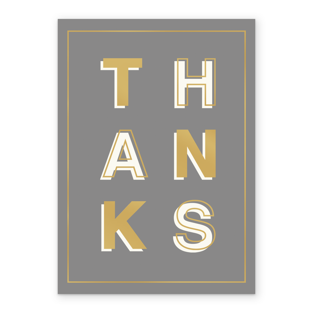 Printed on premium-quality board, this card features a grey background with a gold coloured line border, with the message 'Thanks', and comes complete with a co-ordinating white envelope.
