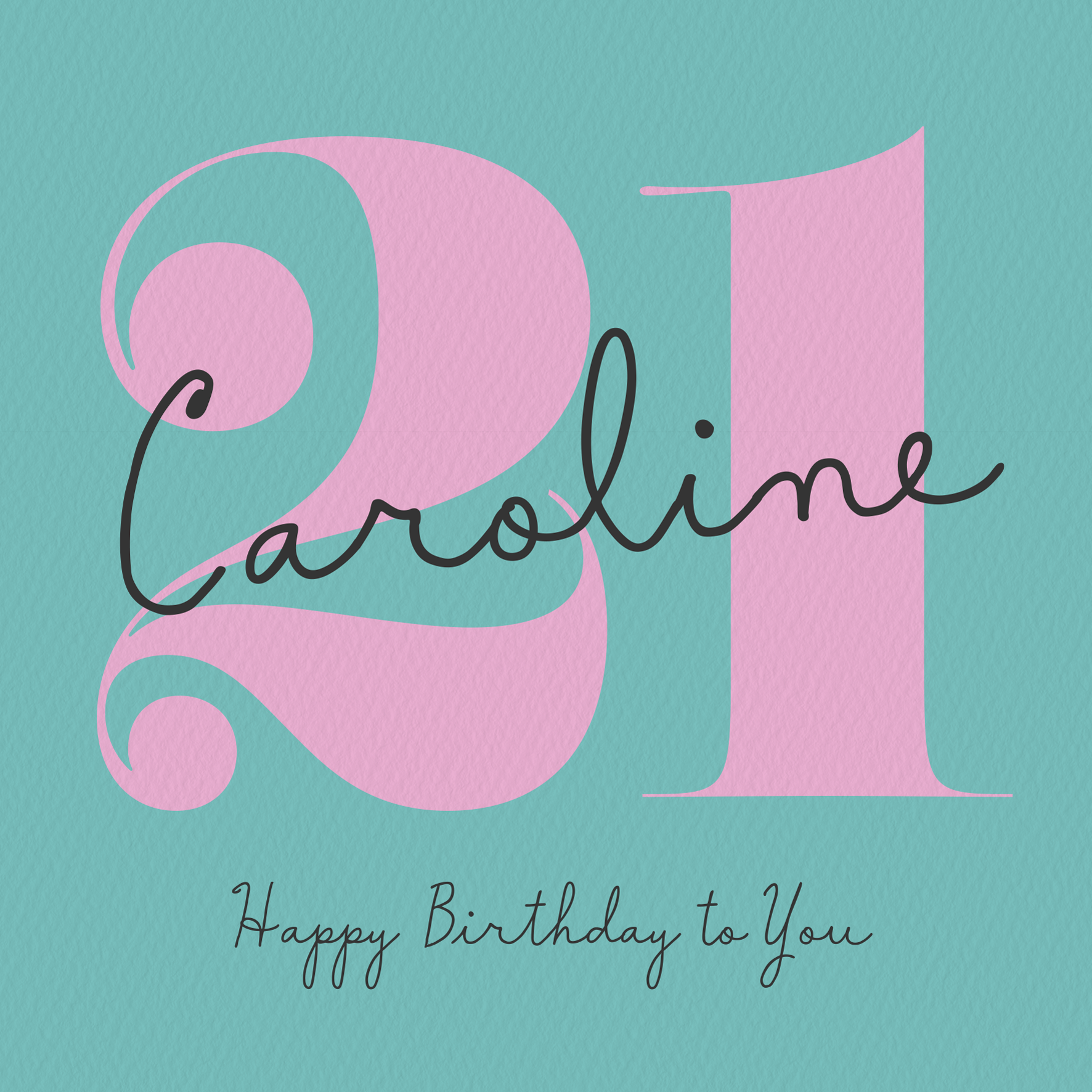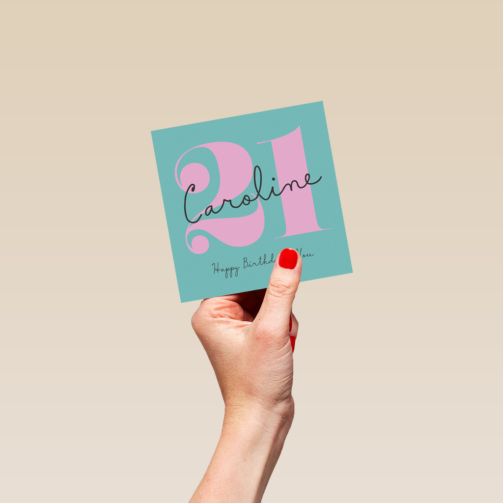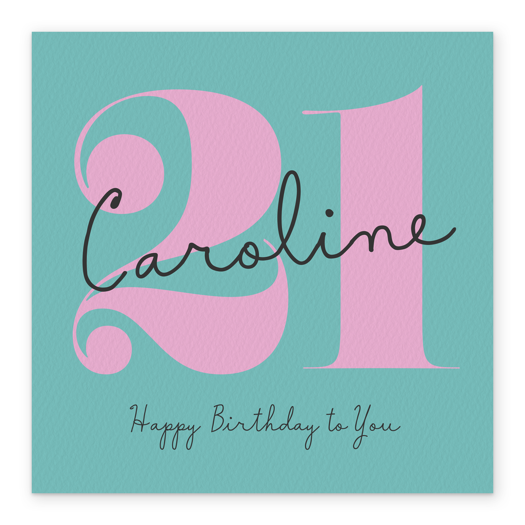 Printed on premium-quality board, this card features a large pink number twenty-one with cursive black text on a green background, with the message '21 Happy Birthday To You', space to personalise a name, and comes complete with a co-ordinating white envelope.