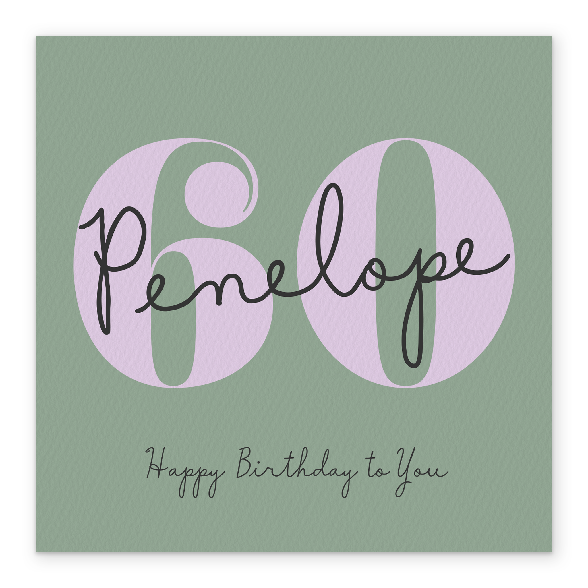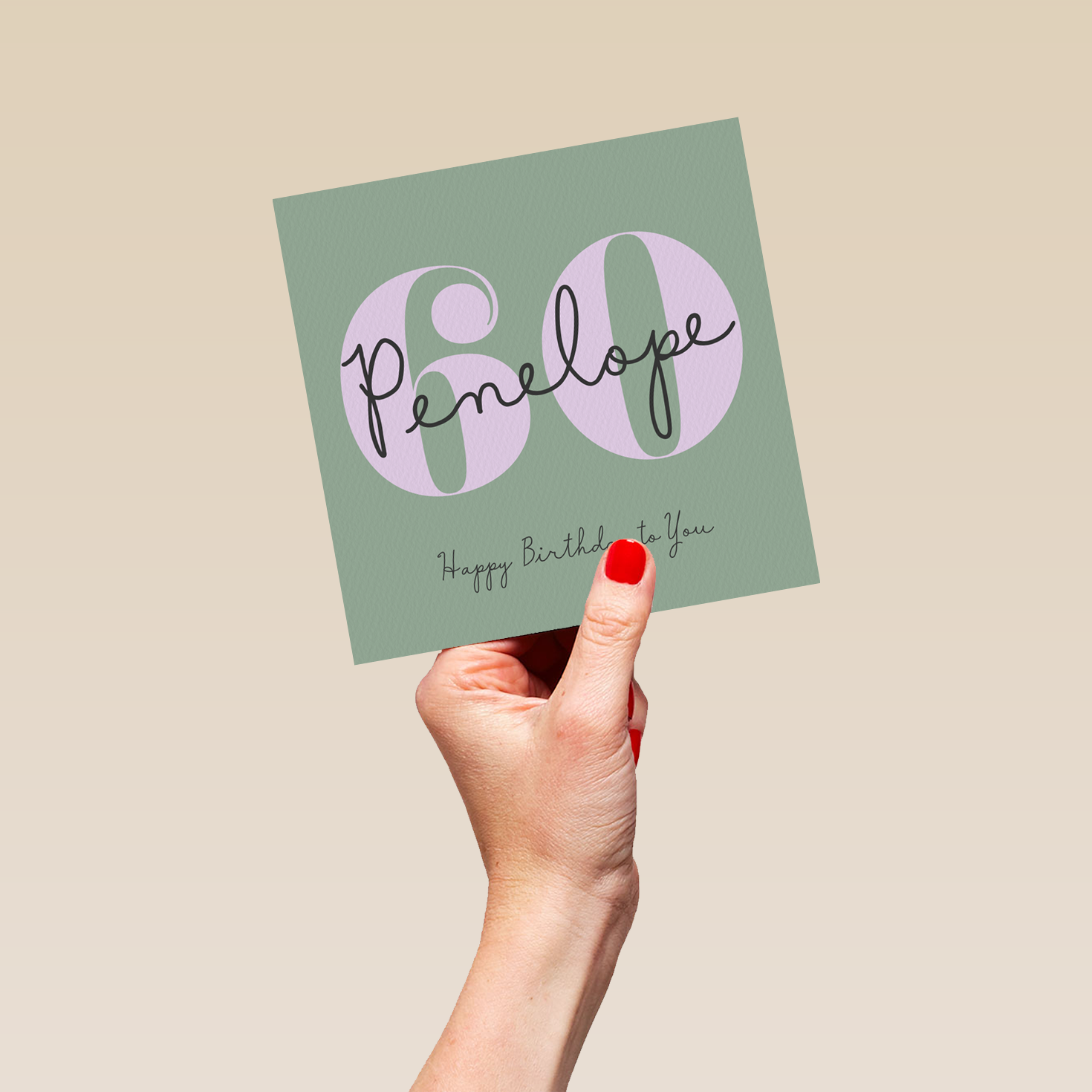 Printed on premium-quality board, this card features a large light-purple number sixty with cursive black text on a dark-green background, with the message '60 Happy Birthday To You', space to personalise a name, and comes complete with a co-ordinating white envelope.