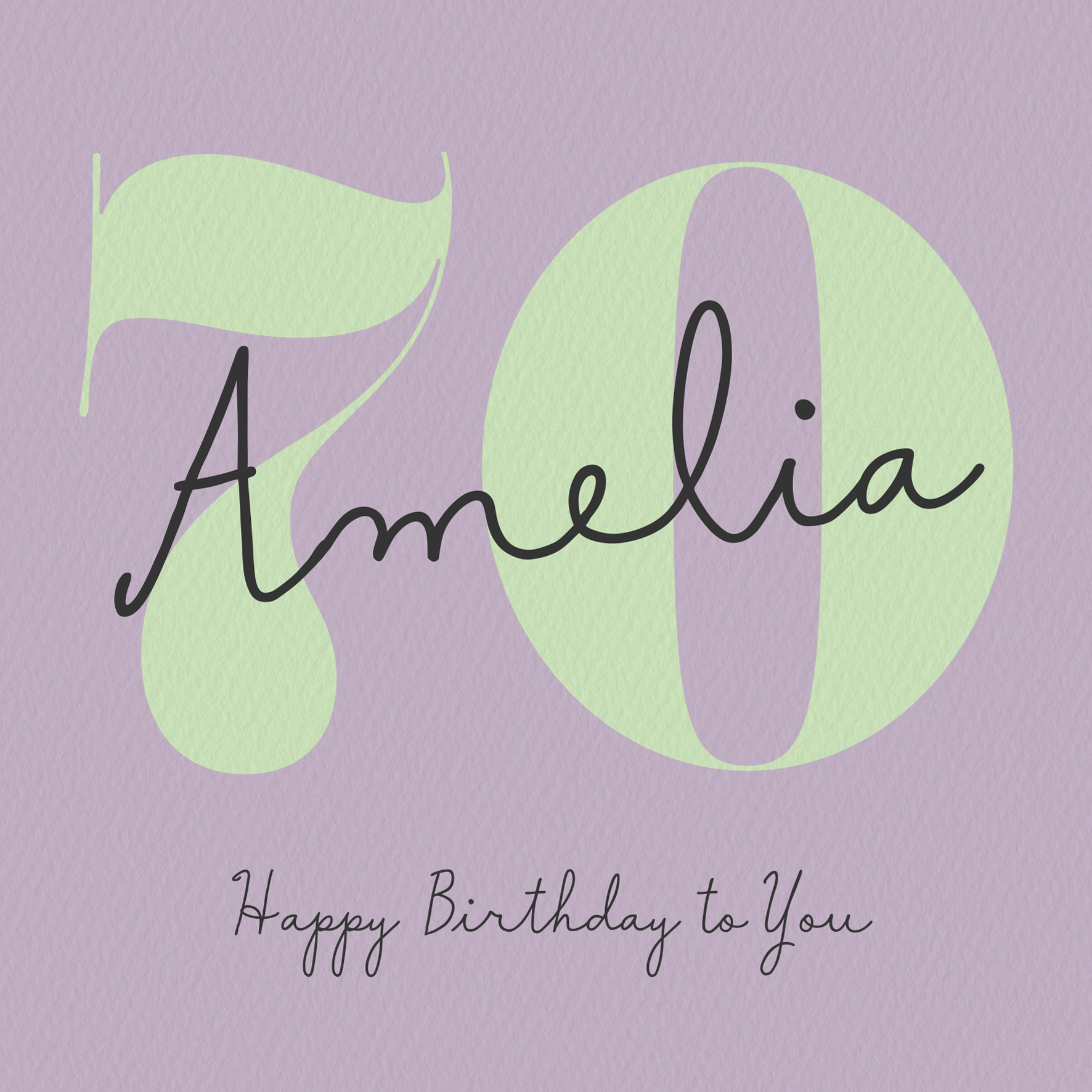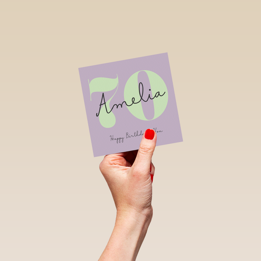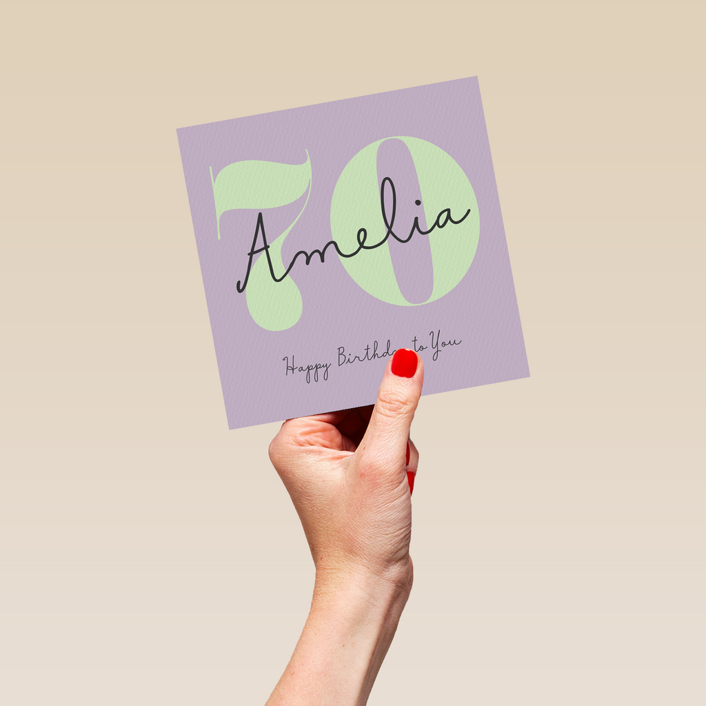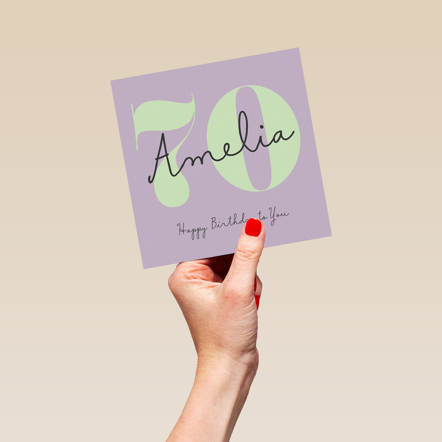 Printed on premium-quality board, this card features a large light-green number seventy with cursive black text on a light-purple background, with the message '70 Happy Birthday To You', space to personalise a name, and comes complete with a co-ordinating white envelope.