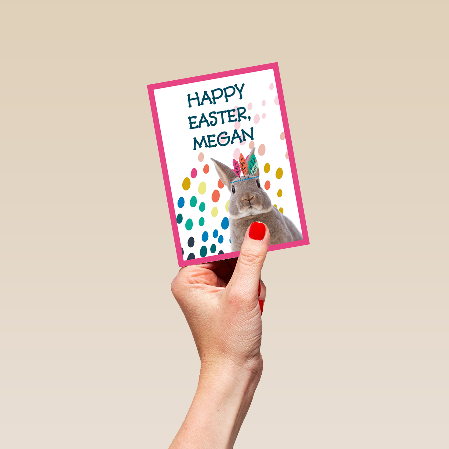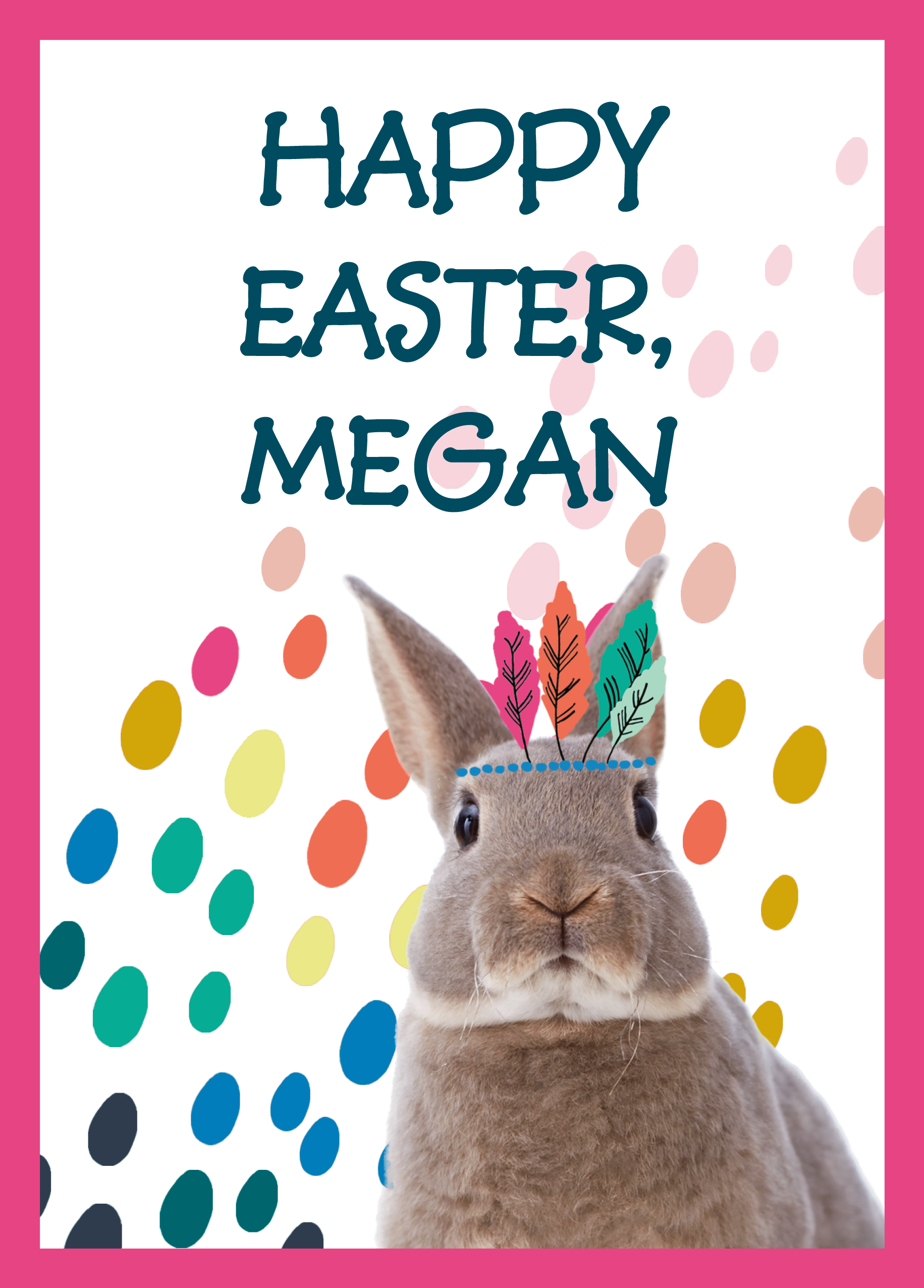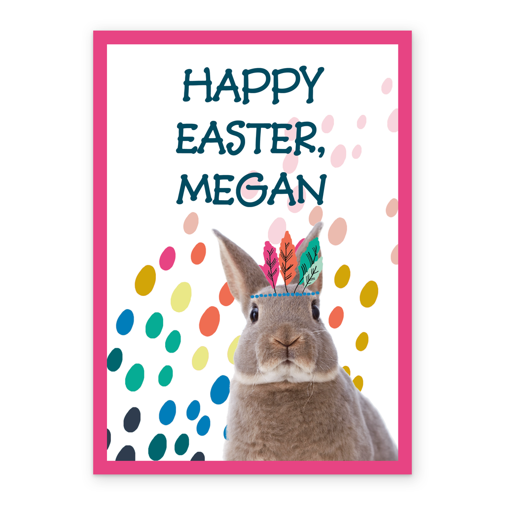Printed on premium-quality board, this card features a cute bunny wearing a colourful feather headdress, on a white background with multicoloured illustrated eggs and a pink border, with the message 'Happy Easter,', space to personalise a name, and comes complete with a co-ordinating white envelope.