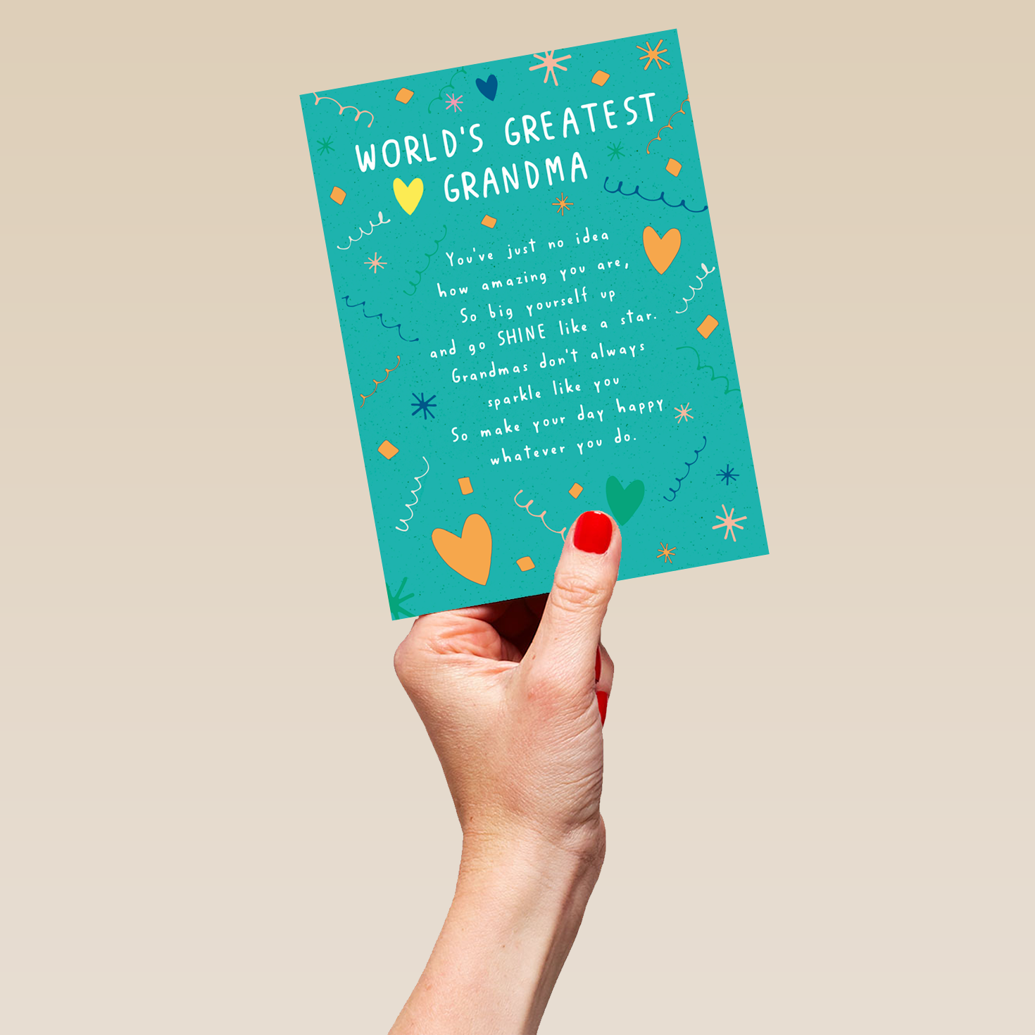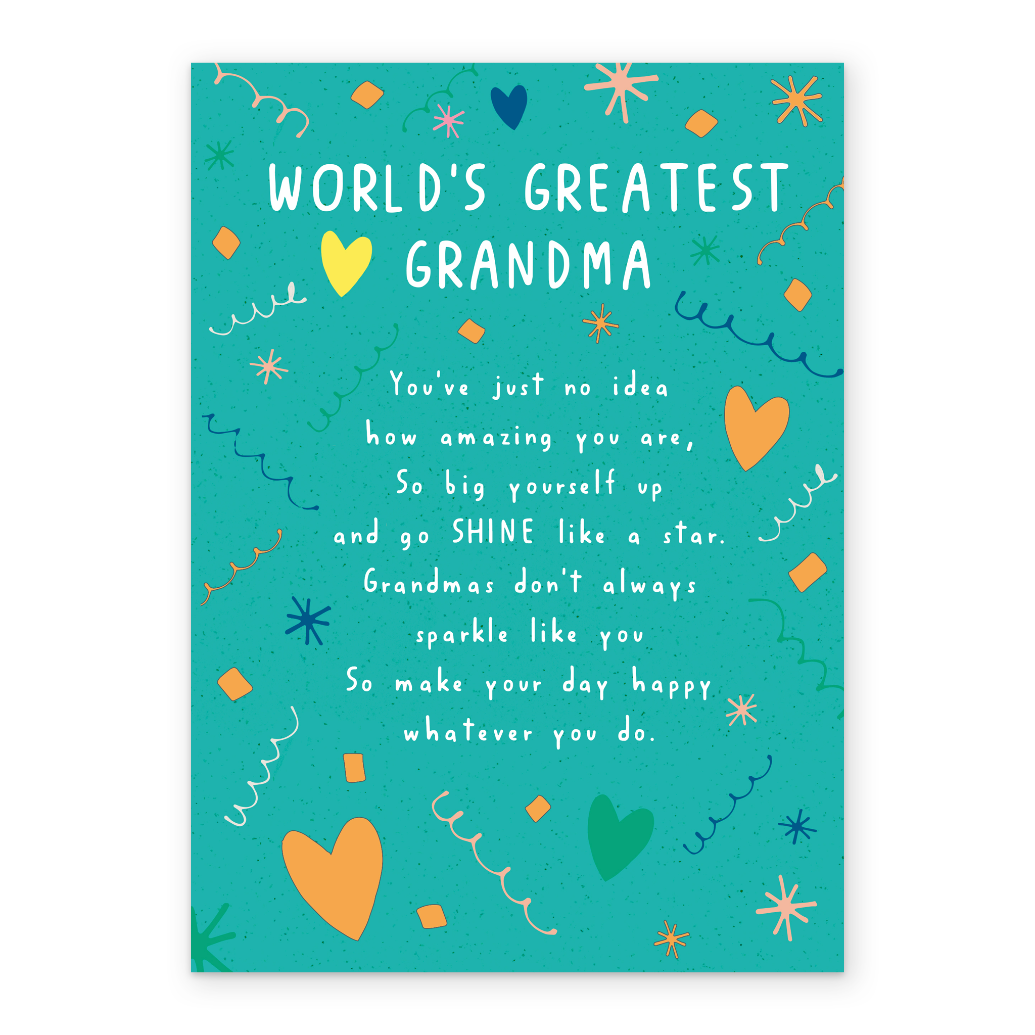 Show them you care with a personalised happy birthday grandma poem card from Hallmark. Our birthday cards are printed on premium quality, FSC®-certified card & delivered nationwide. This card is available as standard 12cm by 16.7cm and large 15.5cm by 21.6cm.