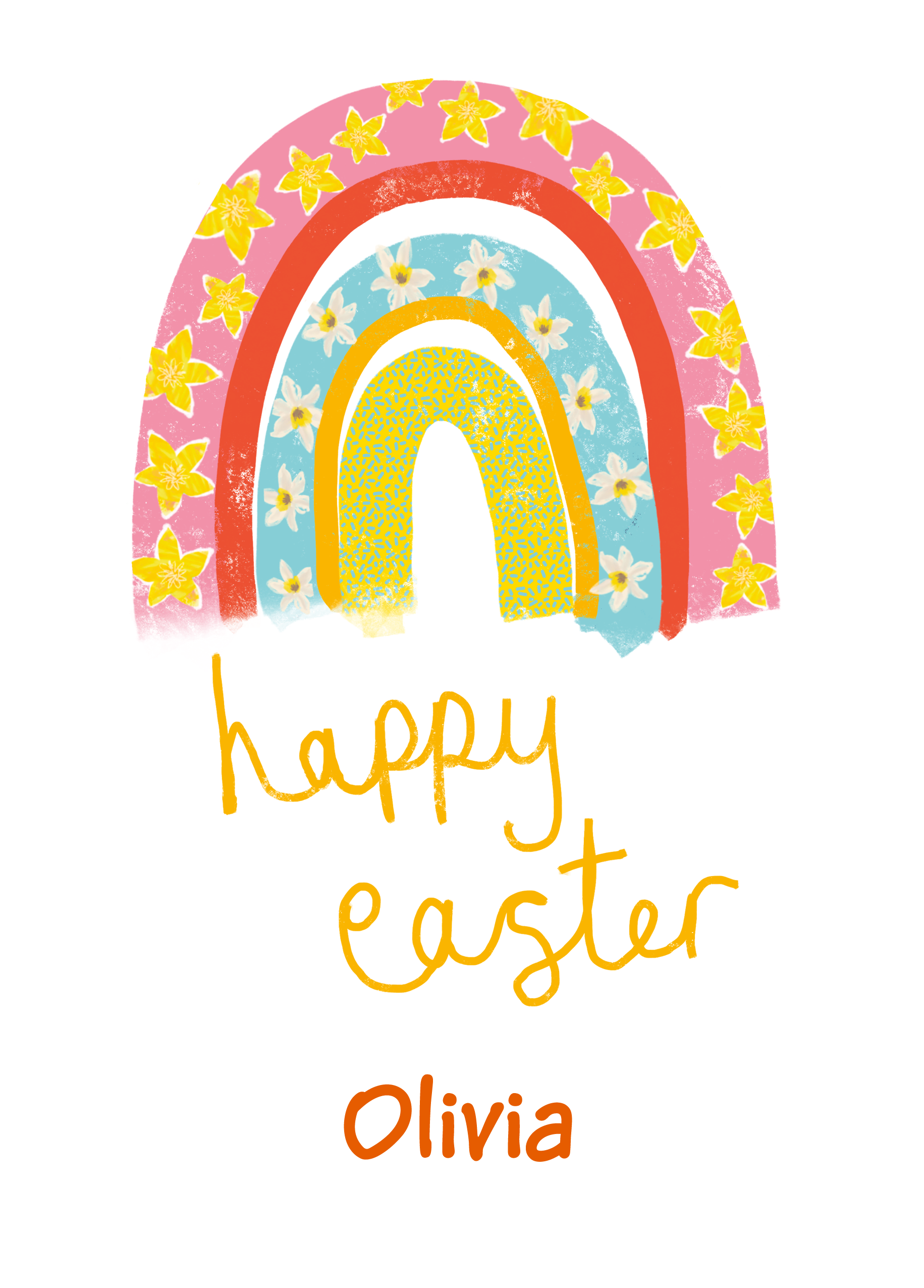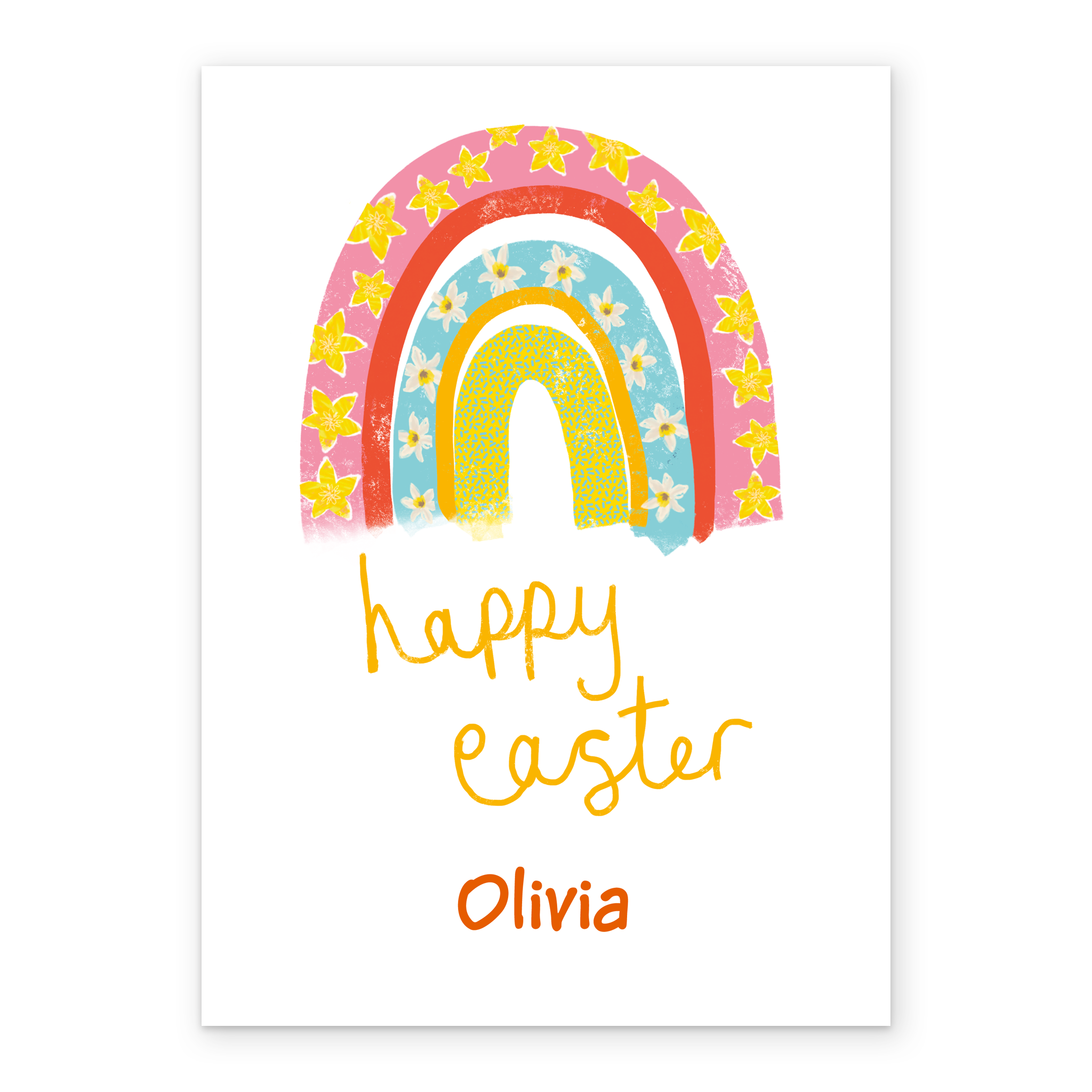 Printed on premium-quality board, this card features a brightly coloured floral pattern rainbow with contemporary styled yellow text, on a white background, with the message 'Happy Easter', space to personalise a name, and comes complete with a co-ordinating white envelope.
