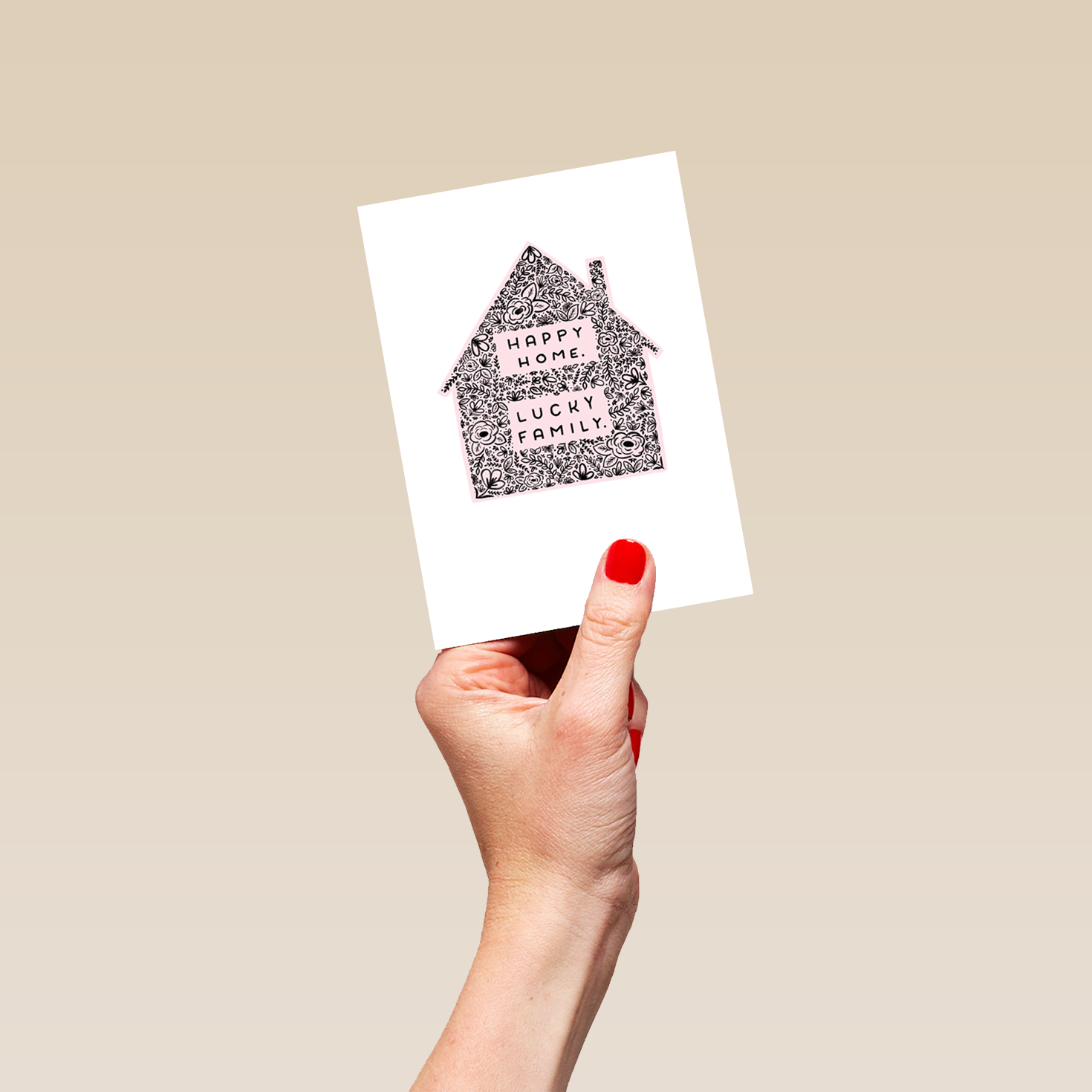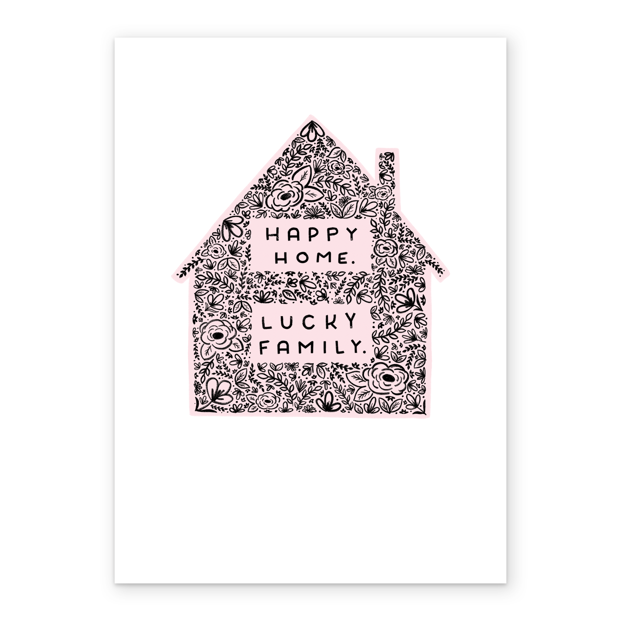 Printed on premium-quality board, this card features a plain white background with a pink and black, pattern-filled house outline in the centre, with two clear pink panels within the house outline containing simple black lettering, with the message 'Happy Home. Lucky Family', and comes complete with a co-ordinating white envelope.