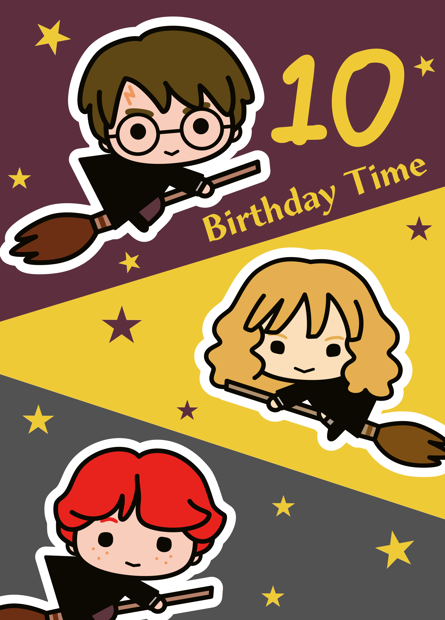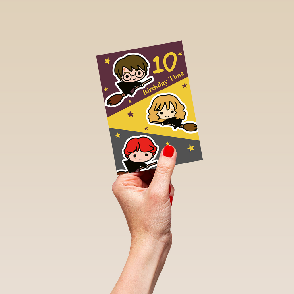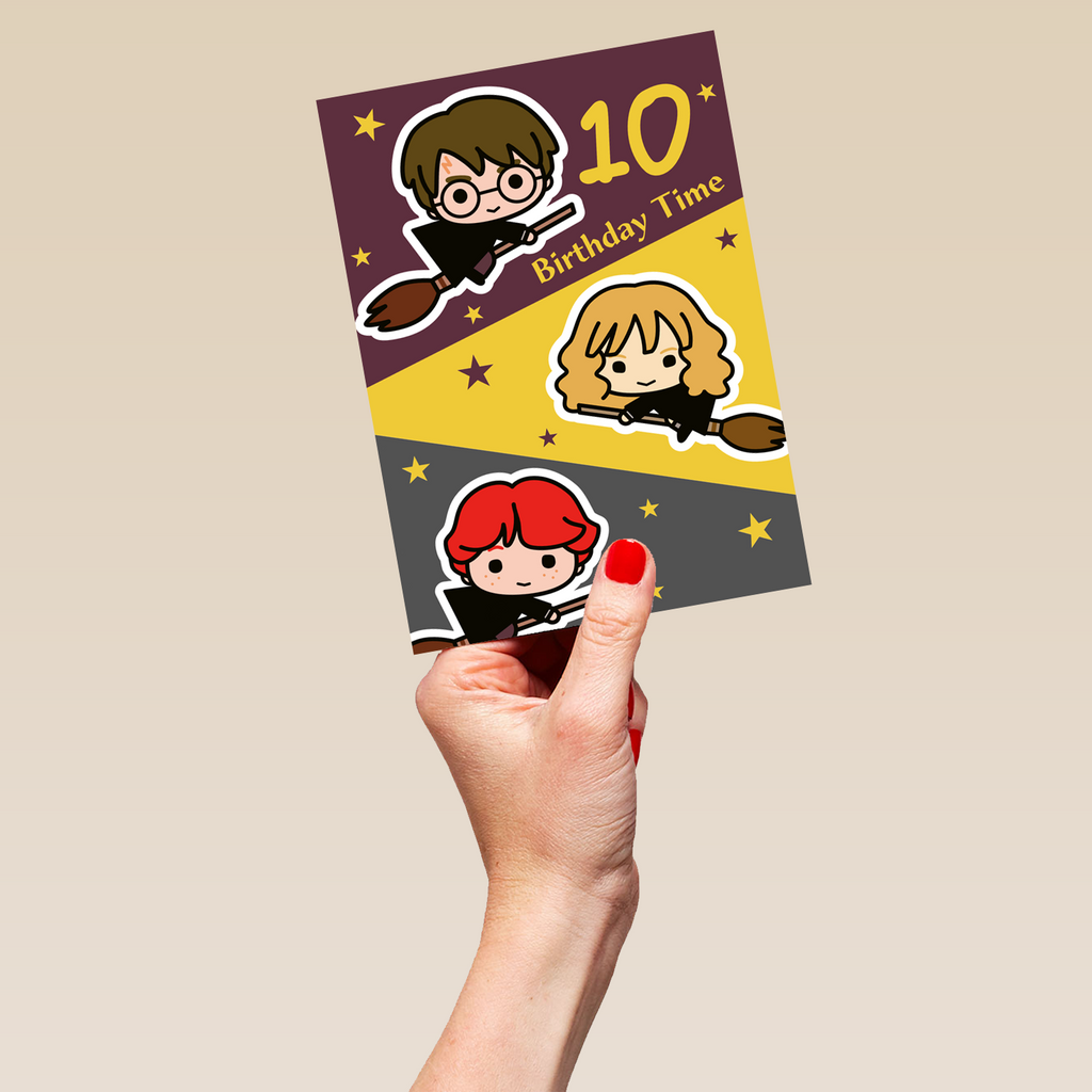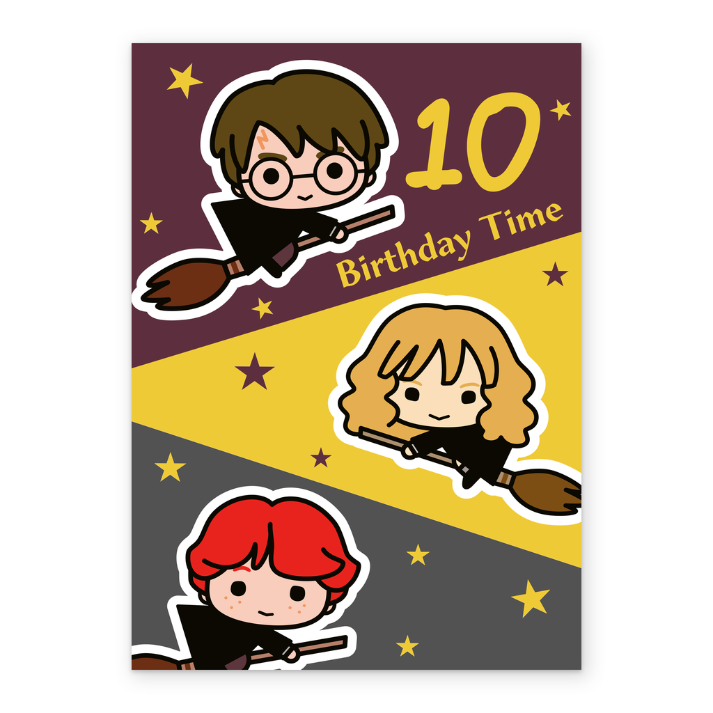 Printed on premium-quality board, this card features Harry Potter, Hermione and Ron, flying on their broomsticks on a star-adorned colourful burgundy, yellow and grey background, with the message 'Birthday Time', and comes complete with a co-ordinating white envelope.