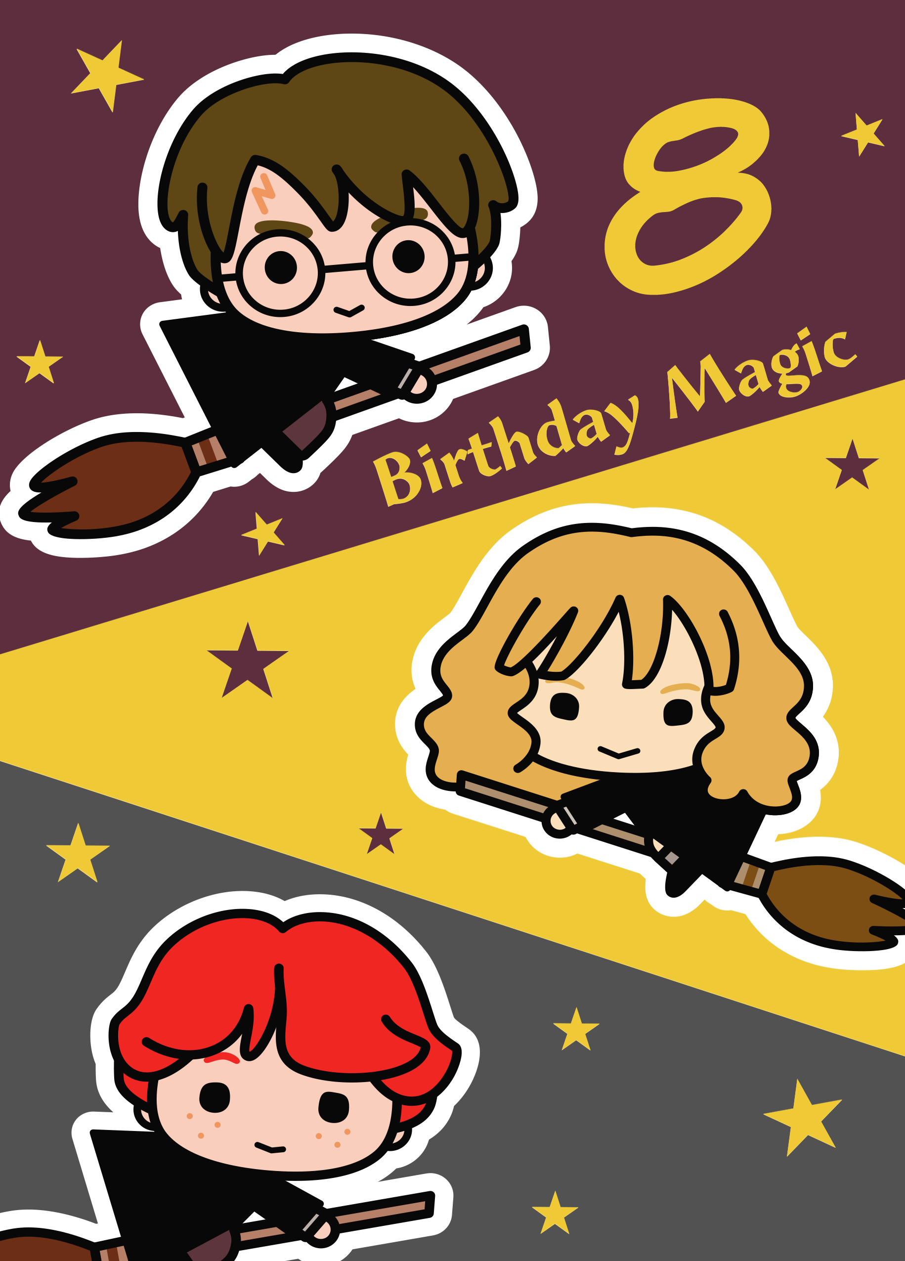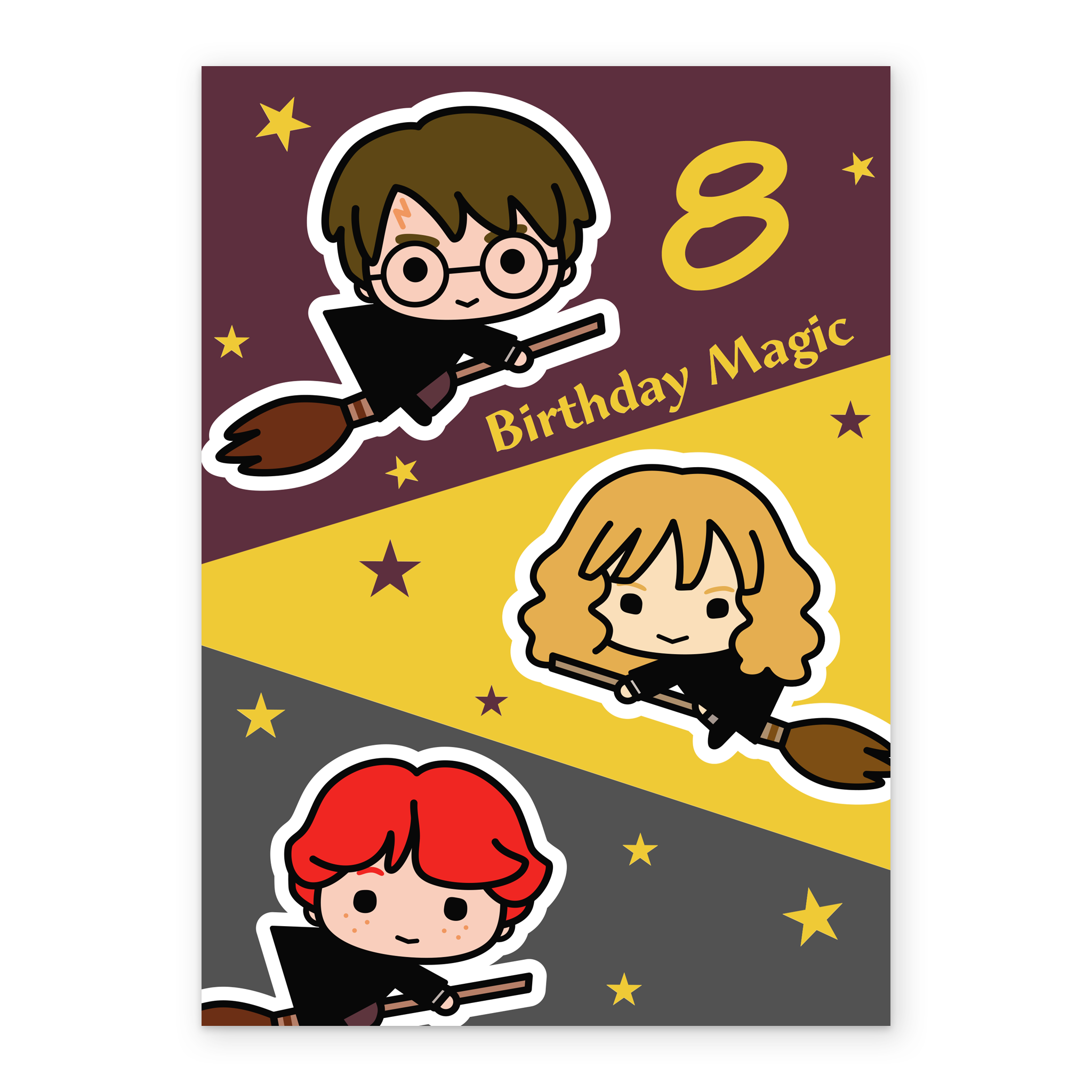 Printed on premium-quality board, this card features Harry Potter, Hermione and Ron, flying on their broomsticks on a star-adorned colourful burgundy, yellow and grey background, with the message 'Birthday Magic', and comes complete with a co-ordinating white envelope.