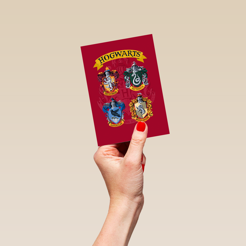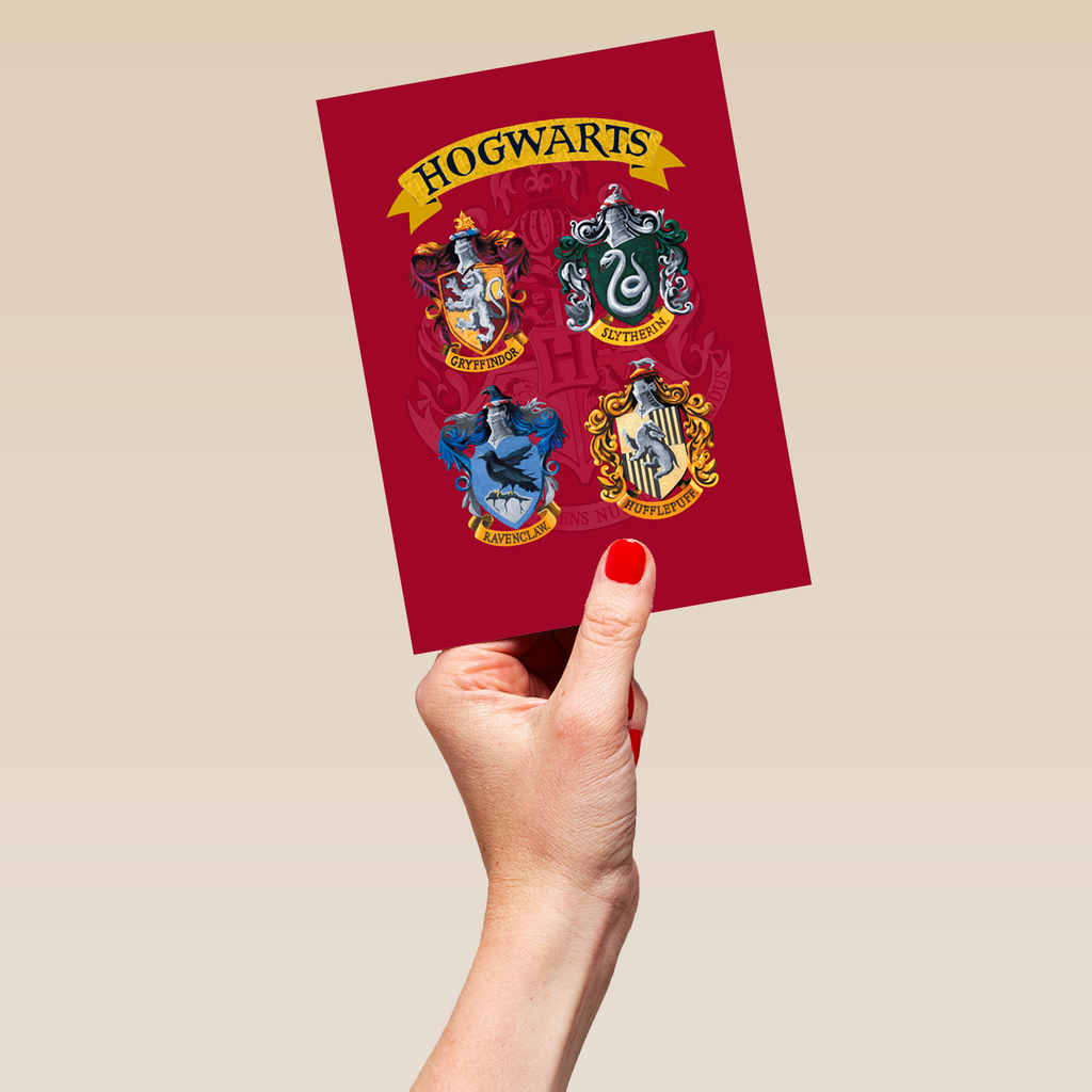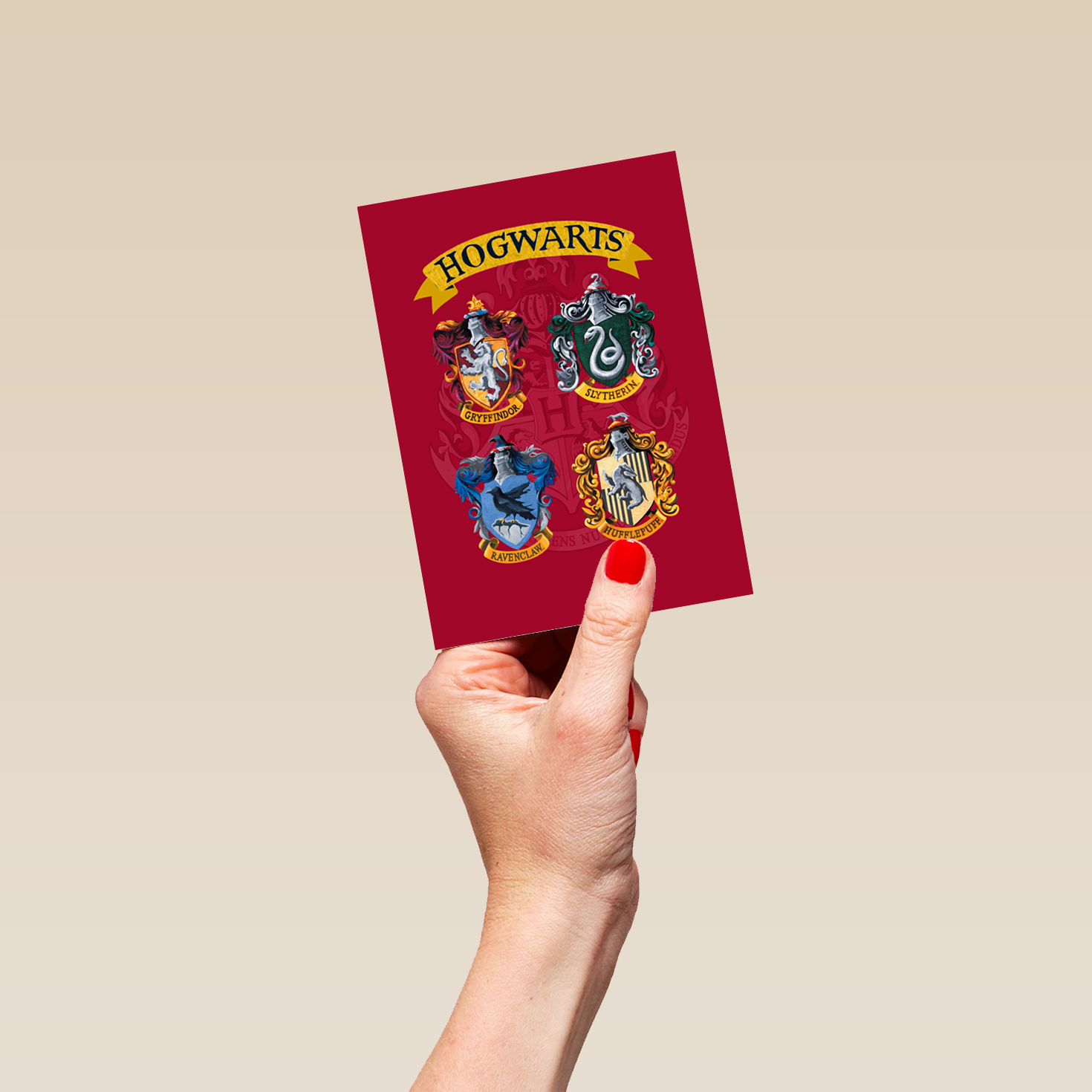 Printed on premium-quality board, this card features the 4 house badges and Hogwarts school badge, on a red background, and comes complete with a co-ordinating white envelope.
