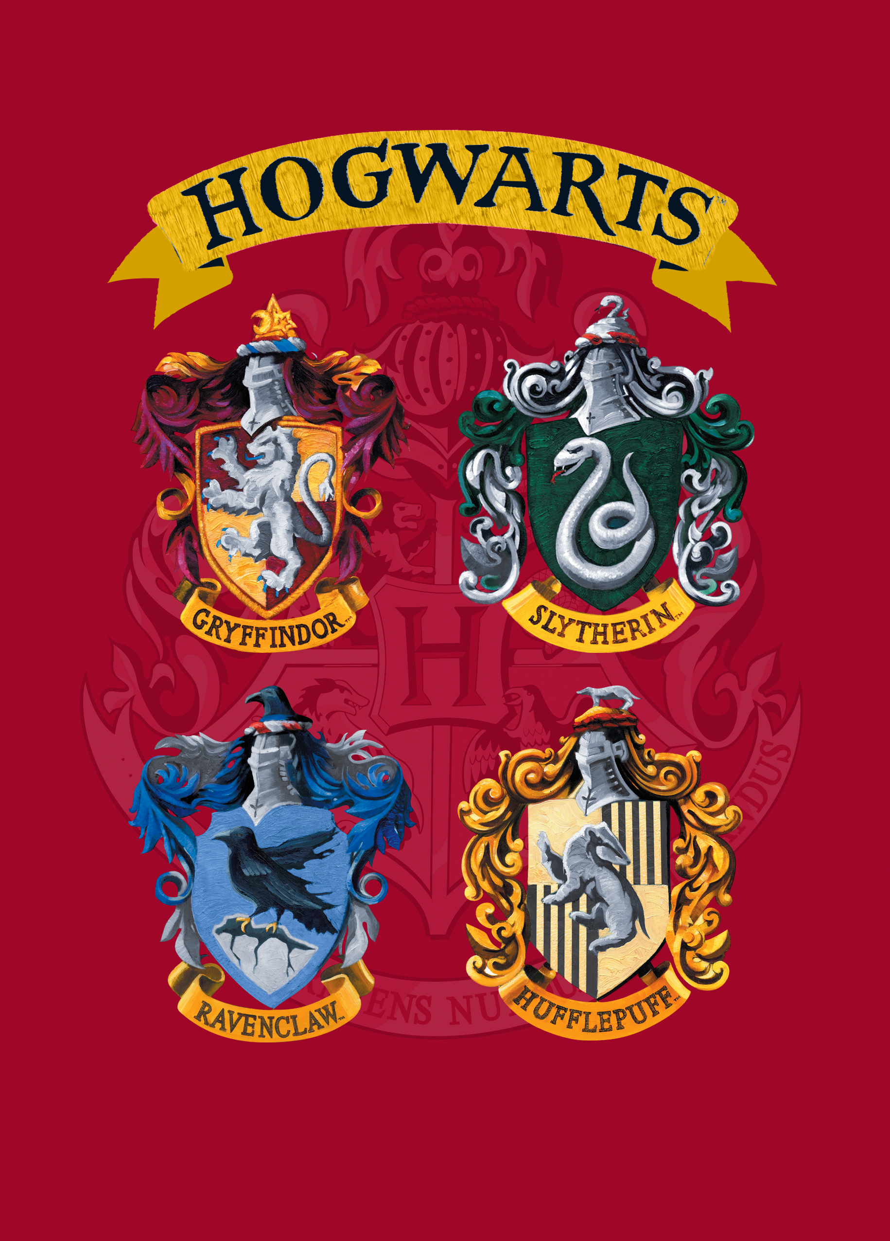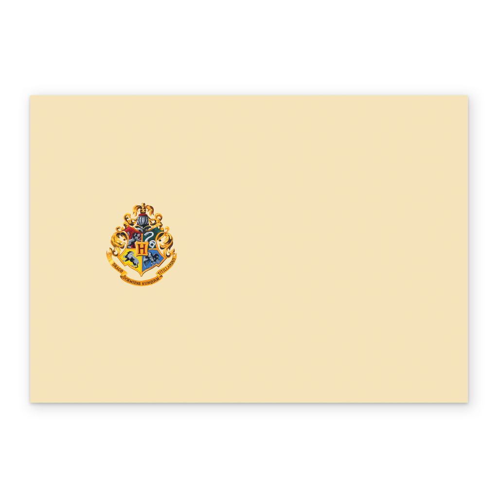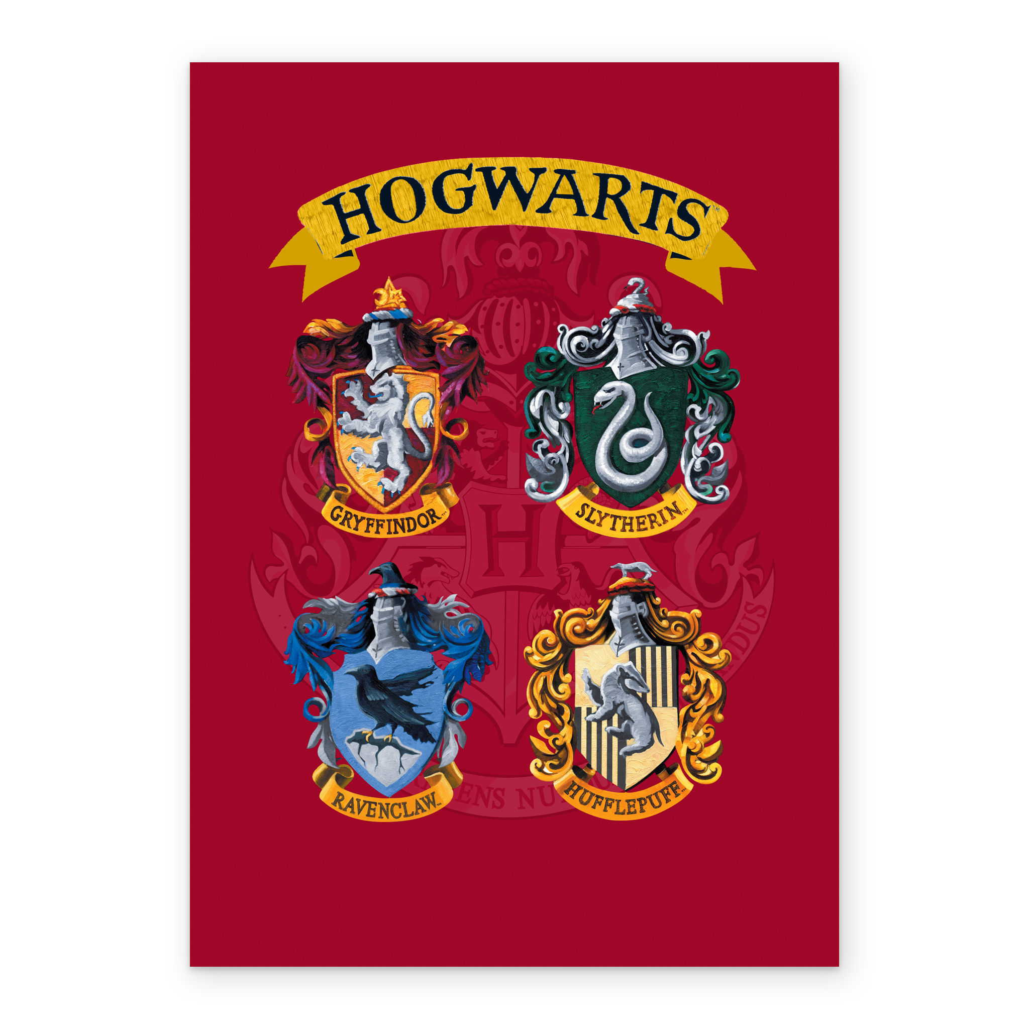 Printed on premium-quality board, this card features the 4 house badges and Hogwarts school badge, on a red background, and comes complete with a co-ordinating white envelope.