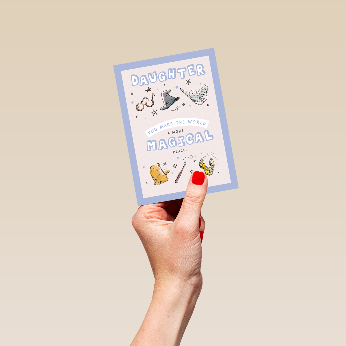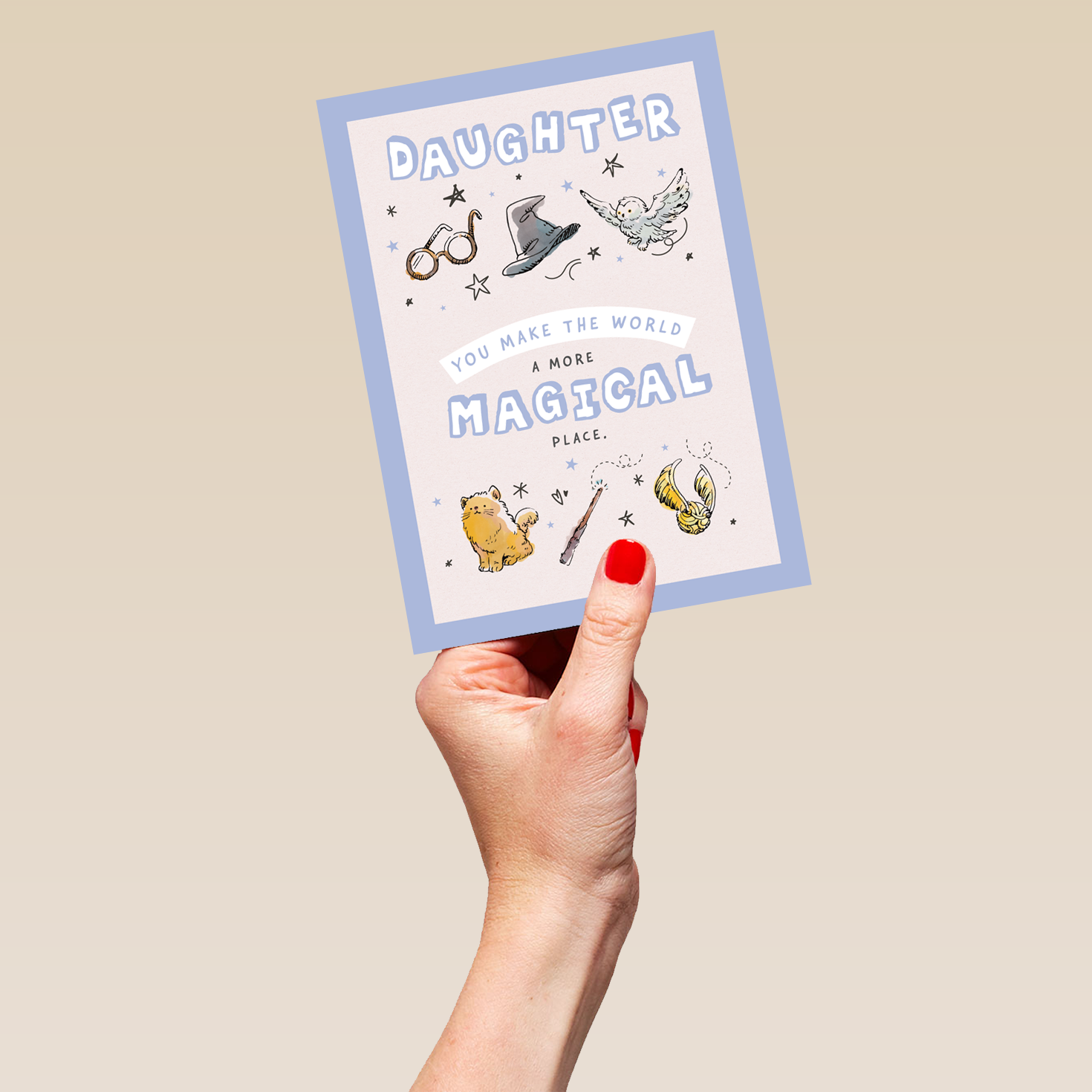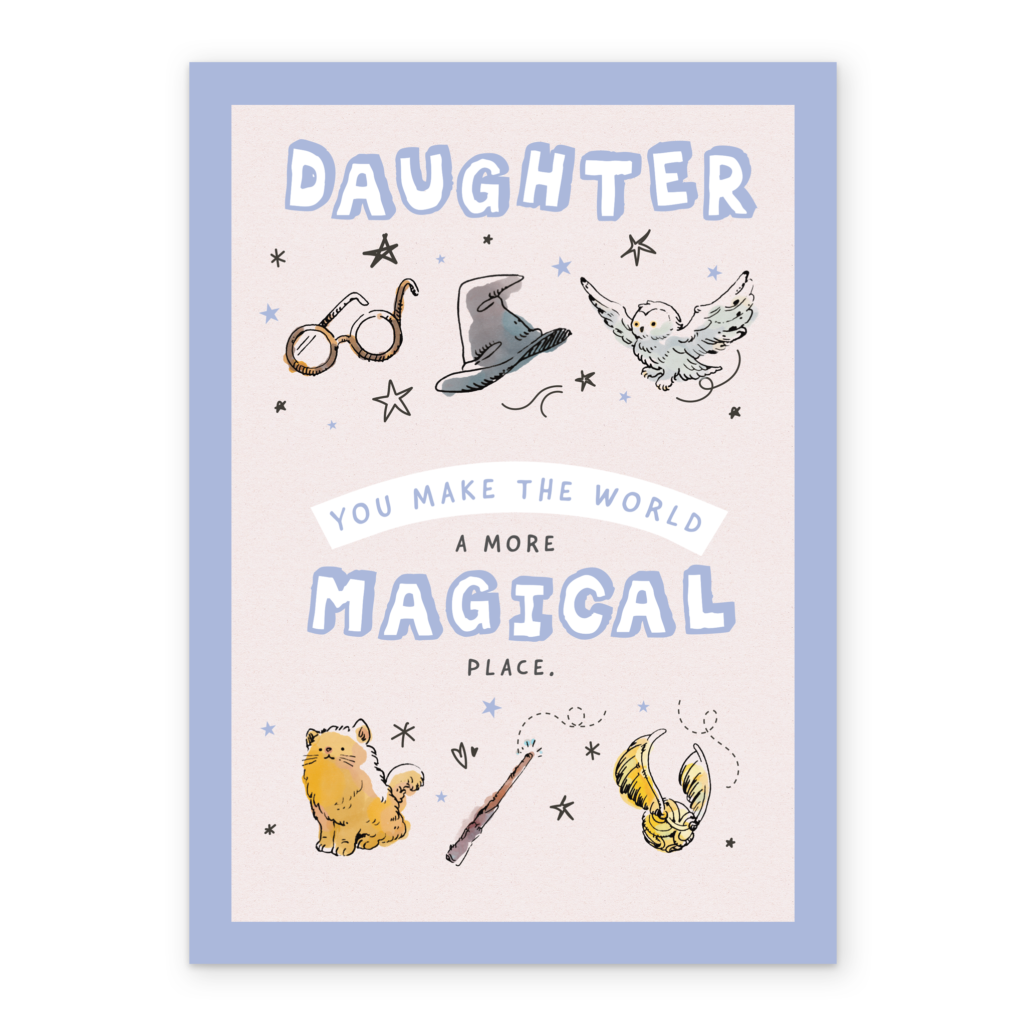 Printed on premium-quality board, this card features Harry Potter's glasses, the sorting hat, Hedwig the owl, Crookshanks the cat, a magic wand and a golden snitch, on a white background with a light blue border, with the message 'daughter you make the world a more magical place.', and comes complete with a co-ordinating white envelope.