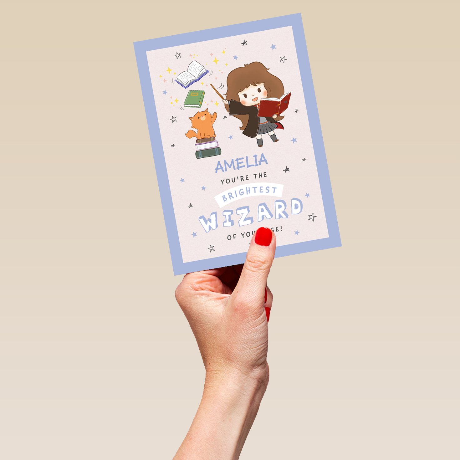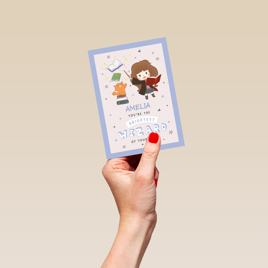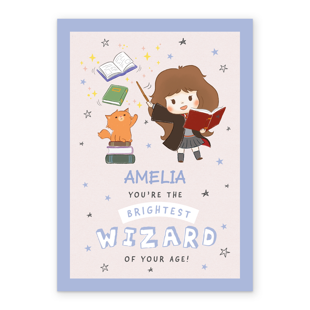 Printed on premium-quality board, this card features Hermione Granger, from Harry Potter, casting some special birthday magic spells with Crookshanks the cat, on a white background adorned with stars and a light blue border, with the message 'You're the brightest wizard of your age!', space to personalise a name, and comes complete with a co-ordinating white envelope.