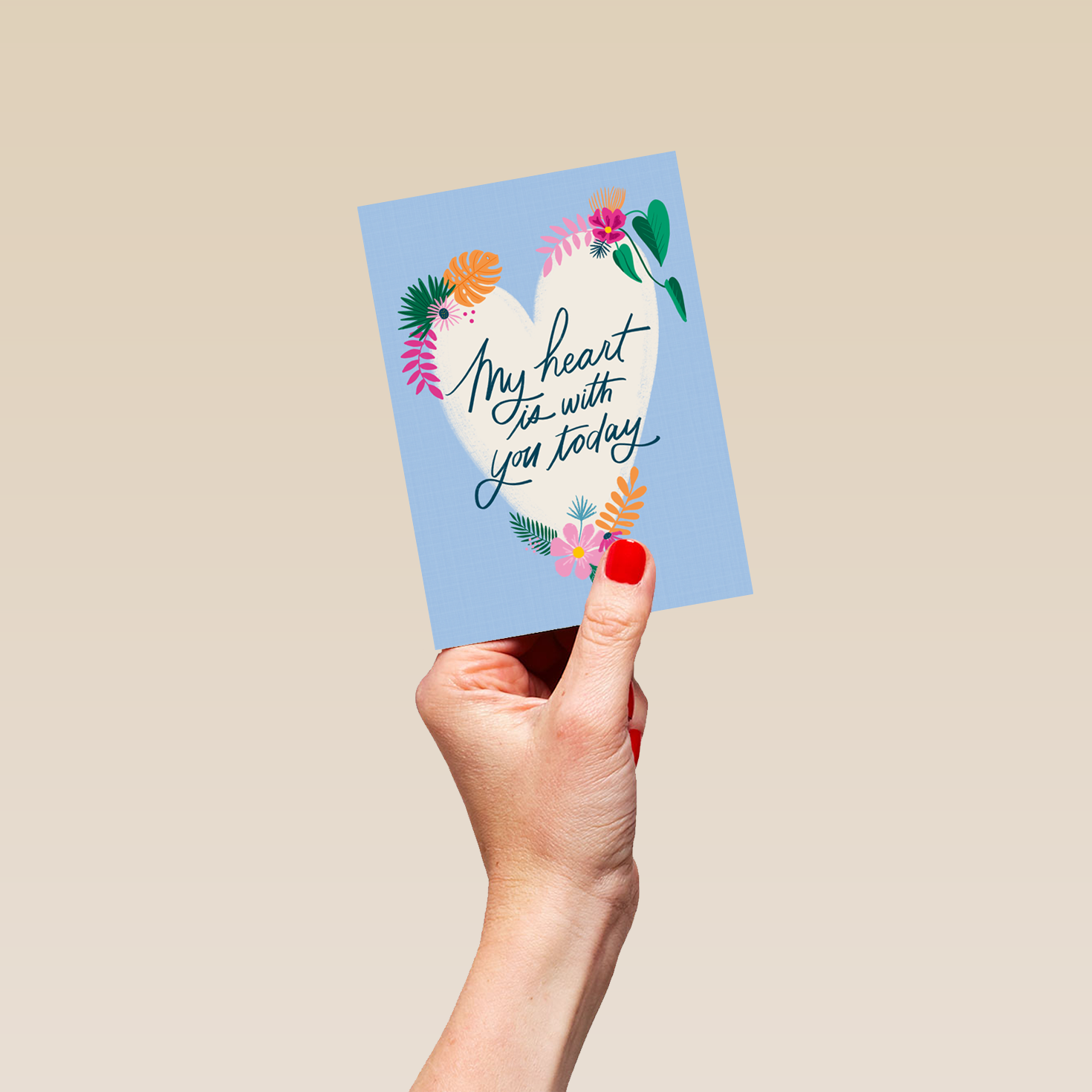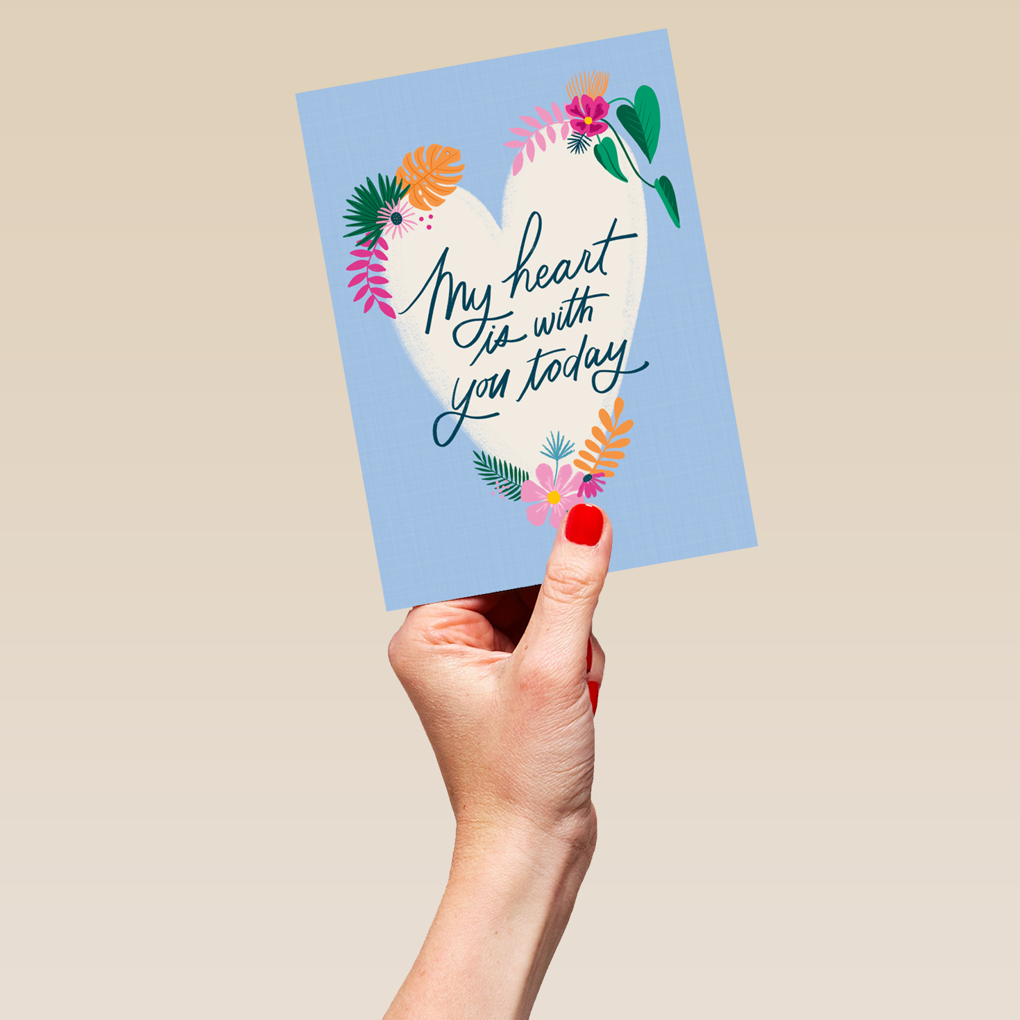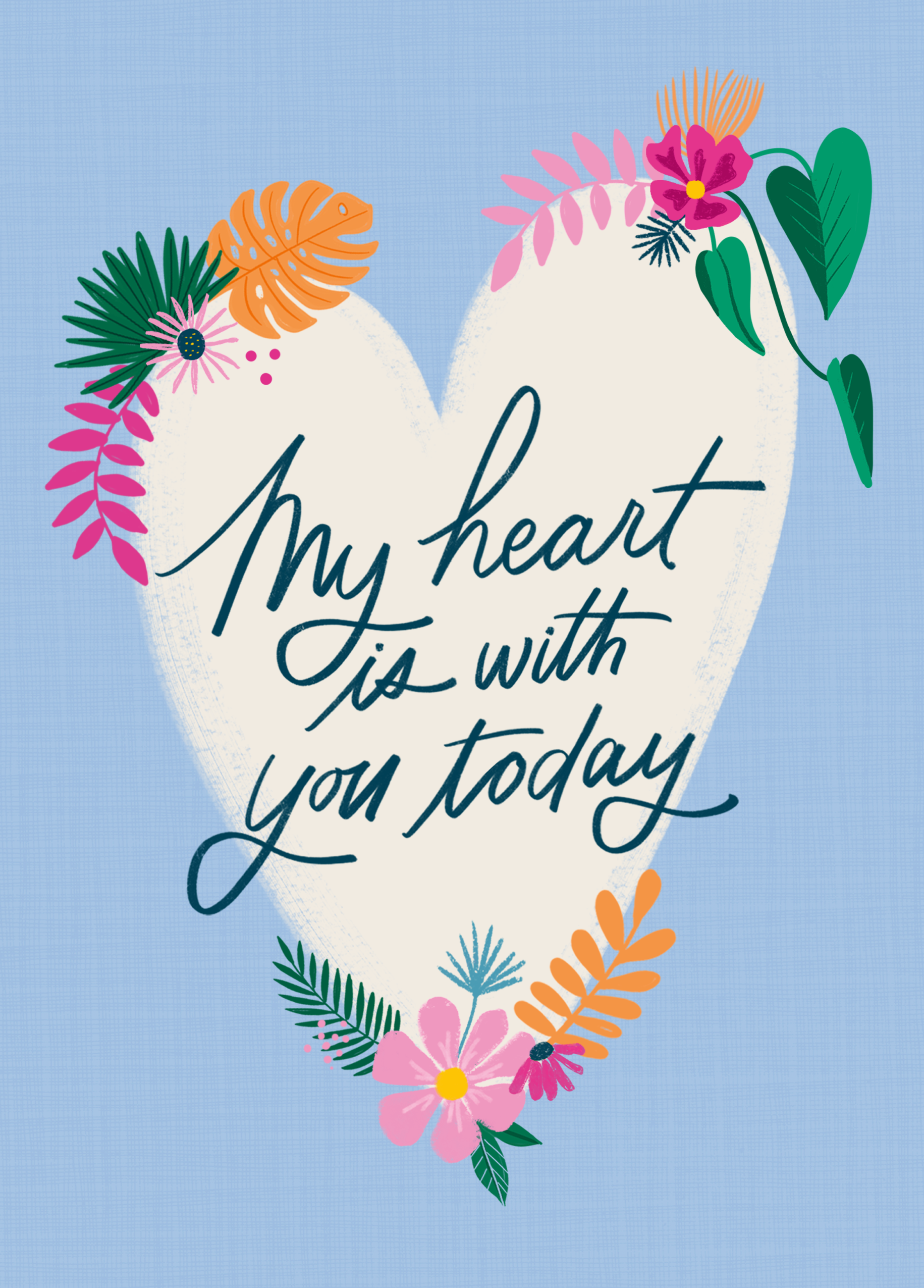Printed on premium-quality board, this card features a heart with florals and typography word art, with the message 'My heart is with you today', and comes complete with a co-ordinating white envelope.
